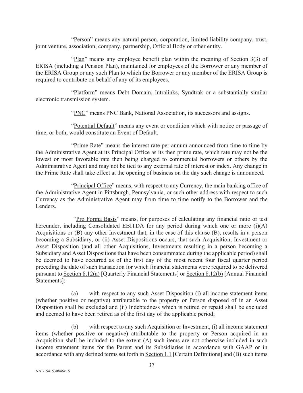 NAI-1541530846v16 37 “Person” means any natural person, corporation, limited liability company, trust, joint venture, association, company, partnership, Official Body or other entity. “Plan” means any employee benefit plan within the meaning of Section 3(3) of ERISA (including a Pension Plan), maintained for employees of the Borrower or any member of the ERISA Group or any such Plan to which the Borrower or any member of the ERISA Group is required to contribute on behalf of any of its employees. “Platform” means Debt Domain, Intralinks, Syndtrak or a substantially similar electronic transmission system. “PNC” means PNC Bank, National Association, its successors and assigns. “Potential Default” means any event or condition which with notice or passage of time, or both, would constitute an Event of Default. “Prime Rate” means the interest rate per annum announced from time to time by the Administrative Agent at its Principal Office as its then prime rate, which rate may not be the lowest or most favorable rate then being charged to commercial borrowers or others by the Administrative Agent and may not be tied to any external rate of interest or index. Any change in the Prime Rate shall take effect at the opening of business on the day such change is announced. “Principal Office” means, with respect to any Currency, the main banking office of the Administrative Agent in Pittsburgh, Pennsylvania, or such other address with respect to such Currency as the Administrative Agent may from time to time notify to the Borrower and the Lenders. “Pro Forma Basis” means, for purposes of calculating any financial ratio or test hereunder, including Consolidated EBITDA for any period during which one or more (i)(A) Acquisitions or (B) any other Investment that, in the case of this clause (B), results in a person becoming a Subsidiary, or (ii) Asset Dispositions occurs, that such Acquisition, Investment or Asset Disposition (and all other Acquisitions, Investments resulting in a person becoming a Subsidiary and Asset Dispositions that have been consummated during the applicable period) shall be deemed to have occurred as of the first day of the most recent four fiscal quarter period preceding the date of such transaction for which financial statements were required to be delivered pursuant to Section 8.12(a) [Quarterly Financial Statements] or Section 8.12(b) [Annual Financial Statements]: (a) with respect to any such Asset Disposition (i) all income statement items (whether positive or negative) attributable to the property or Person disposed of in an Asset Disposition shall be excluded and (ii) Indebtedness which is retired or repaid shall be excluded and deemed to have been retired as of the first day of the applicable period; (b) with respect to any such Acquisition or Investment, (i) all income statement items (whether positive or negative) attributable to the property or Person acquired in an Acquisition shall be included to the extent (A) such items are not otherwise included in such income statement items for the Parent and its Subsidiaries in accordance with GAAP or in accordance with any defined terms set forth in Section 1.1 [Certain Definitions] and (B) such items