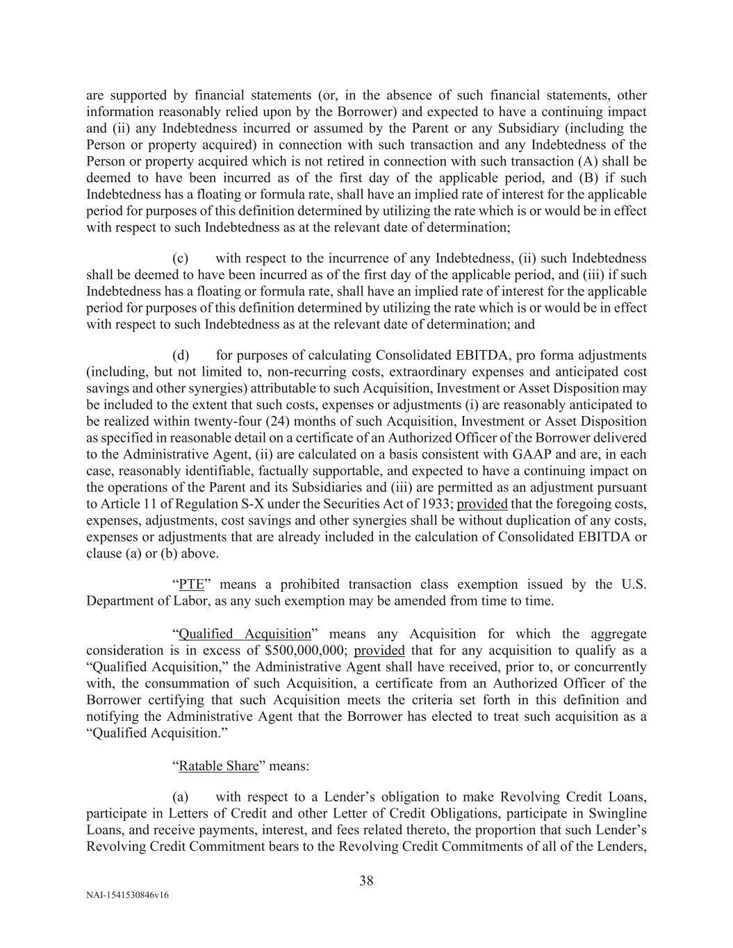 NAI-1541530846v16 38 are supported by financial statements (or, in the absence of such financial statements, other information reasonably relied upon by the Borrower) and expected to have a continuing impact and (ii) any Indebtedness incurred or assumed by the Parent or any Subsidiary (including the Person or property acquired) in connection with such transaction and any Indebtedness of the Person or property acquired which is not retired in connection with such transaction (A) shall be deemed to have been incurred as of the first day of the applicable period, and (B) if such Indebtedness has a floating or formula rate, shall have an implied rate of interest for the applicable period for purposes of this definition determined by utilizing the rate which is or would be in effect with respect to such Indebtedness as at the relevant date of determination; (c) with respect to the incurrence of any Indebtedness, (ii) such Indebtedness shall be deemed to have been incurred as of the first day of the applicable period, and (iii) if such Indebtedness has a floating or formula rate, shall have an implied rate of interest for the applicable period for purposes of this definition determined by utilizing the rate which is or would be in effect with respect to such Indebtedness as at the relevant date of determination; and (d) for purposes of calculating Consolidated EBITDA, pro forma adjustments (including, but not limited to, non-recurring costs, extraordinary expenses and anticipated cost savings and other synergies) attributable to such Acquisition, Investment or Asset Disposition may be included to the extent that such costs, expenses or adjustments (i) are reasonably anticipated to be realized within twenty-four (24) months of such Acquisition, Investment or Asset Disposition as specified in reasonable detail on a certificate of an Authorized Officer of the Borrower delivered to the Administrative Agent, (ii) are calculated on a basis consistent with GAAP and are, in each case, reasonably identifiable, factually supportable, and expected to have a continuing impact on the operations of the Parent and its Subsidiaries and (iii) are permitted as an adjustment pursuant to Article 11 of Regulation S-X under the Securities Act of 1933; provided that the foregoing costs, expenses, adjustments, cost savings and other synergies shall be without duplication of any costs, expenses or adjustments that are already included in the calculation of Consolidated EBITDA or clause (a) or (b) above. “PTE” means a prohibited transaction class exemption issued by the U.S. Department of Labor, as any such exemption may be amended from time to time. “Qualified Acquisition” means any Acquisition for which the aggregate consideration is in excess of $500,000,000; provided that for any acquisition to qualify as a “Qualified Acquisition,” the Administrative Agent shall have received, prior to, or concurrently with, the consummation of such Acquisition, a certificate from an Authorized Officer of the Borrower certifying that such Acquisition meets the criteria set forth in this definition and notifying the Administrative Agent that the Borrower has elected to treat such acquisition as a “Qualified Acquisition.” “Ratable Share” means: (a) with respect to a Lender’s obligation to make Revolving Credit Loans, participate in Letters of Credit and other Letter of Credit Obligations, participate in Swingline Loans, and receive payments, interest, and fees related thereto, the proportion that such Lender’s Revolving Credit Commitment bears to the Revolving Credit Commitments of all of the Lenders,