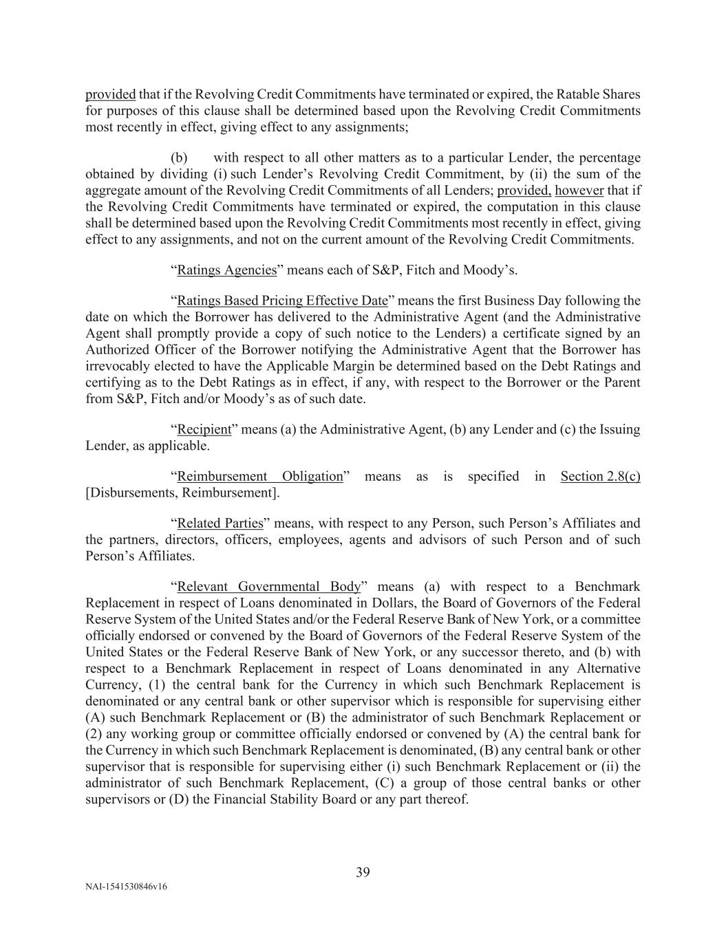 NAI-1541530846v16 39 provided that if the Revolving Credit Commitments have terminated or expired, the Ratable Shares for purposes of this clause shall be determined based upon the Revolving Credit Commitments most recently in effect, giving effect to any assignments; (b) with respect to all other matters as to a particular Lender, the percentage obtained by dividing (i) such Lender’s Revolving Credit Commitment, by (ii) the sum of the aggregate amount of the Revolving Credit Commitments of all Lenders; provided, however that if the Revolving Credit Commitments have terminated or expired, the computation in this clause shall be determined based upon the Revolving Credit Commitments most recently in effect, giving effect to any assignments, and not on the current amount of the Revolving Credit Commitments. “Ratings Agencies” means each of S&P, Fitch and Moody’s. “Ratings Based Pricing Effective Date” means the first Business Day following the date on which the Borrower has delivered to the Administrative Agent (and the Administrative Agent shall promptly provide a copy of such notice to the Lenders) a certificate signed by an Authorized Officer of the Borrower notifying the Administrative Agent that the Borrower has irrevocably elected to have the Applicable Margin be determined based on the Debt Ratings and certifying as to the Debt Ratings as in effect, if any, with respect to the Borrower or the Parent from S&P, Fitch and/or Moody’s as of such date. “Recipient” means (a) the Administrative Agent, (b) any Lender and (c) the Issuing Lender, as applicable. “Reimbursement Obligation” means as is specified in Section 2.8(c) [Disbursements, Reimbursement]. “Related Parties” means, with respect to any Person, such Person’s Affiliates and the partners, directors, officers, employees, agents and advisors of such Person and of such Person’s Affiliates. “Relevant Governmental Body” means (a) with respect to a Benchmark Replacement in respect of Loans denominated in Dollars, the Board of Governors of the Federal Reserve System of the United States and/or the Federal Reserve Bank of New York, or a committee officially endorsed or convened by the Board of Governors of the Federal Reserve System of the United States or the Federal Reserve Bank of New York, or any successor thereto, and (b) with respect to a Benchmark Replacement in respect of Loans denominated in any Alternative Currency, (1) the central bank for the Currency in which such Benchmark Replacement is denominated or any central bank or other supervisor which is responsible for supervising either (A) such Benchmark Replacement or (B) the administrator of such Benchmark Replacement or (2) any working group or committee officially endorsed or convened by (A) the central bank for the Currency in which such Benchmark Replacement is denominated, (B) any central bank or other supervisor that is responsible for supervising either (i) such Benchmark Replacement or (ii) the administrator of such Benchmark Replacement, (C) a group of those central banks or other supervisors or (D) the Financial Stability Board or any part thereof.