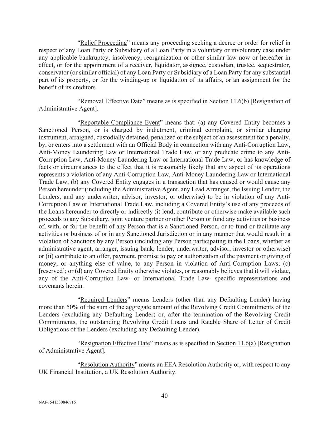 NAI-1541530846v16 40 “Relief Proceeding” means any proceeding seeking a decree or order for relief in respect of any Loan Party or Subsidiary of a Loan Party in a voluntary or involuntary case under any applicable bankruptcy, insolvency, reorganization or other similar law now or hereafter in effect, or for the appointment of a receiver, liquidator, assignee, custodian, trustee, sequestrator, conservator (or similar official) of any Loan Party or Subsidiary of a Loan Party for any substantial part of its property, or for the winding-up or liquidation of its affairs, or an assignment for the benefit of its creditors. “Removal Effective Date” means as is specified in Section 11.6(b) [Resignation of Administrative Agent]. “Reportable Compliance Event” means that: (a) any Covered Entity becomes a Sanctioned Person, or is charged by indictment, criminal complaint, or similar charging instrument, arraigned, custodially detained, penalized or the subject of an assessment for a penalty, by, or enters into a settlement with an Official Body in connection with any Anti-Corruption Law, Anti-Money Laundering Law or International Trade Law, or any predicate crime to any Anti- Corruption Law, Anti-Money Laundering Law or International Trade Law, or has knowledge of facts or circumstances to the effect that it is reasonably likely that any aspect of its operations represents a violation of any Anti-Corruption Law, Anti-Money Laundering Law or International Trade Law; (b) any Covered Entity engages in a transaction that has caused or would cause any Person hereunder (including the Administrative Agent, any Lead Arranger, the Issuing Lender, the Lenders, and any underwriter, advisor, investor, or otherwise) to be in violation of any Anti- Corruption Law or International Trade Law, including a Covered Entity’s use of any proceeds of the Loans hereunder to directly or indirectly (i) lend, contribute or otherwise make available such proceeds to any Subsidiary, joint venture partner or other Person or fund any activities or business of, with, or for the benefit of any Person that is a Sanctioned Person, or to fund or facilitate any activities or business of or in any Sanctioned Jurisdiction or in any manner that would result in a violation of Sanctions by any Person (including any Person participating in the Loans, whether as administrative agent, arranger, issuing bank, lender, underwriter, advisor, investor or otherwise) or (ii) contribute to an offer, payment, promise to pay or authorization of the payment or giving of money, or anything else of value, to any Person in violation of Anti-Corruption Laws; (c) [reserved]; or (d) any Covered Entity otherwise violates, or reasonably believes that it will violate, any of the Anti-Corruption Law- or International Trade Law- specific representations and covenants herein. “Required Lenders” means Lenders (other than any Defaulting Lender) having more than 50% of the sum of the aggregate amount of the Revolving Credit Commitments of the Lenders (excluding any Defaulting Lender) or, after the termination of the Revolving Credit Commitments, the outstanding Revolving Credit Loans and Ratable Share of Letter of Credit Obligations of the Lenders (excluding any Defaulting Lender). “Resignation Effective Date” means as is specified in Section 11.6(a) [Resignation of Administrative Agent]. “Resolution Authority” means an EEA Resolution Authority or, with respect to any UK Financial Institution, a UK Resolution Authority.