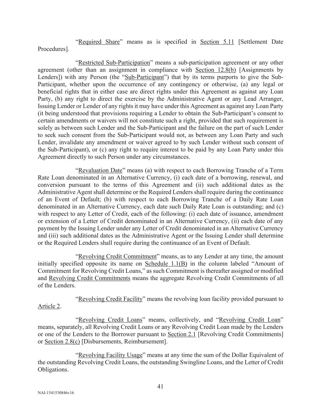 NAI-1541530846v16 41 “Required Share” means as is specified in Section 5.11 [Settlement Date Procedures]. “Restricted Sub-Participation” means a sub-participation agreement or any other agreement (other than an assignment in compliance with Section 12.8(b) [Assignments by Lenders]) with any Person (the “Sub-Participant”) that by its terms purports to give the Sub- Participant, whether upon the occurrence of any contingency or otherwise, (a) any legal or beneficial rights that in either case are direct rights under this Agreement as against any Loan Party, (b) any right to direct the exercise by the Administrative Agent or any Lead Arranger, Issuing Lender or Lender of any rights it may have under this Agreement as against any Loan Party (it being understood that provisions requiring a Lender to obtain the Sub-Participant’s consent to certain amendments or waivers will not constitute such a right, provided that such requirement is solely as between such Lender and the Sub-Participant and the failure on the part of such Lender to seek such consent from the Sub-Participant would not, as between any Loan Party and such Lender, invalidate any amendment or waiver agreed to by such Lender without such consent of the Sub-Participant), or (c) any right to require interest to be paid by any Loan Party under this Agreement directly to such Person under any circumstances. “Revaluation Date” means (a) with respect to each Borrowing Tranche of a Term Rate Loan denominated in an Alternative Currency, (i) each date of a borrowing, renewal, and conversion pursuant to the terms of this Agreement and (ii) such additional dates as the Administrative Agent shall determine or the Required Lenders shall require during the continuance of an Event of Default; (b) with respect to each Borrowing Tranche of a Daily Rate Loan denominated in an Alternative Currency, each date such Daily Rate Loan is outstanding; and (c) with respect to any Letter of Credit, each of the following: (i) each date of issuance, amendment or extension of a Letter of Credit denominated in an Alternative Currency, (ii) each date of any payment by the Issuing Lender under any Letter of Credit denominated in an Alternative Currency and (iii) such additional dates as the Administrative Agent or the Issuing Lender shall determine or the Required Lenders shall require during the continuance of an Event of Default. “Revolving Credit Commitment” means, as to any Lender at any time, the amount initially specified opposite its name on Schedule 1.1(B) in the column labeled “Amount of Commitment for Revolving Credit Loans,” as such Commitment is thereafter assigned or modified and Revolving Credit Commitments means the aggregate Revolving Credit Commitments of all of the Lenders. “Revolving Credit Facility” means the revolving loan facility provided pursuant to Article 2. “Revolving Credit Loans” means, collectively, and “Revolving Credit Loan” means, separately, all Revolving Credit Loans or any Revolving Credit Loan made by the Lenders or one of the Lenders to the Borrower pursuant to Section 2.1 [Revolving Credit Commitments] or Section 2.8(c) [Disbursements, Reimbursement]. “Revolving Facility Usage” means at any time the sum of the Dollar Equivalent of the outstanding Revolving Credit Loans, the outstanding Swingline Loans, and the Letter of Credit Obligations.