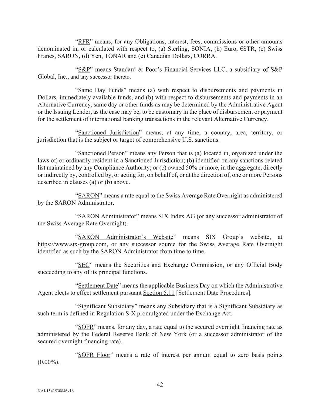 NAI-1541530846v16 42 “RFR” means, for any Obligations, interest, fees, commissions or other amounts denominated in, or calculated with respect to, (a) Sterling, SONIA, (b) Euro, €STR, (c) Swiss Francs, SARON, (d) Yen, TONAR and (e) Canadian Dollars, CORRA. “S&P” means Standard & Poor’s Financial Services LLC, a subsidiary of S&P Global, Inc., and any successor thereto. “Same Day Funds” means (a) with respect to disbursements and payments in Dollars, immediately available funds, and (b) with respect to disbursements and payments in an Alternative Currency, same day or other funds as may be determined by the Administrative Agent or the Issuing Lender, as the case may be, to be customary in the place of disbursement or payment for the settlement of international banking transactions in the relevant Alternative Currency. “Sanctioned Jurisdiction” means, at any time, a country, area, territory, or jurisdiction that is the subject or target of comprehensive U.S. sanctions. “Sanctioned Person” means any Person that is (a) located in, organized under the laws of, or ordinarily resident in a Sanctioned Jurisdiction; (b) identified on any sanctions-related list maintained by any Compliance Authority; or (c) owned 50% or more, in the aggregate, directly or indirectly by, controlled by, or acting for, on behalf of, or at the direction of, one or more Persons described in clauses (a) or (b) above. “SARON” means a rate equal to the Swiss Average Rate Overnight as administered by the SARON Administrator. “SARON Administrator” means SIX Index AG (or any successor administrator of the Swiss Average Rate Overnight). “SARON Administrator’s Website” means SIX Group’s website, at https://www.six-group.com, or any successor source for the Swiss Average Rate Overnight identified as such by the SARON Administrator from time to time. “SEC” means the Securities and Exchange Commission, or any Official Body succeeding to any of its principal functions. “Settlement Date” means the applicable Business Day on which the Administrative Agent elects to effect settlement pursuant Section 5.11 [Settlement Date Procedures]. “Significant Subsidiary” means any Subsidiary that is a Significant Subsidiary as such term is defined in Regulation S-X promulgated under the Exchange Act. “SOFR” means, for any day, a rate equal to the secured overnight financing rate as administered by the Federal Reserve Bank of New York (or a successor administrator of the secured overnight financing rate). “SOFR Floor” means a rate of interest per annum equal to zero basis points (0.00%).