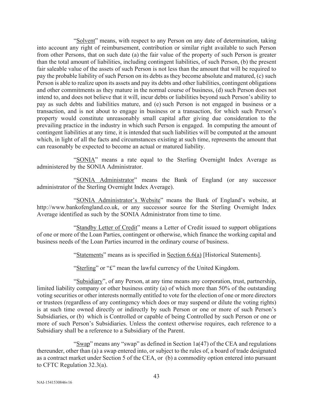 NAI-1541530846v16 43 “Solvent” means, with respect to any Person on any date of determination, taking into account any right of reimbursement, contribution or similar right available to such Person from other Persons, that on such date (a) the fair value of the property of such Person is greater than the total amount of liabilities, including contingent liabilities, of such Person, (b) the present fair saleable value of the assets of such Person is not less than the amount that will be required to pay the probable liability of such Person on its debts as they become absolute and matured, (c) such Person is able to realize upon its assets and pay its debts and other liabilities, contingent obligations and other commitments as they mature in the normal course of business, (d) such Person does not intend to, and does not believe that it will, incur debts or liabilities beyond such Person’s ability to pay as such debts and liabilities mature, and (e) such Person is not engaged in business or a transaction, and is not about to engage in business or a transaction, for which such Person’s property would constitute unreasonably small capital after giving due consideration to the prevailing practice in the industry in which such Person is engaged. In computing the amount of contingent liabilities at any time, it is intended that such liabilities will be computed at the amount which, in light of all the facts and circumstances existing at such time, represents the amount that can reasonably be expected to become an actual or matured liability. “SONIA” means a rate equal to the Sterling Overnight Index Average as administered by the SONIA Administrator. “SONIA Administrator” means the Bank of England (or any successor administrator of the Sterling Overnight Index Average). “SONIA Administrator’s Website” means the Bank of England’s website, at http://www.bankofengland.co.uk, or any successor source for the Sterling Overnight Index Average identified as such by the SONIA Administrator from time to time. “Standby Letter of Credit” means a Letter of Credit issued to support obligations of one or more of the Loan Parties, contingent or otherwise, which finance the working capital and business needs of the Loan Parties incurred in the ordinary course of business. “Statements” means as is specified in Section 6.6(a) [Historical Statements]. “Sterling” or “£” mean the lawful currency of the United Kingdom. “Subsidiary”, of any Person, at any time means any corporation, trust, partnership, limited liability company or other business entity (a) of which more than 50% of the outstanding voting securities or other interests normally entitled to vote for the election of one or more directors or trustees (regardless of any contingency which does or may suspend or dilute the voting rights) is at such time owned directly or indirectly by such Person or one or more of such Person’s Subsidiaries, or (b) which is Controlled or capable of being Controlled by such Person or one or more of such Person’s Subsidiaries. Unless the context otherwise requires, each reference to a Subsidiary shall be a reference to a Subsidiary of the Parent. “Swap” means any “swap” as defined in Section 1a(47) of the CEA and regulations thereunder, other than (a) a swap entered into, or subject to the rules of, a board of trade designated as a contract market under Section 5 of the CEA, or (b) a commodity option entered into pursuant to CFTC Regulation 32.3(a).