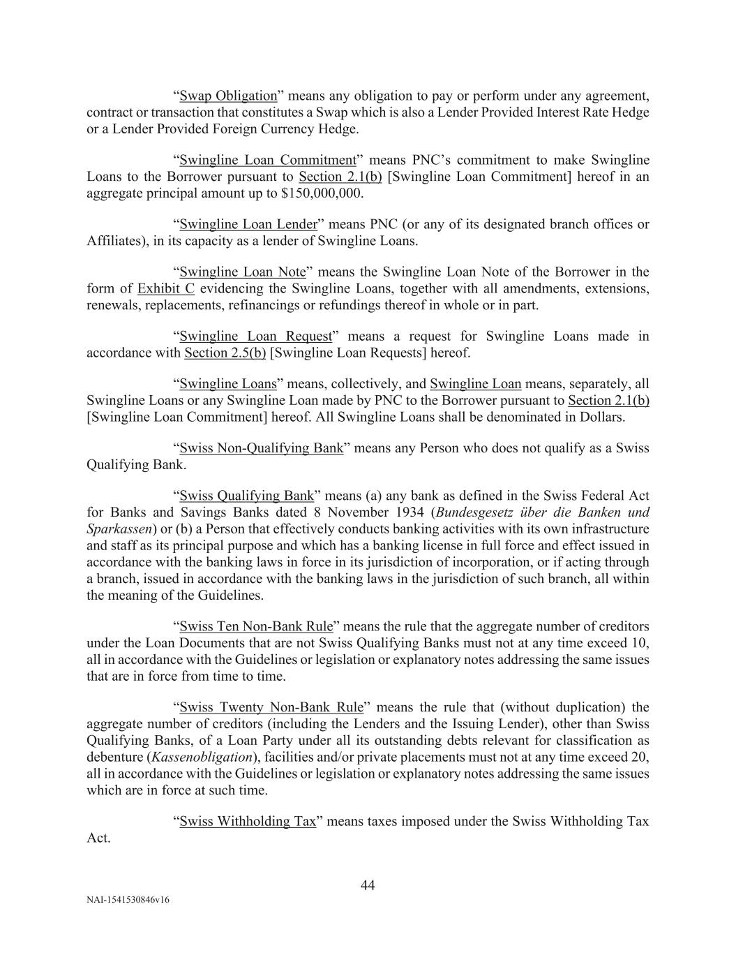 NAI-1541530846v16 44 “Swap Obligation” means any obligation to pay or perform under any agreement, contract or transaction that constitutes a Swap which is also a Lender Provided Interest Rate Hedge or a Lender Provided Foreign Currency Hedge. “Swingline Loan Commitment” means PNC’s commitment to make Swingline Loans to the Borrower pursuant to Section 2.1(b) [Swingline Loan Commitment] hereof in an aggregate principal amount up to $150,000,000. “Swingline Loan Lender” means PNC (or any of its designated branch offices or Affiliates), in its capacity as a lender of Swingline Loans. “Swingline Loan Note” means the Swingline Loan Note of the Borrower in the form of Exhibit C evidencing the Swingline Loans, together with all amendments, extensions, renewals, replacements, refinancings or refundings thereof in whole or in part. “Swingline Loan Request” means a request for Swingline Loans made in accordance with Section 2.5(b) [Swingline Loan Requests] hereof. “Swingline Loans” means, collectively, and Swingline Loan means, separately, all Swingline Loans or any Swingline Loan made by PNC to the Borrower pursuant to Section 2.1(b) [Swingline Loan Commitment] hereof. All Swingline Loans shall be denominated in Dollars. “Swiss Non-Qualifying Bank” means any Person who does not qualify as a Swiss Qualifying Bank. “Swiss Qualifying Bank” means (a) any bank as defined in the Swiss Federal Act for Banks and Savings Banks dated 8 November 1934 (Bundesgesetz über die Banken und Sparkassen) or (b) a Person that effectively conducts banking activities with its own infrastructure and staff as its principal purpose and which has a banking license in full force and effect issued in accordance with the banking laws in force in its jurisdiction of incorporation, or if acting through a branch, issued in accordance with the banking laws in the jurisdiction of such branch, all within the meaning of the Guidelines. “Swiss Ten Non-Bank Rule” means the rule that the aggregate number of creditors under the Loan Documents that are not Swiss Qualifying Banks must not at any time exceed 10, all in accordance with the Guidelines or legislation or explanatory notes addressing the same issues that are in force from time to time. “Swiss Twenty Non-Bank Rule” means the rule that (without duplication) the aggregate number of creditors (including the Lenders and the Issuing Lender), other than Swiss Qualifying Banks, of a Loan Party under all its outstanding debts relevant for classification as debenture (Kassenobligation), facilities and/or private placements must not at any time exceed 20, all in accordance with the Guidelines or legislation or explanatory notes addressing the same issues which are in force at such time. “Swiss Withholding Tax” means taxes imposed under the Swiss Withholding Tax Act.