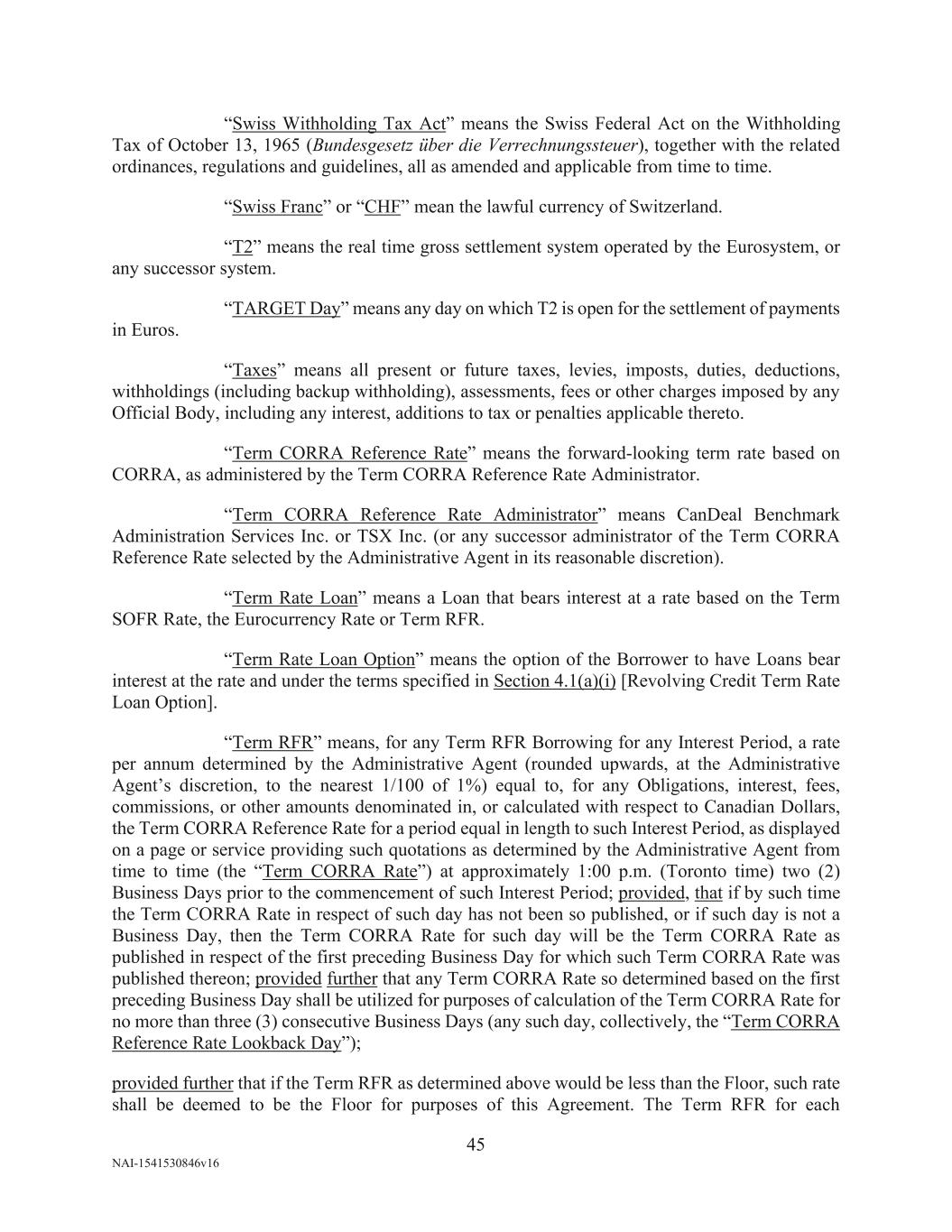 NAI-1541530846v16 45 “Swiss Withholding Tax Act” means the Swiss Federal Act on the Withholding Tax of October 13, 1965 (Bundesgesetz über die Verrechnungssteuer), together with the related ordinances, regulations and guidelines, all as amended and applicable from time to time. “Swiss Franc” or “CHF” mean the lawful currency of Switzerland. “T2” means the real time gross settlement system operated by the Eurosystem, or any successor system. “TARGET Day” means any day on which T2 is open for the settlement of payments in Euros. “Taxes” means all present or future taxes, levies, imposts, duties, deductions, withholdings (including backup withholding), assessments, fees or other charges imposed by any Official Body, including any interest, additions to tax or penalties applicable thereto. “Term CORRA Reference Rate” means the forward-looking term rate based on CORRA, as administered by the Term CORRA Reference Rate Administrator. “Term CORRA Reference Rate Administrator” means CanDeal Benchmark Administration Services Inc. or TSX Inc. (or any successor administrator of the Term CORRA Reference Rate selected by the Administrative Agent in its reasonable discretion). “Term Rate Loan” means a Loan that bears interest at a rate based on the Term SOFR Rate, the Eurocurrency Rate or Term RFR. “Term Rate Loan Option” means the option of the Borrower to have Loans bear interest at the rate and under the terms specified in Section 4.1(a)(i) [Revolving Credit Term Rate Loan Option]. “Term RFR” means, for any Term RFR Borrowing for any Interest Period, a rate per annum determined by the Administrative Agent (rounded upwards, at the Administrative Agent’s discretion, to the nearest 1/100 of 1%) equal to, for any Obligations, interest, fees, commissions, or other amounts denominated in, or calculated with respect to Canadian Dollars, the Term CORRA Reference Rate for a period equal in length to such Interest Period, as displayed on a page or service providing such quotations as determined by the Administrative Agent from time to time (the “Term CORRA Rate”) at approximately 1:00 p.m. (Toronto time) two (2) Business Days prior to the commencement of such Interest Period; provided, that if by such time the Term CORRA Rate in respect of such day has not been so published, or if such day is not a Business Day, then the Term CORRA Rate for such day will be the Term CORRA Rate as published in respect of the first preceding Business Day for which such Term CORRA Rate was published thereon; provided further that any Term CORRA Rate so determined based on the first preceding Business Day shall be utilized for purposes of calculation of the Term CORRA Rate for no more than three (3) consecutive Business Days (any such day, collectively, the “Term CORRA Reference Rate Lookback Day”); provided further that if the Term RFR as determined above would be less than the Floor, such rate shall be deemed to be the Floor for purposes of this Agreement. The Term RFR for each