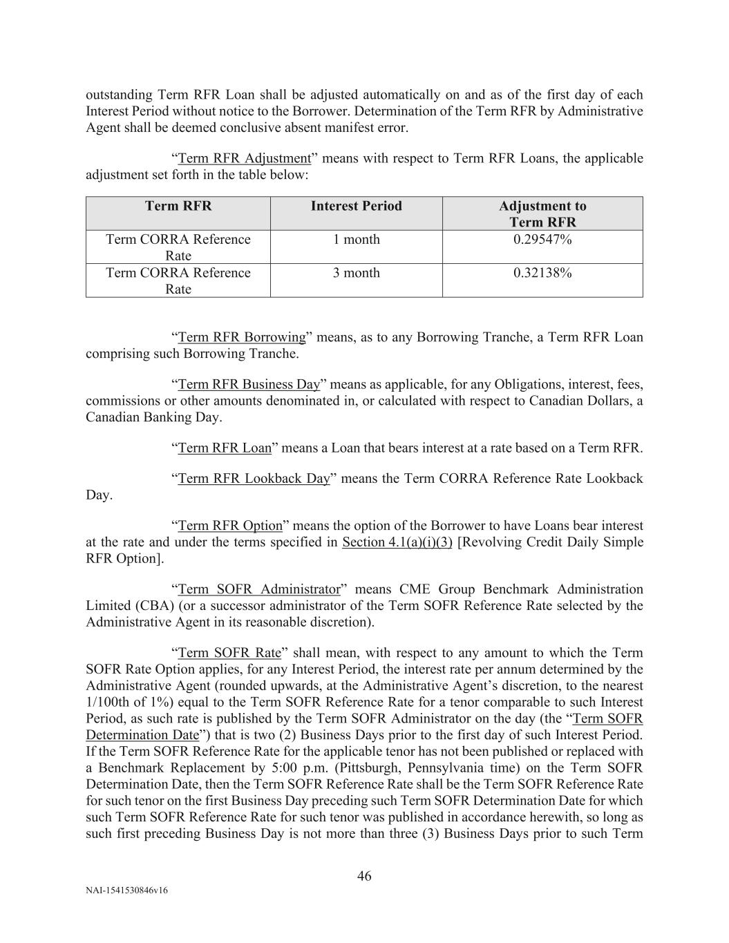 NAI-1541530846v16 46 outstanding Term RFR Loan shall be adjusted automatically on and as of the first day of each Interest Period without notice to the Borrower. Determination of the Term RFR by Administrative Agent shall be deemed conclusive absent manifest error. “Term RFR Adjustment” means with respect to Term RFR Loans, the applicable adjustment set forth in the table below: Term RFR Interest Period Adjustment to Term RFR Term CORRA Reference Rate 1 month 0.29547% Term CORRA Reference Rate 3 month 0.32138% “Term RFR Borrowing” means, as to any Borrowing Tranche, a Term RFR Loan comprising such Borrowing Tranche. “Term RFR Business Day” means as applicable, for any Obligations, interest, fees, commissions or other amounts denominated in, or calculated with respect to Canadian Dollars, a Canadian Banking Day. “Term RFR Loan” means a Loan that bears interest at a rate based on a Term RFR. “Term RFR Lookback Day” means the Term CORRA Reference Rate Lookback Day. “Term RFR Option” means the option of the Borrower to have Loans bear interest at the rate and under the terms specified in Section 4.1(a)(i)(3) [Revolving Credit Daily Simple RFR Option]. “Term SOFR Administrator” means CME Group Benchmark Administration Limited (CBA) (or a successor administrator of the Term SOFR Reference Rate selected by the Administrative Agent in its reasonable discretion). “Term SOFR Rate” shall mean, with respect to any amount to which the Term SOFR Rate Option applies, for any Interest Period, the interest rate per annum determined by the Administrative Agent (rounded upwards, at the Administrative Agent’s discretion, to the nearest 1/100th of 1%) equal to the Term SOFR Reference Rate for a tenor comparable to such Interest Period, as such rate is published by the Term SOFR Administrator on the day (the “Term SOFR Determination Date”) that is two (2) Business Days prior to the first day of such Interest Period. If the Term SOFR Reference Rate for the applicable tenor has not been published or replaced with a Benchmark Replacement by 5:00 p.m. (Pittsburgh, Pennsylvania time) on the Term SOFR Determination Date, then the Term SOFR Reference Rate shall be the Term SOFR Reference Rate for such tenor on the first Business Day preceding such Term SOFR Determination Date for which such Term SOFR Reference Rate for such tenor was published in accordance herewith, so long as such first preceding Business Day is not more than three (3) Business Days prior to such Term