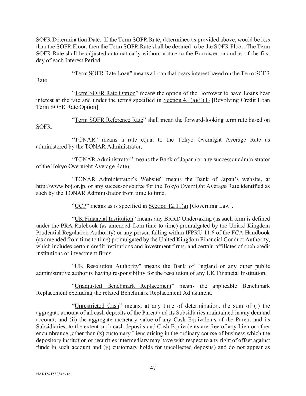 NAI-1541530846v16 47 SOFR Determination Date. If the Term SOFR Rate, determined as provided above, would be less than the SOFR Floor, then the Term SOFR Rate shall be deemed to be the SOFR Floor. The Term SOFR Rate shall be adjusted automatically without notice to the Borrower on and as of the first day of each Interest Period. “Term SOFR Rate Loan” means a Loan that bears interest based on the Term SOFR Rate. “Term SOFR Rate Option” means the option of the Borrower to have Loans bear interest at the rate and under the terms specified in Section 4.1(a)(i)(1) [Revolving Credit Loan Term SOFR Rate Option] “Term SOFR Reference Rate” shall mean the forward-looking term rate based on SOFR. “TONAR” means a rate equal to the Tokyo Overnight Average Rate as administered by the TONAR Administrator. “TONAR Administrator” means the Bank of Japan (or any successor administrator of the Tokyo Overnight Average Rate). “TONAR Administrator’s Website” means the Bank of Japan’s website, at http://www.boj.or.jp, or any successor source for the Tokyo Overnight Average Rate identified as such by the TONAR Administrator from time to time. “UCP” means as is specified in Section 12.11(a) [Governing Law]. “UK Financial Institution” means any BRRD Undertaking (as such term is defined under the PRA Rulebook (as amended from time to time) promulgated by the United Kingdom Prudential Regulation Authority) or any person falling within IFPRU 11.6 of the FCA Handbook (as amended from time to time) promulgated by the United Kingdom Financial Conduct Authority, which includes certain credit institutions and investment firms, and certain affiliates of such credit institutions or investment firms. “UK Resolution Authority” means the Bank of England or any other public administrative authority having responsibility for the resolution of any UK Financial Institution. “Unadjusted Benchmark Replacement” means the applicable Benchmark Replacement excluding the related Benchmark Replacement Adjustment. “Unrestricted Cash” means, at any time of determination, the sum of (i) the aggregate amount of all cash deposits of the Parent and its Subsidiaries maintained in any demand account, and (ii) the aggregate monetary value of any Cash Equivalents of the Parent and its Subsidiaries, to the extent such cash deposits and Cash Equivalents are free of any Lien or other encumbrance (other than (x) customary Liens arising in the ordinary course of business which the depository institution or securities intermediary may have with respect to any right of offset against funds in such account and (y) customary holds for uncollected deposits) and do not appear as