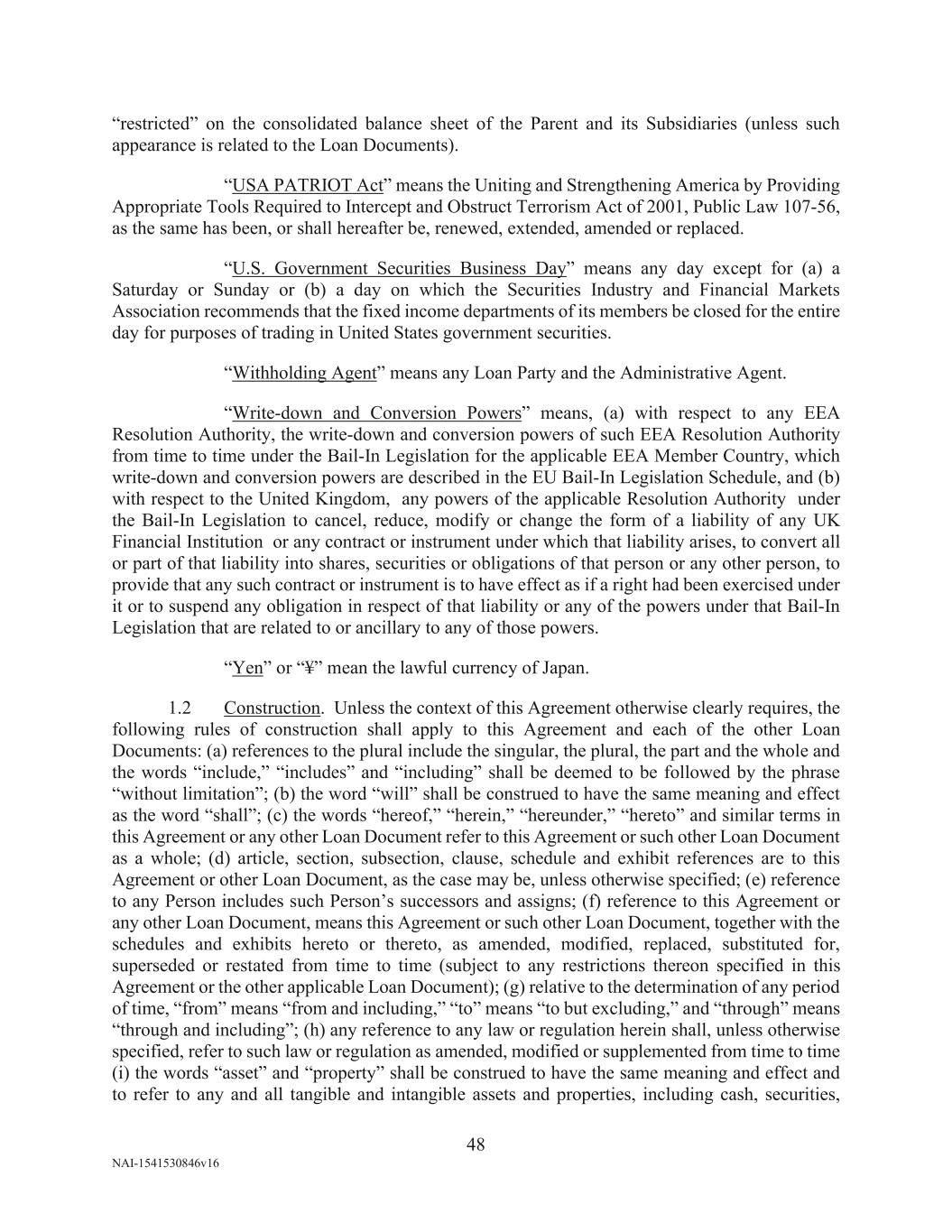 NAI-1541530846v16 48 “restricted” on the consolidated balance sheet of the Parent and its Subsidiaries (unless such appearance is related to the Loan Documents). “USA PATRIOT Act” means the Uniting and Strengthening America by Providing Appropriate Tools Required to Intercept and Obstruct Terrorism Act of 2001, Public Law 107-56, as the same has been, or shall hereafter be, renewed, extended, amended or replaced. “U.S. Government Securities Business Day” means any day except for (a) a Saturday or Sunday or (b) a day on which the Securities Industry and Financial Markets Association recommends that the fixed income departments of its members be closed for the entire day for purposes of trading in United States government securities. “Withholding Agent” means any Loan Party and the Administrative Agent. “Write-down and Conversion Powers” means, (a) with respect to any EEA Resolution Authority, the write-down and conversion powers of such EEA Resolution Authority from time to time under the Bail-In Legislation for the applicable EEA Member Country, which write-down and conversion powers are described in the EU Bail-In Legislation Schedule, and (b) with respect to the United Kingdom, any powers of the applicable Resolution Authority under the Bail-In Legislation to cancel, reduce, modify or change the form of a liability of any UK Financial Institution or any contract or instrument under which that liability arises, to convert all or part of that liability into shares, securities or obligations of that person or any other person, to provide that any such contract or instrument is to have effect as if a right had been exercised under it or to suspend any obligation in respect of that liability or any of the powers under that Bail-In Legislation that are related to or ancillary to any of those powers. “Yen” or “¥” mean the lawful currency of Japan. 1.2 Construction. Unless the context of this Agreement otherwise clearly requires, the following rules of construction shall apply to this Agreement and each of the other Loan Documents: (a) references to the plural include the singular, the plural, the part and the whole and the words “include,” “includes” and “including” shall be deemed to be followed by the phrase “without limitation”; (b) the word “will” shall be construed to have the same meaning and effect as the word “shall”; (c) the words “hereof,” “herein,” “hereunder,” “hereto” and similar terms in this Agreement or any other Loan Document refer to this Agreement or such other Loan Document as a whole; (d) article, section, subsection, clause, schedule and exhibit references are to this Agreement or other Loan Document, as the case may be, unless otherwise specified; (e) reference to any Person includes such Person’s successors and assigns; (f) reference to this Agreement or any other Loan Document, means this Agreement or such other Loan Document, together with the schedules and exhibits hereto or thereto, as amended, modified, replaced, substituted for, superseded or restated from time to time (subject to any restrictions thereon specified in this Agreement or the other applicable Loan Document); (g) relative to the determination of any period of time, “from” means “from and including,” “to” means “to but excluding,” and “through” means “through and including”; (h) any reference to any law or regulation herein shall, unless otherwise specified, refer to such law or regulation as amended, modified or supplemented from time to time (i) the words “asset” and “property” shall be construed to have the same meaning and effect and to refer to any and all tangible and intangible assets and properties, including cash, securities,