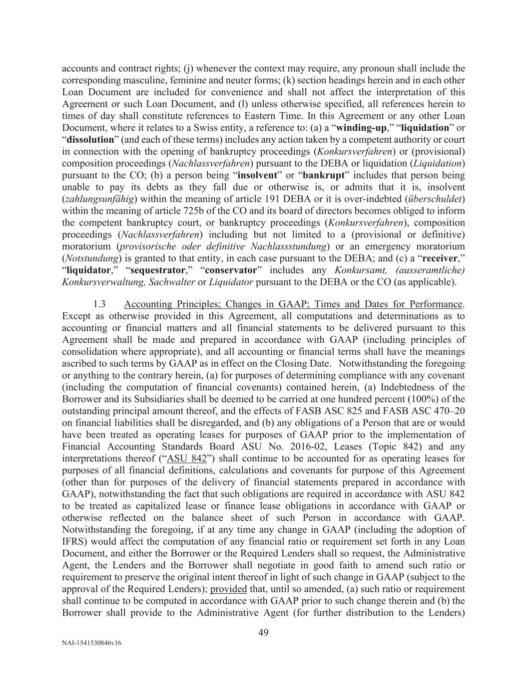 NAI-1541530846v16 49 accounts and contract rights; (j) whenever the context may require, any pronoun shall include the corresponding masculine, feminine and neuter forms; (k) section headings herein and in each other Loan Document are included for convenience and shall not affect the interpretation of this Agreement or such Loan Document, and (l) unless otherwise specified, all references herein to times of day shall constitute references to Eastern Time. In this Agreement or any other Loan Document, where it relates to a Swiss entity, a reference to: (a) a “winding-up,” “liquidation” or “dissolution” (and each of these terms) includes any action taken by a competent authority or court in connection with the opening of bankruptcy proceedings (Konkursverfahren) or (provisional) composition proceedings (Nachlassverfahren) pursuant to the DEBA or liquidation (Liquidation) pursuant to the CO; (b) a person being “insolvent” or “bankrupt” includes that person being unable to pay its debts as they fall due or otherwise is, or admits that it is, insolvent (zahlungsunfähig) within the meaning of article 191 DEBA or it is over-indebted (überschuldet) within the meaning of article 725b of the CO and its board of directors becomes obliged to inform the competent bankruptcy court, or bankruptcy proceedings (Konkursverfahren), composition proceedings (Nachlassverfahren) including but not limited to a (provisional or definitive) moratorium (provisorische oder definitive Nachlassstundung) or an emergency moratorium (Notstundung) is granted to that entity, in each case pursuant to the DEBA; and (c) a “receiver,” “liquidator,” “sequestrator,” “conservator” includes any Konkursamt, (ausseramtliche) Konkursverwaltung, Sachwalter or Liquidator pursuant to the DEBA or the CO (as applicable). 1.3 Accounting Principles; Changes in GAAP; Times and Dates for Performance. Except as otherwise provided in this Agreement, all computations and determinations as to accounting or financial matters and all financial statements to be delivered pursuant to this Agreement shall be made and prepared in accordance with GAAP (including principles of consolidation where appropriate), and all accounting or financial terms shall have the meanings ascribed to such terms by GAAP as in effect on the Closing Date. Notwithstanding the foregoing or anything to the contrary herein, (a) for purposes of determining compliance with any covenant (including the computation of financial covenants) contained herein, (a) Indebtedness of the Borrower and its Subsidiaries shall be deemed to be carried at one hundred percent (100%) of the outstanding principal amount thereof, and the effects of FASB ASC 825 and FASB ASC 470–20 on financial liabilities shall be disregarded, and (b) any obligations of a Person that are or would have been treated as operating leases for purposes of GAAP prior to the implementation of Financial Accounting Standards Board ASU No. 2016-02, Leases (Topic 842) and any interpretations thereof (“ASU 842”) shall continue to be accounted for as operating leases for purposes of all financial definitions, calculations and covenants for purpose of this Agreement (other than for purposes of the delivery of financial statements prepared in accordance with GAAP), notwithstanding the fact that such obligations are required in accordance with ASU 842 to be treated as capitalized lease or finance lease obligations in accordance with GAAP or otherwise reflected on the balance sheet of such Person in accordance with GAAP. Notwithstanding the foregoing, if at any time any change in GAAP (including the adoption of IFRS) would affect the computation of any financial ratio or requirement set forth in any Loan Document, and either the Borrower or the Required Lenders shall so request, the Administrative Agent, the Lenders and the Borrower shall negotiate in good faith to amend such ratio or requirement to preserve the original intent thereof in light of such change in GAAP (subject to the approval of the Required Lenders); provided that, until so amended, (a) such ratio or requirement shall continue to be computed in accordance with GAAP prior to such change therein and (b) the Borrower shall provide to the Administrative Agent (for further distribution to the Lenders)