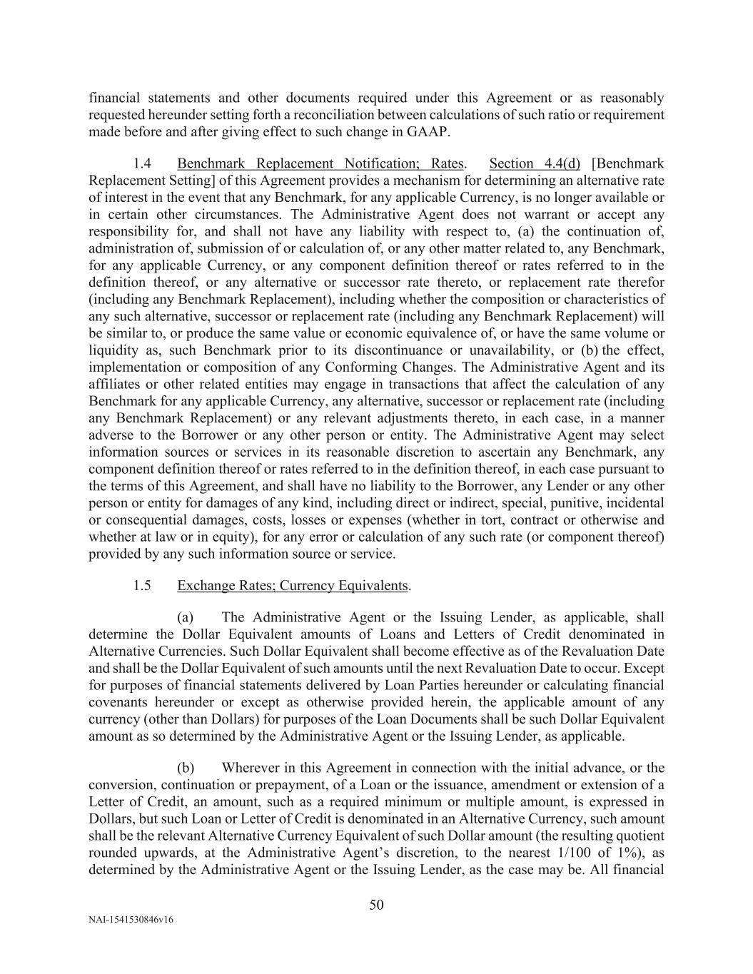 NAI-1541530846v16 50 financial statements and other documents required under this Agreement or as reasonably requested hereunder setting forth a reconciliation between calculations of such ratio or requirement made before and after giving effect to such change in GAAP. 1.4 Benchmark Replacement Notification; Rates. Section 4.4(d) [Benchmark Replacement Setting] of this Agreement provides a mechanism for determining an alternative rate of interest in the event that any Benchmark, for any applicable Currency, is no longer available or in certain other circumstances. The Administrative Agent does not warrant or accept any responsibility for, and shall not have any liability with respect to, (a) the continuation of, administration of, submission of or calculation of, or any other matter related to, any Benchmark, for any applicable Currency, or any component definition thereof or rates referred to in the definition thereof, or any alternative or successor rate thereto, or replacement rate therefor (including any Benchmark Replacement), including whether the composition or characteristics of any such alternative, successor or replacement rate (including any Benchmark Replacement) will be similar to, or produce the same value or economic equivalence of, or have the same volume or liquidity as, such Benchmark prior to its discontinuance or unavailability, or (b) the effect, implementation or composition of any Conforming Changes. The Administrative Agent and its affiliates or other related entities may engage in transactions that affect the calculation of any Benchmark for any applicable Currency, any alternative, successor or replacement rate (including any Benchmark Replacement) or any relevant adjustments thereto, in each case, in a manner adverse to the Borrower or any other person or entity. The Administrative Agent may select information sources or services in its reasonable discretion to ascertain any Benchmark, any component definition thereof or rates referred to in the definition thereof, in each case pursuant to the terms of this Agreement, and shall have no liability to the Borrower, any Lender or any other person or entity for damages of any kind, including direct or indirect, special, punitive, incidental or consequential damages, costs, losses or expenses (whether in tort, contract or otherwise and whether at law or in equity), for any error or calculation of any such rate (or component thereof) provided by any such information source or service. 1.5 Exchange Rates; Currency Equivalents. (a) The Administrative Agent or the Issuing Lender, as applicable, shall determine the Dollar Equivalent amounts of Loans and Letters of Credit denominated in Alternative Currencies. Such Dollar Equivalent shall become effective as of the Revaluation Date and shall be the Dollar Equivalent of such amounts until the next Revaluation Date to occur. Except for purposes of financial statements delivered by Loan Parties hereunder or calculating financial covenants hereunder or except as otherwise provided herein, the applicable amount of any currency (other than Dollars) for purposes of the Loan Documents shall be such Dollar Equivalent amount as so determined by the Administrative Agent or the Issuing Lender, as applicable. (b) Wherever in this Agreement in connection with the initial advance, or the conversion, continuation or prepayment, of a Loan or the issuance, amendment or extension of a Letter of Credit, an amount, such as a required minimum or multiple amount, is expressed in Dollars, but such Loan or Letter of Credit is denominated in an Alternative Currency, such amount shall be the relevant Alternative Currency Equivalent of such Dollar amount (the resulting quotient rounded upwards, at the Administrative Agent’s discretion, to the nearest 1/100 of 1%), as determined by the Administrative Agent or the Issuing Lender, as the case may be. All financial