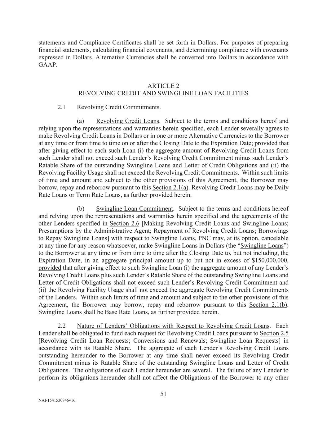 NAI-1541530846v16 51 statements and Compliance Certificates shall be set forth in Dollars. For purposes of preparing financial statements, calculating financial covenants, and determining compliance with covenants expressed in Dollars, Alternative Currencies shall be converted into Dollars in accordance with GAAP. ARTICLE 2 REVOLVING CREDIT AND SWINGLINE LOAN FACILITIES 2.1 Revolving Credit Commitments. (a) Revolving Credit Loans. Subject to the terms and conditions hereof and relying upon the representations and warranties herein specified, each Lender severally agrees to make Revolving Credit Loans in Dollars or in one or more Alternative Currencies to the Borrower at any time or from time to time on or after the Closing Date to the Expiration Date; provided that after giving effect to each such Loan (i) the aggregate amount of Revolving Credit Loans from such Lender shall not exceed such Lender’s Revolving Credit Commitment minus such Lender’s Ratable Share of the outstanding Swingline Loans and Letter of Credit Obligations and (ii) the Revolving Facility Usage shall not exceed the Revolving Credit Commitments. Within such limits of time and amount and subject to the other provisions of this Agreement, the Borrower may borrow, repay and reborrow pursuant to this Section 2.1(a). Revolving Credit Loans may be Daily Rate Loans or Term Rate Loans, as further provided herein. (b) Swingline Loan Commitment. Subject to the terms and conditions hereof and relying upon the representations and warranties herein specified and the agreements of the other Lenders specified in Section 2.6 [Making Revolving Credit Loans and Swingline Loans; Presumptions by the Administrative Agent; Repayment of Revolving Credit Loans; Borrowings to Repay Swingline Loans] with respect to Swingline Loans, PNC may, at its option, cancelable at any time for any reason whatsoever, make Swingline Loans in Dollars (the “Swingline Loans”) to the Borrower at any time or from time to time after the Closing Date to, but not including, the Expiration Date, in an aggregate principal amount up to but not in excess of $150,000,000, provided that after giving effect to such Swingline Loan (i) the aggregate amount of any Lender’s Revolving Credit Loans plus such Lender’s Ratable Share of the outstanding Swingline Loans and Letter of Credit Obligations shall not exceed such Lender’s Revolving Credit Commitment and (ii) the Revolving Facility Usage shall not exceed the aggregate Revolving Credit Commitments of the Lenders. Within such limits of time and amount and subject to the other provisions of this Agreement, the Borrower may borrow, repay and reborrow pursuant to this Section 2.1(b). Swingline Loans shall be Base Rate Loans, as further provided herein. 2.2 Nature of Lenders’ Obligations with Respect to Revolving Credit Loans. Each Lender shall be obligated to fund each request for Revolving Credit Loans pursuant to Section 2.5 [Revolving Credit Loan Requests; Conversions and Renewals; Swingline Loan Requests] in accordance with its Ratable Share. The aggregate of each Lender’s Revolving Credit Loans outstanding hereunder to the Borrower at any time shall never exceed its Revolving Credit Commitment minus its Ratable Share of the outstanding Swingline Loans and Letter of Credit Obligations. The obligations of each Lender hereunder are several. The failure of any Lender to perform its obligations hereunder shall not affect the Obligations of the Borrower to any other