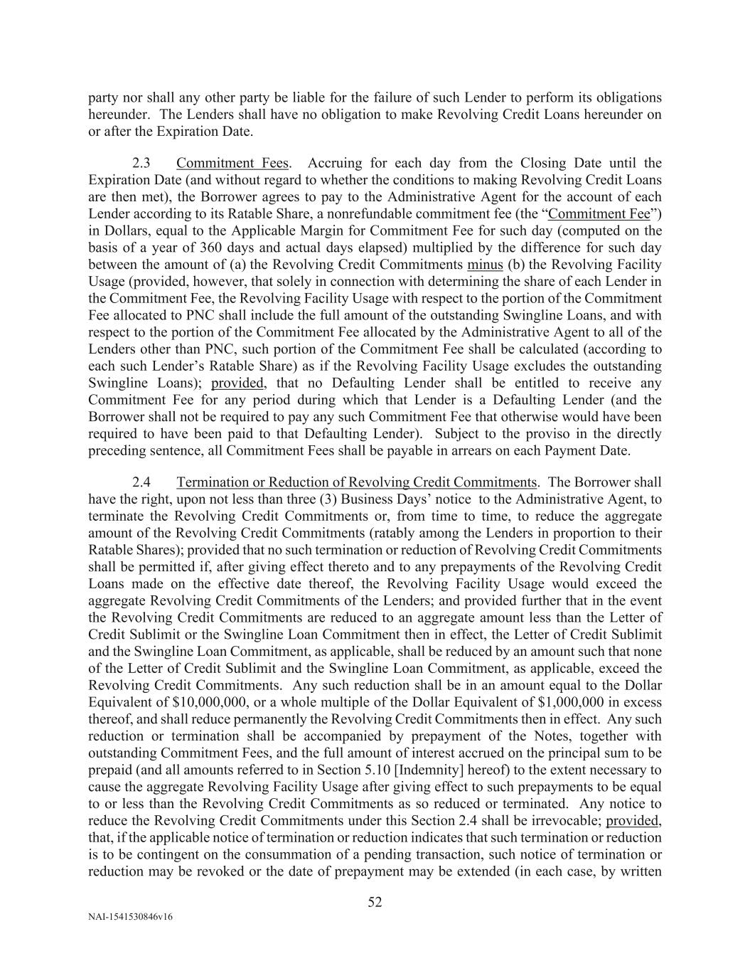 NAI-1541530846v16 52 party nor shall any other party be liable for the failure of such Lender to perform its obligations hereunder. The Lenders shall have no obligation to make Revolving Credit Loans hereunder on or after the Expiration Date. 2.3 Commitment Fees. Accruing for each day from the Closing Date until the Expiration Date (and without regard to whether the conditions to making Revolving Credit Loans are then met), the Borrower agrees to pay to the Administrative Agent for the account of each Lender according to its Ratable Share, a nonrefundable commitment fee (the “Commitment Fee”) in Dollars, equal to the Applicable Margin for Commitment Fee for such day (computed on the basis of a year of 360 days and actual days elapsed) multiplied by the difference for such day between the amount of (a) the Revolving Credit Commitments minus (b) the Revolving Facility Usage (provided, however, that solely in connection with determining the share of each Lender in the Commitment Fee, the Revolving Facility Usage with respect to the portion of the Commitment Fee allocated to PNC shall include the full amount of the outstanding Swingline Loans, and with respect to the portion of the Commitment Fee allocated by the Administrative Agent to all of the Lenders other than PNC, such portion of the Commitment Fee shall be calculated (according to each such Lender’s Ratable Share) as if the Revolving Facility Usage excludes the outstanding Swingline Loans); provided, that no Defaulting Lender shall be entitled to receive any Commitment Fee for any period during which that Lender is a Defaulting Lender (and the Borrower shall not be required to pay any such Commitment Fee that otherwise would have been required to have been paid to that Defaulting Lender). Subject to the proviso in the directly preceding sentence, all Commitment Fees shall be payable in arrears on each Payment Date. 2.4 Termination or Reduction of Revolving Credit Commitments. The Borrower shall have the right, upon not less than three (3) Business Days’ notice to the Administrative Agent, to terminate the Revolving Credit Commitments or, from time to time, to reduce the aggregate amount of the Revolving Credit Commitments (ratably among the Lenders in proportion to their Ratable Shares); provided that no such termination or reduction of Revolving Credit Commitments shall be permitted if, after giving effect thereto and to any prepayments of the Revolving Credit Loans made on the effective date thereof, the Revolving Facility Usage would exceed the aggregate Revolving Credit Commitments of the Lenders; and provided further that in the event the Revolving Credit Commitments are reduced to an aggregate amount less than the Letter of Credit Sublimit or the Swingline Loan Commitment then in effect, the Letter of Credit Sublimit and the Swingline Loan Commitment, as applicable, shall be reduced by an amount such that none of the Letter of Credit Sublimit and the Swingline Loan Commitment, as applicable, exceed the Revolving Credit Commitments. Any such reduction shall be in an amount equal to the Dollar Equivalent of $10,000,000, or a whole multiple of the Dollar Equivalent of $1,000,000 in excess thereof, and shall reduce permanently the Revolving Credit Commitments then in effect. Any such reduction or termination shall be accompanied by prepayment of the Notes, together with outstanding Commitment Fees, and the full amount of interest accrued on the principal sum to be prepaid (and all amounts referred to in Section 5.10 [Indemnity] hereof) to the extent necessary to cause the aggregate Revolving Facility Usage after giving effect to such prepayments to be equal to or less than the Revolving Credit Commitments as so reduced or terminated. Any notice to reduce the Revolving Credit Commitments under this Section 2.4 shall be irrevocable; provided, that, if the applicable notice of termination or reduction indicates that such termination or reduction is to be contingent on the consummation of a pending transaction, such notice of termination or reduction may be revoked or the date of prepayment may be extended (in each case, by written