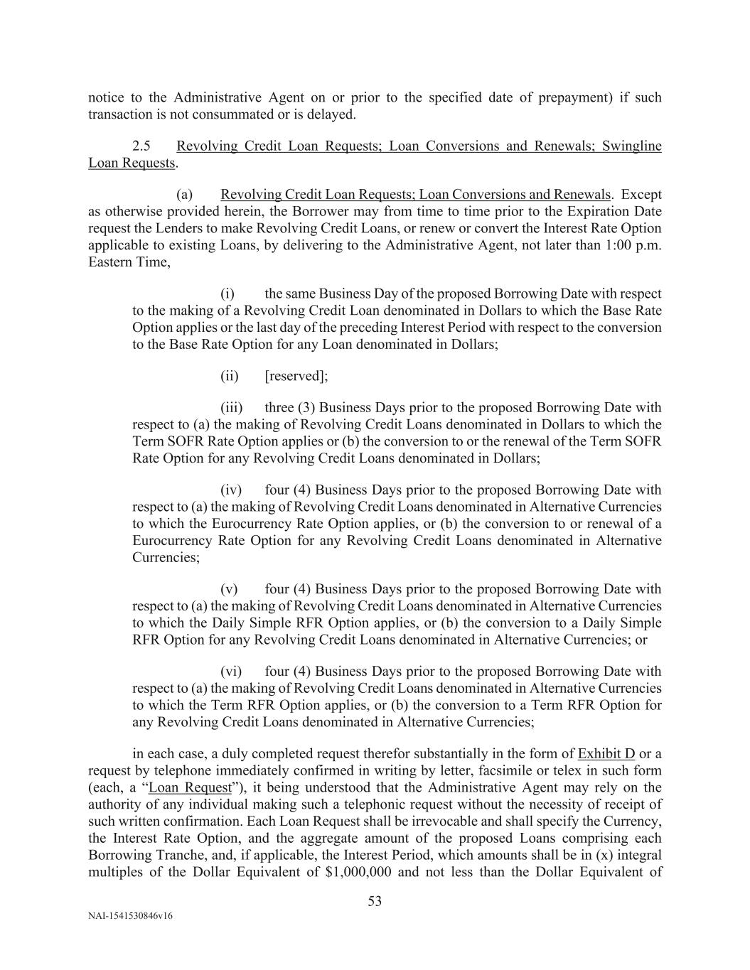 NAI-1541530846v16 53 notice to the Administrative Agent on or prior to the specified date of prepayment) if such transaction is not consummated or is delayed. 2.5 Revolving Credit Loan Requests; Loan Conversions and Renewals; Swingline Loan Requests. (a) Revolving Credit Loan Requests; Loan Conversions and Renewals. Except as otherwise provided herein, the Borrower may from time to time prior to the Expiration Date request the Lenders to make Revolving Credit Loans, or renew or convert the Interest Rate Option applicable to existing Loans, by delivering to the Administrative Agent, not later than 1:00 p.m. Eastern Time, (i) the same Business Day of the proposed Borrowing Date with respect to the making of a Revolving Credit Loan denominated in Dollars to which the Base Rate Option applies or the last day of the preceding Interest Period with respect to the conversion to the Base Rate Option for any Loan denominated in Dollars; (ii) [reserved]; (iii) three (3) Business Days prior to the proposed Borrowing Date with respect to (a) the making of Revolving Credit Loans denominated in Dollars to which the Term SOFR Rate Option applies or (b) the conversion to or the renewal of the Term SOFR Rate Option for any Revolving Credit Loans denominated in Dollars; (iv) four (4) Business Days prior to the proposed Borrowing Date with respect to (a) the making of Revolving Credit Loans denominated in Alternative Currencies to which the Eurocurrency Rate Option applies, or (b) the conversion to or renewal of a Eurocurrency Rate Option for any Revolving Credit Loans denominated in Alternative Currencies; (v) four (4) Business Days prior to the proposed Borrowing Date with respect to (a) the making of Revolving Credit Loans denominated in Alternative Currencies to which the Daily Simple RFR Option applies, or (b) the conversion to a Daily Simple RFR Option for any Revolving Credit Loans denominated in Alternative Currencies; or (vi) four (4) Business Days prior to the proposed Borrowing Date with respect to (a) the making of Revolving Credit Loans denominated in Alternative Currencies to which the Term RFR Option applies, or (b) the conversion to a Term RFR Option for any Revolving Credit Loans denominated in Alternative Currencies; in each case, a duly completed request therefor substantially in the form of Exhibit D or a request by telephone immediately confirmed in writing by letter, facsimile or telex in such form (each, a “Loan Request”), it being understood that the Administrative Agent may rely on the authority of any individual making such a telephonic request without the necessity of receipt of such written confirmation. Each Loan Request shall be irrevocable and shall specify the Currency, the Interest Rate Option, and the aggregate amount of the proposed Loans comprising each Borrowing Tranche, and, if applicable, the Interest Period, which amounts shall be in (x) integral multiples of the Dollar Equivalent of $1,000,000 and not less than the Dollar Equivalent of