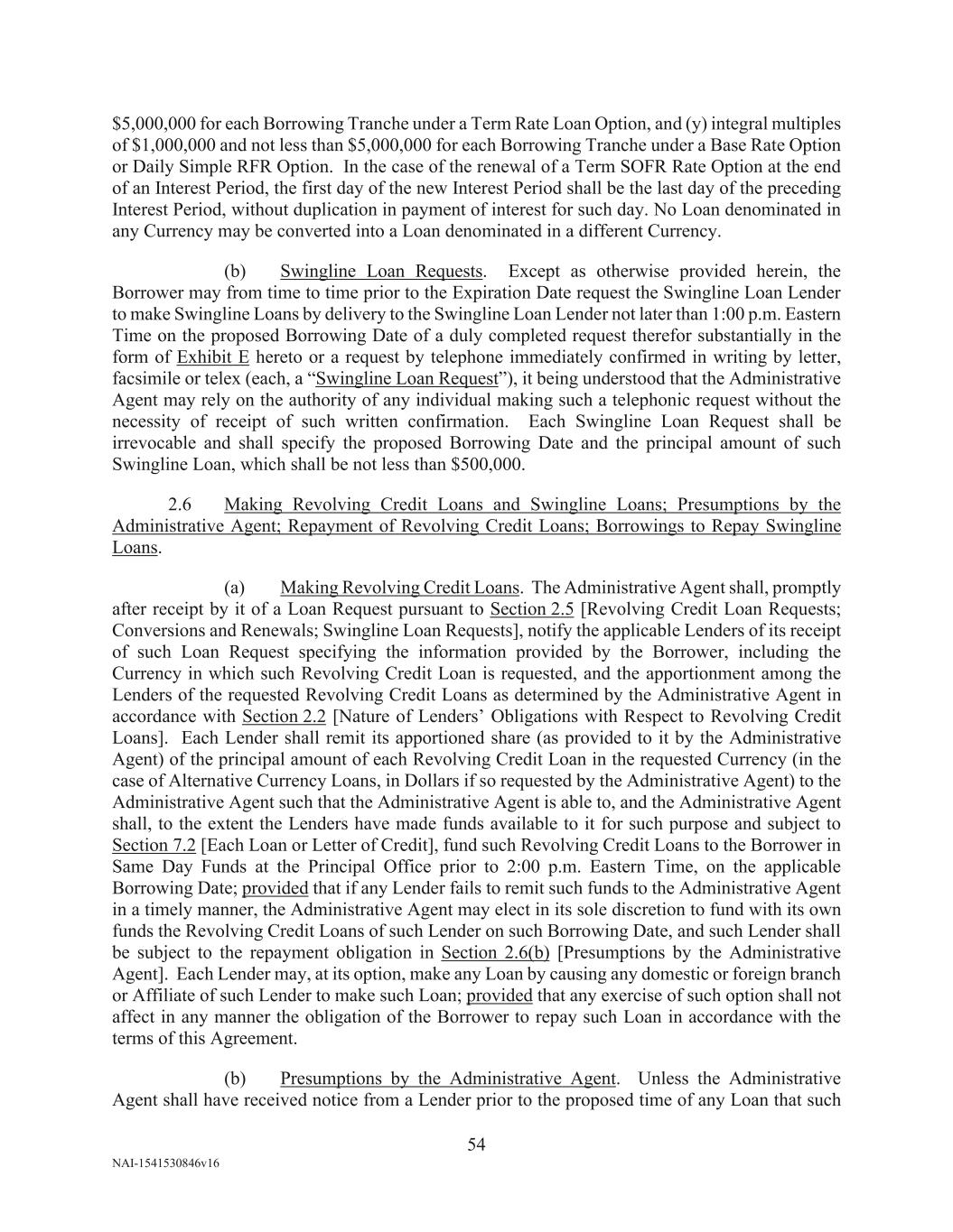 NAI-1541530846v16 54 $5,000,000 for each Borrowing Tranche under a Term Rate Loan Option, and (y) integral multiples of $1,000,000 and not less than $5,000,000 for each Borrowing Tranche under a Base Rate Option or Daily Simple RFR Option. In the case of the renewal of a Term SOFR Rate Option at the end of an Interest Period, the first day of the new Interest Period shall be the last day of the preceding Interest Period, without duplication in payment of interest for such day. No Loan denominated in any Currency may be converted into a Loan denominated in a different Currency. (b) Swingline Loan Requests. Except as otherwise provided herein, the Borrower may from time to time prior to the Expiration Date request the Swingline Loan Lender to make Swingline Loans by delivery to the Swingline Loan Lender not later than 1:00 p.m. Eastern Time on the proposed Borrowing Date of a duly completed request therefor substantially in the form of Exhibit E hereto or a request by telephone immediately confirmed in writing by letter, facsimile or telex (each, a “Swingline Loan Request”), it being understood that the Administrative Agent may rely on the authority of any individual making such a telephonic request without the necessity of receipt of such written confirmation. Each Swingline Loan Request shall be irrevocable and shall specify the proposed Borrowing Date and the principal amount of such Swingline Loan, which shall be not less than $500,000. 2.6 Making Revolving Credit Loans and Swingline Loans; Presumptions by the Administrative Agent; Repayment of Revolving Credit Loans; Borrowings to Repay Swingline Loans. (a) Making Revolving Credit Loans. The Administrative Agent shall, promptly after receipt by it of a Loan Request pursuant to Section 2.5 [Revolving Credit Loan Requests; Conversions and Renewals; Swingline Loan Requests], notify the applicable Lenders of its receipt of such Loan Request specifying the information provided by the Borrower, including the Currency in which such Revolving Credit Loan is requested, and the apportionment among the Lenders of the requested Revolving Credit Loans as determined by the Administrative Agent in accordance with Section 2.2 [Nature of Lenders’ Obligations with Respect to Revolving Credit Loans]. Each Lender shall remit its apportioned share (as provided to it by the Administrative Agent) of the principal amount of each Revolving Credit Loan in the requested Currency (in the case of Alternative Currency Loans, in Dollars if so requested by the Administrative Agent) to the Administrative Agent such that the Administrative Agent is able to, and the Administrative Agent shall, to the extent the Lenders have made funds available to it for such purpose and subject to Section 7.2 [Each Loan or Letter of Credit], fund such Revolving Credit Loans to the Borrower in Same Day Funds at the Principal Office prior to 2:00 p.m. Eastern Time, on the applicable Borrowing Date; provided that if any Lender fails to remit such funds to the Administrative Agent in a timely manner, the Administrative Agent may elect in its sole discretion to fund with its own funds the Revolving Credit Loans of such Lender on such Borrowing Date, and such Lender shall be subject to the repayment obligation in Section 2.6(b) [Presumptions by the Administrative Agent]. Each Lender may, at its option, make any Loan by causing any domestic or foreign branch or Affiliate of such Lender to make such Loan; provided that any exercise of such option shall not affect in any manner the obligation of the Borrower to repay such Loan in accordance with the terms of this Agreement. (b) Presumptions by the Administrative Agent. Unless the Administrative Agent shall have received notice from a Lender prior to the proposed time of any Loan that such