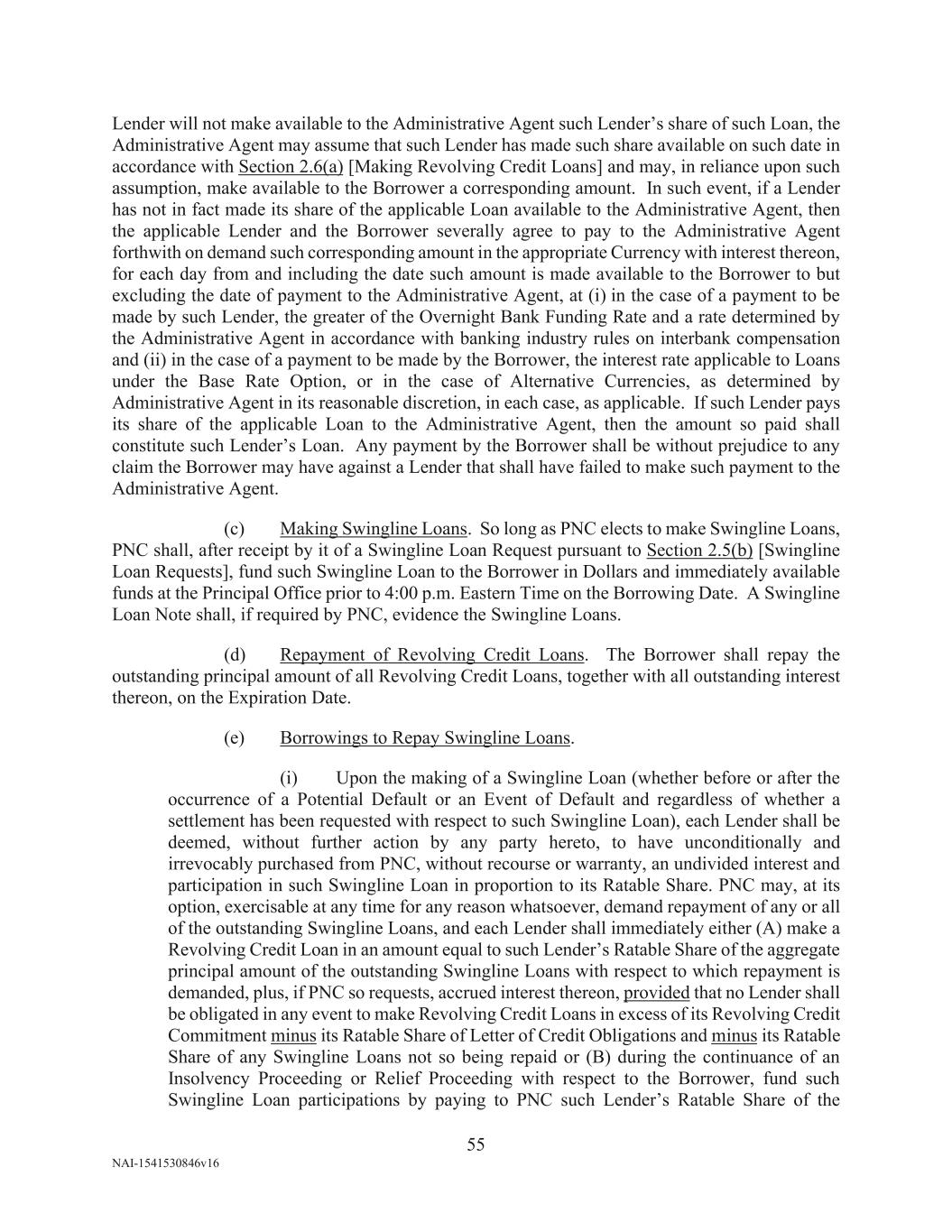 NAI-1541530846v16 55 Lender will not make available to the Administrative Agent such Lender’s share of such Loan, the Administrative Agent may assume that such Lender has made such share available on such date in accordance with Section 2.6(a) [Making Revolving Credit Loans] and may, in reliance upon such assumption, make available to the Borrower a corresponding amount. In such event, if a Lender has not in fact made its share of the applicable Loan available to the Administrative Agent, then the applicable Lender and the Borrower severally agree to pay to the Administrative Agent forthwith on demand such corresponding amount in the appropriate Currency with interest thereon, for each day from and including the date such amount is made available to the Borrower to but excluding the date of payment to the Administrative Agent, at (i) in the case of a payment to be made by such Lender, the greater of the Overnight Bank Funding Rate and a rate determined by the Administrative Agent in accordance with banking industry rules on interbank compensation and (ii) in the case of a payment to be made by the Borrower, the interest rate applicable to Loans under the Base Rate Option, or in the case of Alternative Currencies, as determined by Administrative Agent in its reasonable discretion, in each case, as applicable. If such Lender pays its share of the applicable Loan to the Administrative Agent, then the amount so paid shall constitute such Lender’s Loan. Any payment by the Borrower shall be without prejudice to any claim the Borrower may have against a Lender that shall have failed to make such payment to the Administrative Agent. (c) Making Swingline Loans. So long as PNC elects to make Swingline Loans, PNC shall, after receipt by it of a Swingline Loan Request pursuant to Section 2.5(b) [Swingline Loan Requests], fund such Swingline Loan to the Borrower in Dollars and immediately available funds at the Principal Office prior to 4:00 p.m. Eastern Time on the Borrowing Date. A Swingline Loan Note shall, if required by PNC, evidence the Swingline Loans. (d) Repayment of Revolving Credit Loans. The Borrower shall repay the outstanding principal amount of all Revolving Credit Loans, together with all outstanding interest thereon, on the Expiration Date. (e) Borrowings to Repay Swingline Loans. (i) Upon the making of a Swingline Loan (whether before or after the occurrence of a Potential Default or an Event of Default and regardless of whether a settlement has been requested with respect to such Swingline Loan), each Lender shall be deemed, without further action by any party hereto, to have unconditionally and irrevocably purchased from PNC, without recourse or warranty, an undivided interest and participation in such Swingline Loan in proportion to its Ratable Share. PNC may, at its option, exercisable at any time for any reason whatsoever, demand repayment of any or all of the outstanding Swingline Loans, and each Lender shall immediately either (A) make a Revolving Credit Loan in an amount equal to such Lender’s Ratable Share of the aggregate principal amount of the outstanding Swingline Loans with respect to which repayment is demanded, plus, if PNC so requests, accrued interest thereon, provided that no Lender shall be obligated in any event to make Revolving Credit Loans in excess of its Revolving Credit Commitment minus its Ratable Share of Letter of Credit Obligations and minus its Ratable Share of any Swingline Loans not so being repaid or (B) during the continuance of an Insolvency Proceeding or Relief Proceeding with respect to the Borrower, fund such Swingline Loan participations by paying to PNC such Lender’s Ratable Share of the