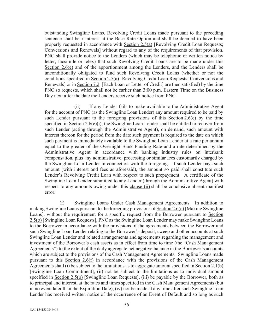 NAI-1541530846v16 56 outstanding Swingline Loans. Revolving Credit Loans made pursuant to the preceding sentence shall bear interest at the Base Rate Option and shall be deemed to have been properly requested in accordance with Section 2.5(a) [Revolving Credit Loan Requests; Conversions and Renewals] without regard to any of the requirements of that provision. PNC shall provide notice to the Lenders (which may be telephonic or written notice by letter, facsimile or telex) that such Revolving Credit Loans are to be made under this Section 2.6(e) and of the apportionment among the Lenders, and the Lenders shall be unconditionally obligated to fund such Revolving Credit Loans (whether or not the conditions specified in Section 2.5(a) [Revolving Credit Loan Requests; Conversions and Renewals] or in Section 7.2 [Each Loan or Letter of Credit] are then satisfied) by the time PNC so requests, which shall not be earlier than 3:00 p.m. Eastern Time on the Business Day next after the date the Lenders receive such notice from PNC. (ii) If any Lender fails to make available to the Administrative Agent for the account of PNC (as the Swingline Loan Lender) any amount required to be paid by such Lender pursuant to the foregoing provisions of this Section 2.6(e) by the time specified in Section 2.6(e)(i), the Swingline Loan Lender shall be entitled to recover from such Lender (acting through the Administrative Agent), on demand, such amount with interest thereon for the period from the date such payment is required to the date on which such payment is immediately available to the Swingline Loan Lender at a rate per annum equal to the greater of the Overnight Bank Funding Rate and a rate determined by the Administrative Agent in accordance with banking industry rules on interbank compensation, plus any administrative, processing or similar fees customarily charged by the Swingline Loan Lender in connection with the foregoing. If such Lender pays such amount (with interest and fees as aforesaid), the amount so paid shall constitute such Lender’s Revolving Credit Loan with respect to such prepayment. A certificate of the Swingline Loan Lender submitted to any Lender (through the Administrative Agent) with respect to any amounts owing under this clause (ii) shall be conclusive absent manifest error. (f) Swingline Loans Under Cash Management Agreements. In addition to making Swingline Loans pursuant to the foregoing provisions of Section 2.6(c) [Making Swingline Loans], without the requirement for a specific request from the Borrower pursuant to Section 2.5(b) [Swingline Loan Requests], PNC as the Swingline Loan Lender may make Swingline Loans to the Borrower in accordance with the provisions of the agreements between the Borrower and such Swingline Loan Lender relating to the Borrower’s deposit, sweep and other accounts at such Swingline Loan Lender and related arrangements and agreements regarding the management and investment of the Borrower’s cash assets as in effect from time to time (the “Cash Management Agreements”) to the extent of the daily aggregate net negative balance in the Borrower’s accounts which are subject to the provisions of the Cash Management Agreements. Swingline Loans made pursuant to this Section 2.6(f) in accordance with the provisions of the Cash Management Agreements shall (i) be subject to the limitations as to aggregate amount specified in Section 2.1(b) [Swingline Loan Commitment], (ii) not be subject to the limitations as to individual amount specified in Section 2.5(b) [Swingline Loan Requests], (iii) be payable by the Borrower, both as to principal and interest, at the rates and times specified in the Cash Management Agreements (but in no event later than the Expiration Date), (iv) not be made at any time after such Swingline Loan Lender has received written notice of the occurrence of an Event of Default and so long as such