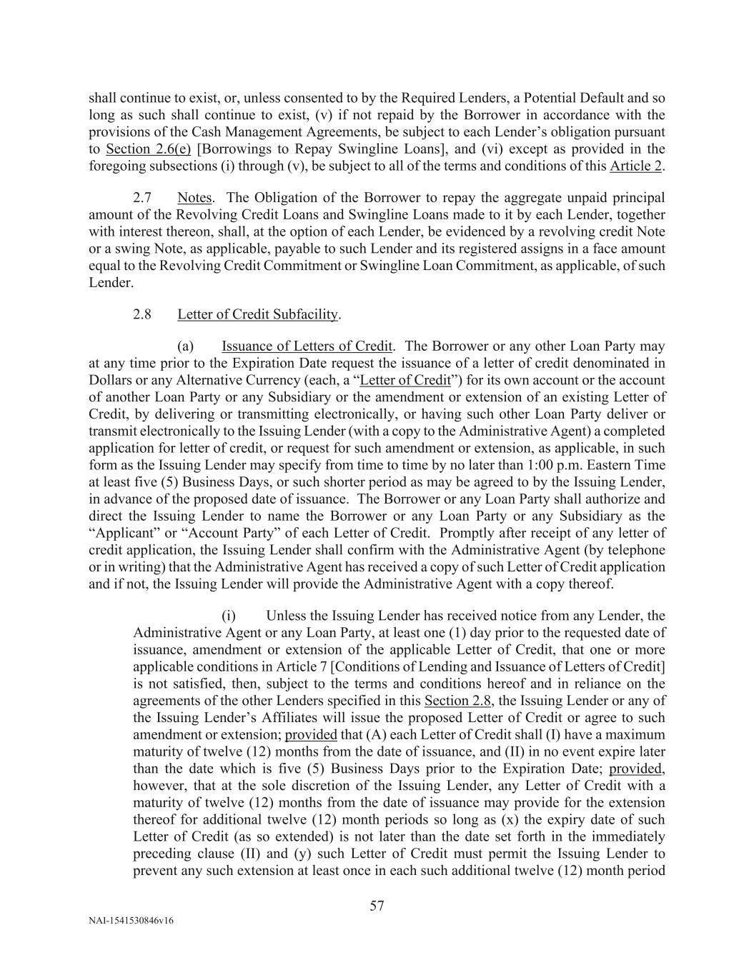 NAI-1541530846v16 57 shall continue to exist, or, unless consented to by the Required Lenders, a Potential Default and so long as such shall continue to exist, (v) if not repaid by the Borrower in accordance with the provisions of the Cash Management Agreements, be subject to each Lender’s obligation pursuant to Section 2.6(e) [Borrowings to Repay Swingline Loans], and (vi) except as provided in the foregoing subsections (i) through (v), be subject to all of the terms and conditions of this Article 2. 2.7 Notes. The Obligation of the Borrower to repay the aggregate unpaid principal amount of the Revolving Credit Loans and Swingline Loans made to it by each Lender, together with interest thereon, shall, at the option of each Lender, be evidenced by a revolving credit Note or a swing Note, as applicable, payable to such Lender and its registered assigns in a face amount equal to the Revolving Credit Commitment or Swingline Loan Commitment, as applicable, of such Lender. 2.8 Letter of Credit Subfacility. (a) Issuance of Letters of Credit. The Borrower or any other Loan Party may at any time prior to the Expiration Date request the issuance of a letter of credit denominated in Dollars or any Alternative Currency (each, a “Letter of Credit”) for its own account or the account of another Loan Party or any Subsidiary or the amendment or extension of an existing Letter of Credit, by delivering or transmitting electronically, or having such other Loan Party deliver or transmit electronically to the Issuing Lender (with a copy to the Administrative Agent) a completed application for letter of credit, or request for such amendment or extension, as applicable, in such form as the Issuing Lender may specify from time to time by no later than 1:00 p.m. Eastern Time at least five (5) Business Days, or such shorter period as may be agreed to by the Issuing Lender, in advance of the proposed date of issuance. The Borrower or any Loan Party shall authorize and direct the Issuing Lender to name the Borrower or any Loan Party or any Subsidiary as the “Applicant” or “Account Party” of each Letter of Credit. Promptly after receipt of any letter of credit application, the Issuing Lender shall confirm with the Administrative Agent (by telephone or in writing) that the Administrative Agent has received a copy of such Letter of Credit application and if not, the Issuing Lender will provide the Administrative Agent with a copy thereof. (i) Unless the Issuing Lender has received notice from any Lender, the Administrative Agent or any Loan Party, at least one (1) day prior to the requested date of issuance, amendment or extension of the applicable Letter of Credit, that one or more applicable conditions in Article 7 [Conditions of Lending and Issuance of Letters of Credit] is not satisfied, then, subject to the terms and conditions hereof and in reliance on the agreements of the other Lenders specified in this Section 2.8, the Issuing Lender or any of the Issuing Lender’s Affiliates will issue the proposed Letter of Credit or agree to such amendment or extension; provided that (A) each Letter of Credit shall (I) have a maximum maturity of twelve (12) months from the date of issuance, and (II) in no event expire later than the date which is five (5) Business Days prior to the Expiration Date; provided, however, that at the sole discretion of the Issuing Lender, any Letter of Credit with a maturity of twelve (12) months from the date of issuance may provide for the extension thereof for additional twelve (12) month periods so long as (x) the expiry date of such Letter of Credit (as so extended) is not later than the date set forth in the immediately preceding clause (II) and (y) such Letter of Credit must permit the Issuing Lender to prevent any such extension at least once in each such additional twelve (12) month period