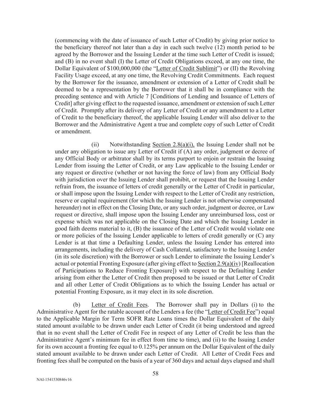NAI-1541530846v16 58 (commencing with the date of issuance of such Letter of Credit) by giving prior notice to the beneficiary thereof not later than a day in each such twelve (12) month period to be agreed by the Borrower and the Issuing Lender at the time such Letter of Credit is issued; and (B) in no event shall (I) the Letter of Credit Obligations exceed, at any one time, the Dollar Equivalent of $100,000,000 (the “Letter of Credit Sublimit”) or (II) the Revolving Facility Usage exceed, at any one time, the Revolving Credit Commitments. Each request by the Borrower for the issuance, amendment or extension of a Letter of Credit shall be deemed to be a representation by the Borrower that it shall be in compliance with the preceding sentence and with Article 7 [Conditions of Lending and Issuance of Letters of Credit] after giving effect to the requested issuance, amendment or extension of such Letter of Credit. Promptly after its delivery of any Letter of Credit or any amendment to a Letter of Credit to the beneficiary thereof, the applicable Issuing Lender will also deliver to the Borrower and the Administrative Agent a true and complete copy of such Letter of Credit or amendment. (ii) Notwithstanding Section 2.8(a)(i), the Issuing Lender shall not be under any obligation to issue any Letter of Credit if (A) any order, judgment or decree of any Official Body or arbitrator shall by its terms purport to enjoin or restrain the Issuing Lender from issuing the Letter of Credit, or any Law applicable to the Issuing Lender or any request or directive (whether or not having the force of law) from any Official Body with jurisdiction over the Issuing Lender shall prohibit, or request that the Issuing Lender refrain from, the issuance of letters of credit generally or the Letter of Credit in particular, or shall impose upon the Issuing Lender with respect to the Letter of Credit any restriction, reserve or capital requirement (for which the Issuing Lender is not otherwise compensated hereunder) not in effect on the Closing Date, or any such order, judgment or decree, or Law request or directive, shall impose upon the Issuing Lender any unreimbursed loss, cost or expense which was not applicable on the Closing Date and which the Issuing Lender in good faith deems material to it, (B) the issuance of the Letter of Credit would violate one or more policies of the Issuing Lender applicable to letters of credit generally or (C) any Lender is at that time a Defaulting Lender, unless the Issuing Lender has entered into arrangements, including the delivery of Cash Collateral, satisfactory to the Issuing Lender (in its sole discretion) with the Borrower or such Lender to eliminate the Issuing Lender’s actual or potential Fronting Exposure (after giving effect to Section 2.9(a)(iv) [Reallocation of Participations to Reduce Fronting Exposure]) with respect to the Defaulting Lender arising from either the Letter of Credit then proposed to be issued or that Letter of Credit and all other Letter of Credit Obligations as to which the Issuing Lender has actual or potential Fronting Exposure, as it may elect in its sole discretion. (b) Letter of Credit Fees. The Borrower shall pay in Dollars (i) to the Administrative Agent for the ratable account of the Lenders a fee (the “Letter of Credit Fee”) equal to the Applicable Margin for Term SOFR Rate Loans times the Dollar Equivalent of the daily stated amount available to be drawn under each Letter of Credit (it being understood and agreed that in no event shall the Letter of Credit Fee in respect of any Letter of Credit be less than the Administrative Agent’s minimum fee in effect from time to time), and (ii) to the Issuing Lender for its own account a fronting fee equal to 0.125% per annum on the Dollar Equivalent of the daily stated amount available to be drawn under each Letter of Credit. All Letter of Credit Fees and fronting fees shall be computed on the basis of a year of 360 days and actual days elapsed and shall