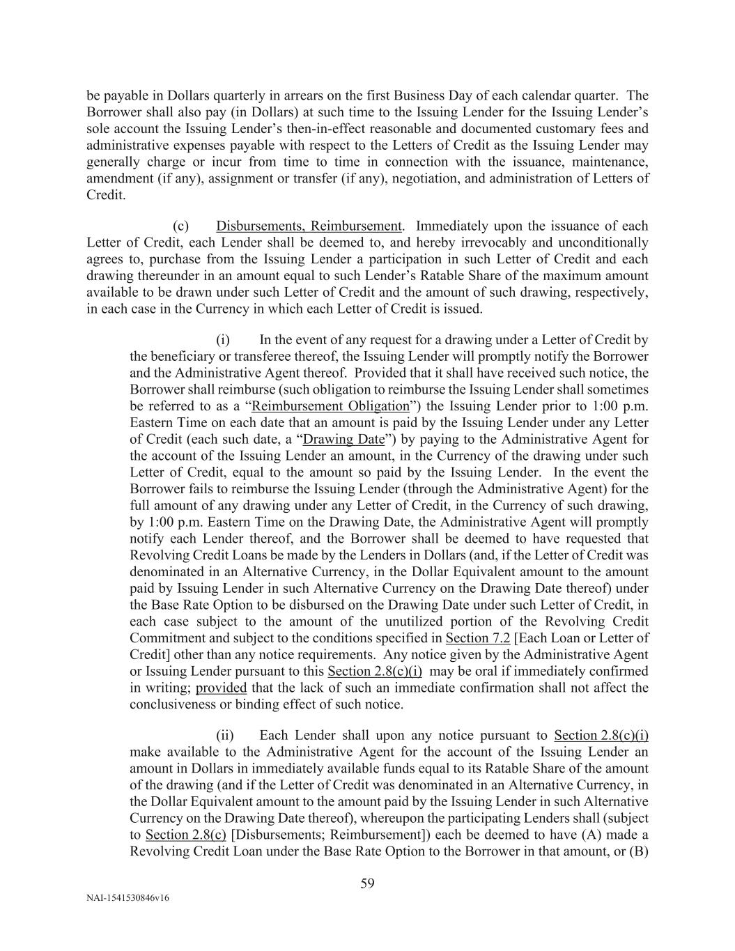 NAI-1541530846v16 59 be payable in Dollars quarterly in arrears on the first Business Day of each calendar quarter. The Borrower shall also pay (in Dollars) at such time to the Issuing Lender for the Issuing Lender’s sole account the Issuing Lender’s then-in-effect reasonable and documented customary fees and administrative expenses payable with respect to the Letters of Credit as the Issuing Lender may generally charge or incur from time to time in connection with the issuance, maintenance, amendment (if any), assignment or transfer (if any), negotiation, and administration of Letters of Credit. (c) Disbursements, Reimbursement. Immediately upon the issuance of each Letter of Credit, each Lender shall be deemed to, and hereby irrevocably and unconditionally agrees to, purchase from the Issuing Lender a participation in such Letter of Credit and each drawing thereunder in an amount equal to such Lender’s Ratable Share of the maximum amount available to be drawn under such Letter of Credit and the amount of such drawing, respectively, in each case in the Currency in which each Letter of Credit is issued. (i) In the event of any request for a drawing under a Letter of Credit by the beneficiary or transferee thereof, the Issuing Lender will promptly notify the Borrower and the Administrative Agent thereof. Provided that it shall have received such notice, the Borrower shall reimburse (such obligation to reimburse the Issuing Lender shall sometimes be referred to as a “Reimbursement Obligation”) the Issuing Lender prior to 1:00 p.m. Eastern Time on each date that an amount is paid by the Issuing Lender under any Letter of Credit (each such date, a “Drawing Date”) by paying to the Administrative Agent for the account of the Issuing Lender an amount, in the Currency of the drawing under such Letter of Credit, equal to the amount so paid by the Issuing Lender. In the event the Borrower fails to reimburse the Issuing Lender (through the Administrative Agent) for the full amount of any drawing under any Letter of Credit, in the Currency of such drawing, by 1:00 p.m. Eastern Time on the Drawing Date, the Administrative Agent will promptly notify each Lender thereof, and the Borrower shall be deemed to have requested that Revolving Credit Loans be made by the Lenders in Dollars (and, if the Letter of Credit was denominated in an Alternative Currency, in the Dollar Equivalent amount to the amount paid by Issuing Lender in such Alternative Currency on the Drawing Date thereof) under the Base Rate Option to be disbursed on the Drawing Date under such Letter of Credit, in each case subject to the amount of the unutilized portion of the Revolving Credit Commitment and subject to the conditions specified in Section 7.2 [Each Loan or Letter of Credit] other than any notice requirements. Any notice given by the Administrative Agent or Issuing Lender pursuant to this Section 2.8(c)(i) may be oral if immediately confirmed in writing; provided that the lack of such an immediate confirmation shall not affect the conclusiveness or binding effect of such notice. (ii) Each Lender shall upon any notice pursuant to Section 2.8(c)(i) make available to the Administrative Agent for the account of the Issuing Lender an amount in Dollars in immediately available funds equal to its Ratable Share of the amount of the drawing (and if the Letter of Credit was denominated in an Alternative Currency, in the Dollar Equivalent amount to the amount paid by the Issuing Lender in such Alternative Currency on the Drawing Date thereof), whereupon the participating Lenders shall (subject to Section 2.8(c) [Disbursements; Reimbursement]) each be deemed to have (A) made a Revolving Credit Loan under the Base Rate Option to the Borrower in that amount, or (B)