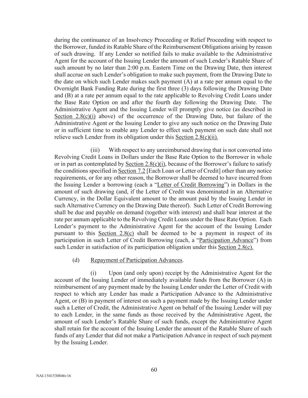 NAI-1541530846v16 60 during the continuance of an Insolvency Proceeding or Relief Proceeding with respect to the Borrower, funded its Ratable Share of the Reimbursement Obligations arising by reason of such drawing. If any Lender so notified fails to make available to the Administrative Agent for the account of the Issuing Lender the amount of such Lender’s Ratable Share of such amount by no later than 2:00 p.m. Eastern Time on the Drawing Date, then interest shall accrue on such Lender’s obligation to make such payment, from the Drawing Date to the date on which such Lender makes such payment (A) at a rate per annum equal to the Overnight Bank Funding Rate during the first three (3) days following the Drawing Date and (B) at a rate per annum equal to the rate applicable to Revolving Credit Loans under the Base Rate Option on and after the fourth day following the Drawing Date. The Administrative Agent and the Issuing Lender will promptly give notice (as described in Section 2.8(c)(i) above) of the occurrence of the Drawing Date, but failure of the Administrative Agent or the Issuing Lender to give any such notice on the Drawing Date or in sufficient time to enable any Lender to effect such payment on such date shall not relieve such Lender from its obligation under this Section 2.8(c)(ii). (iii) With respect to any unreimbursed drawing that is not converted into Revolving Credit Loans in Dollars under the Base Rate Option to the Borrower in whole or in part as contemplated by Section 2.8(c)(i), because of the Borrower’s failure to satisfy the conditions specified in Section 7.2 [Each Loan or Letter of Credit] other than any notice requirements, or for any other reason, the Borrower shall be deemed to have incurred from the Issuing Lender a borrowing (each a “Letter of Credit Borrowing”) in Dollars in the amount of such drawing (and, if the Letter of Credit was denominated in an Alternative Currency, in the Dollar Equivalent amount to the amount paid by the Issuing Lender in such Alternative Currency on the Drawing Date thereof). Such Letter of Credit Borrowing shall be due and payable on demand (together with interest) and shall bear interest at the rate per annum applicable to the Revolving Credit Loans under the Base Rate Option. Each Lender’s payment to the Administrative Agent for the account of the Issuing Lender pursuant to this Section 2.8(c) shall be deemed to be a payment in respect of its participation in such Letter of Credit Borrowing (each, a “Participation Advance”) from such Lender in satisfaction of its participation obligation under this Section 2.8(c). (d) Repayment of Participation Advances. (i) Upon (and only upon) receipt by the Administrative Agent for the account of the Issuing Lender of immediately available funds from the Borrower (A) in reimbursement of any payment made by the Issuing Lender under the Letter of Credit with respect to which any Lender has made a Participation Advance to the Administrative Agent, or (B) in payment of interest on such a payment made by the Issuing Lender under such a Letter of Credit, the Administrative Agent on behalf of the Issuing Lender will pay to each Lender, in the same funds as those received by the Administrative Agent, the amount of such Lender’s Ratable Share of such funds, except the Administrative Agent shall retain for the account of the Issuing Lender the amount of the Ratable Share of such funds of any Lender that did not make a Participation Advance in respect of such payment by the Issuing Lender.
