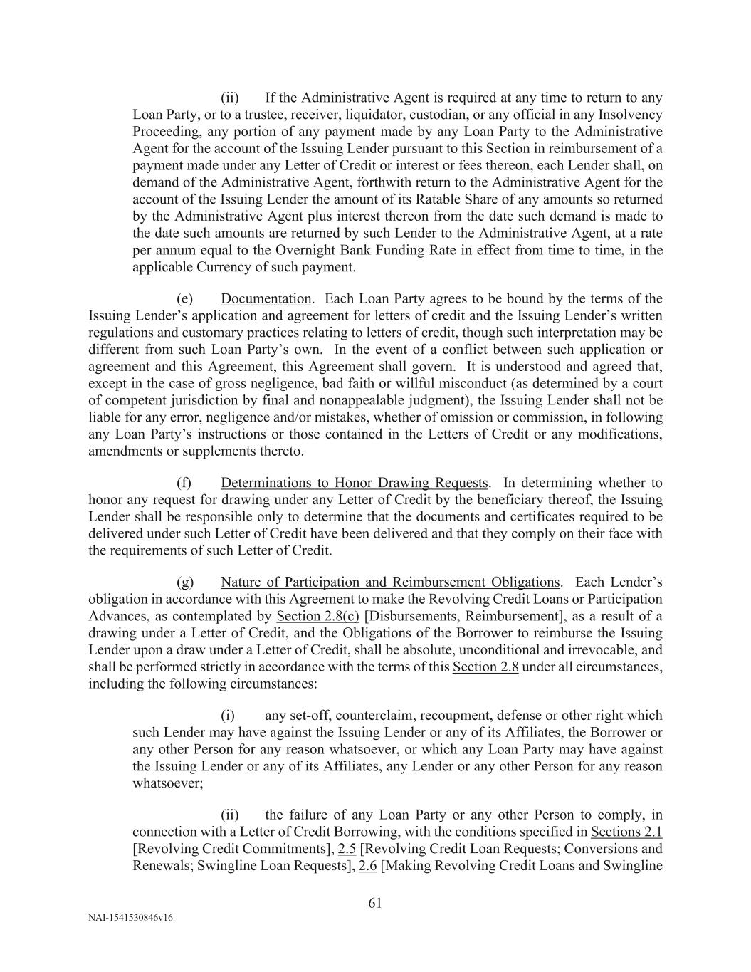 NAI-1541530846v16 61 (ii) If the Administrative Agent is required at any time to return to any Loan Party, or to a trustee, receiver, liquidator, custodian, or any official in any Insolvency Proceeding, any portion of any payment made by any Loan Party to the Administrative Agent for the account of the Issuing Lender pursuant to this Section in reimbursement of a payment made under any Letter of Credit or interest or fees thereon, each Lender shall, on demand of the Administrative Agent, forthwith return to the Administrative Agent for the account of the Issuing Lender the amount of its Ratable Share of any amounts so returned by the Administrative Agent plus interest thereon from the date such demand is made to the date such amounts are returned by such Lender to the Administrative Agent, at a rate per annum equal to the Overnight Bank Funding Rate in effect from time to time, in the applicable Currency of such payment. (e) Documentation. Each Loan Party agrees to be bound by the terms of the Issuing Lender’s application and agreement for letters of credit and the Issuing Lender’s written regulations and customary practices relating to letters of credit, though such interpretation may be different from such Loan Party’s own. In the event of a conflict between such application or agreement and this Agreement, this Agreement shall govern. It is understood and agreed that, except in the case of gross negligence, bad faith or willful misconduct (as determined by a court of competent jurisdiction by final and nonappealable judgment), the Issuing Lender shall not be liable for any error, negligence and/or mistakes, whether of omission or commission, in following any Loan Party’s instructions or those contained in the Letters of Credit or any modifications, amendments or supplements thereto. (f) Determinations to Honor Drawing Requests. In determining whether to honor any request for drawing under any Letter of Credit by the beneficiary thereof, the Issuing Lender shall be responsible only to determine that the documents and certificates required to be delivered under such Letter of Credit have been delivered and that they comply on their face with the requirements of such Letter of Credit. (g) Nature of Participation and Reimbursement Obligations. Each Lender’s obligation in accordance with this Agreement to make the Revolving Credit Loans or Participation Advances, as contemplated by Section 2.8(c) [Disbursements, Reimbursement], as a result of a drawing under a Letter of Credit, and the Obligations of the Borrower to reimburse the Issuing Lender upon a draw under a Letter of Credit, shall be absolute, unconditional and irrevocable, and shall be performed strictly in accordance with the terms of this Section 2.8 under all circumstances, including the following circumstances: (i) any set-off, counterclaim, recoupment, defense or other right which such Lender may have against the Issuing Lender or any of its Affiliates, the Borrower or any other Person for any reason whatsoever, or which any Loan Party may have against the Issuing Lender or any of its Affiliates, any Lender or any other Person for any reason whatsoever; (ii) the failure of any Loan Party or any other Person to comply, in connection with a Letter of Credit Borrowing, with the conditions specified in Sections 2.1 [Revolving Credit Commitments], 2.5 [Revolving Credit Loan Requests; Conversions and Renewals; Swingline Loan Requests], 2.6 [Making Revolving Credit Loans and Swingline