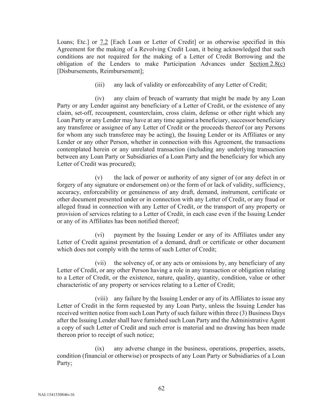 NAI-1541530846v16 62 Loans; Etc.] or 7.2 [Each Loan or Letter of Credit] or as otherwise specified in this Agreement for the making of a Revolving Credit Loan, it being acknowledged that such conditions are not required for the making of a Letter of Credit Borrowing and the obligation of the Lenders to make Participation Advances under Section 2.8(c) [Disbursements, Reimbursement]; (iii) any lack of validity or enforceability of any Letter of Credit; (iv) any claim of breach of warranty that might be made by any Loan Party or any Lender against any beneficiary of a Letter of Credit, or the existence of any claim, set-off, recoupment, counterclaim, cross claim, defense or other right which any Loan Party or any Lender may have at any time against a beneficiary, successor beneficiary any transferee or assignee of any Letter of Credit or the proceeds thereof (or any Persons for whom any such transferee may be acting), the Issuing Lender or its Affiliates or any Lender or any other Person, whether in connection with this Agreement, the transactions contemplated herein or any unrelated transaction (including any underlying transaction between any Loan Party or Subsidiaries of a Loan Party and the beneficiary for which any Letter of Credit was procured); (v) the lack of power or authority of any signer of (or any defect in or forgery of any signature or endorsement on) or the form of or lack of validity, sufficiency, accuracy, enforceability or genuineness of any draft, demand, instrument, certificate or other document presented under or in connection with any Letter of Credit, or any fraud or alleged fraud in connection with any Letter of Credit, or the transport of any property or provision of services relating to a Letter of Credit, in each case even if the Issuing Lender or any of its Affiliates has been notified thereof; (vi) payment by the Issuing Lender or any of its Affiliates under any Letter of Credit against presentation of a demand, draft or certificate or other document which does not comply with the terms of such Letter of Credit; (vii) the solvency of, or any acts or omissions by, any beneficiary of any Letter of Credit, or any other Person having a role in any transaction or obligation relating to a Letter of Credit, or the existence, nature, quality, quantity, condition, value or other characteristic of any property or services relating to a Letter of Credit; (viii) any failure by the Issuing Lender or any of its Affiliates to issue any Letter of Credit in the form requested by any Loan Party, unless the Issuing Lender has received written notice from such Loan Party of such failure within three (3) Business Days after the Issuing Lender shall have furnished such Loan Party and the Administrative Agent a copy of such Letter of Credit and such error is material and no drawing has been made thereon prior to receipt of such notice; (ix) any adverse change in the business, operations, properties, assets, condition (financial or otherwise) or prospects of any Loan Party or Subsidiaries of a Loan Party;