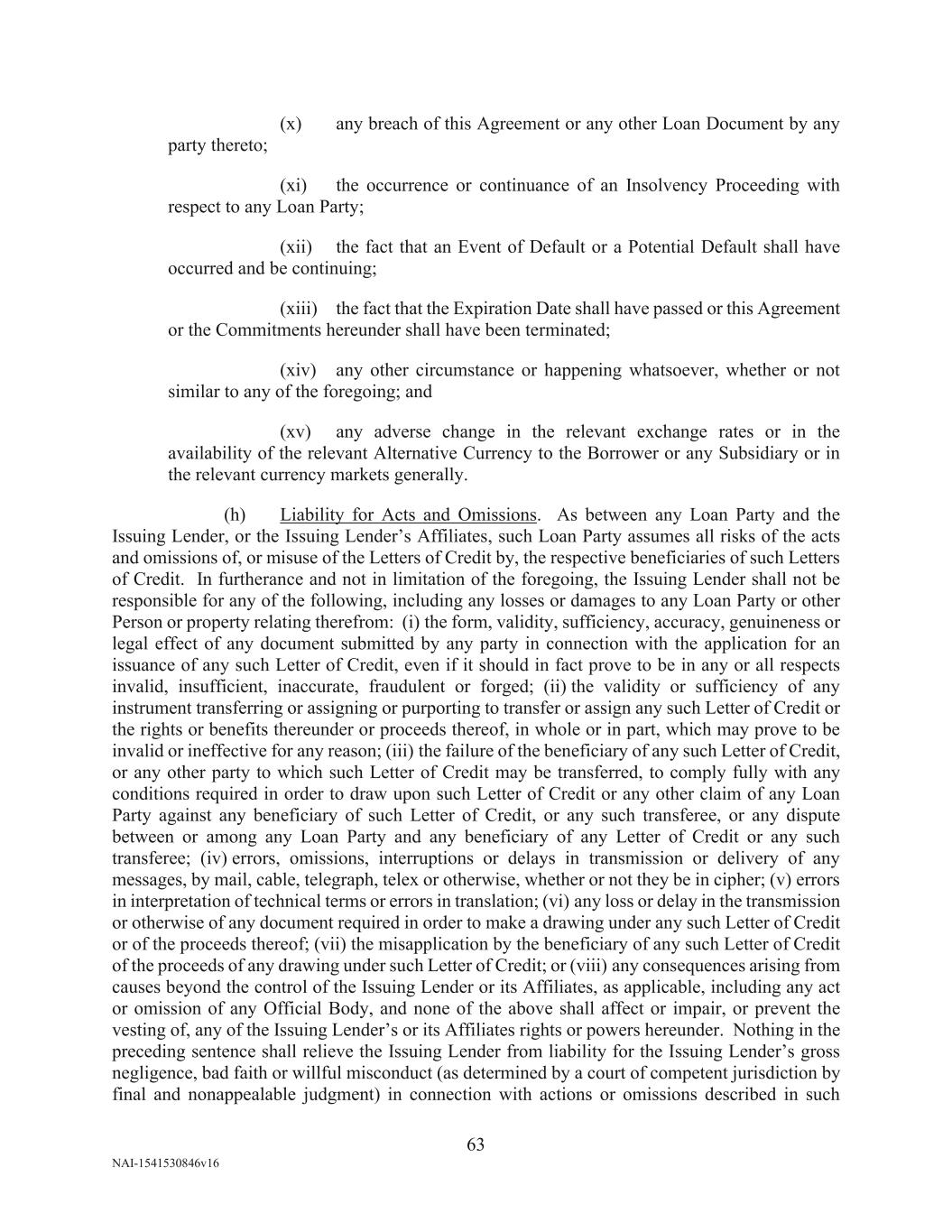 NAI-1541530846v16 63 (x) any breach of this Agreement or any other Loan Document by any party thereto; (xi) the occurrence or continuance of an Insolvency Proceeding with respect to any Loan Party; (xii) the fact that an Event of Default or a Potential Default shall have occurred and be continuing; (xiii) the fact that the Expiration Date shall have passed or this Agreement or the Commitments hereunder shall have been terminated; (xiv) any other circumstance or happening whatsoever, whether or not similar to any of the foregoing; and (xv) any adverse change in the relevant exchange rates or in the availability of the relevant Alternative Currency to the Borrower or any Subsidiary or in the relevant currency markets generally. (h) Liability for Acts and Omissions. As between any Loan Party and the Issuing Lender, or the Issuing Lender’s Affiliates, such Loan Party assumes all risks of the acts and omissions of, or misuse of the Letters of Credit by, the respective beneficiaries of such Letters of Credit. In furtherance and not in limitation of the foregoing, the Issuing Lender shall not be responsible for any of the following, including any losses or damages to any Loan Party or other Person or property relating therefrom: (i) the form, validity, sufficiency, accuracy, genuineness or legal effect of any document submitted by any party in connection with the application for an issuance of any such Letter of Credit, even if it should in fact prove to be in any or all respects invalid, insufficient, inaccurate, fraudulent or forged; (ii) the validity or sufficiency of any instrument transferring or assigning or purporting to transfer or assign any such Letter of Credit or the rights or benefits thereunder or proceeds thereof, in whole or in part, which may prove to be invalid or ineffective for any reason; (iii) the failure of the beneficiary of any such Letter of Credit, or any other party to which such Letter of Credit may be transferred, to comply fully with any conditions required in order to draw upon such Letter of Credit or any other claim of any Loan Party against any beneficiary of such Letter of Credit, or any such transferee, or any dispute between or among any Loan Party and any beneficiary of any Letter of Credit or any such transferee; (iv) errors, omissions, interruptions or delays in transmission or delivery of any messages, by mail, cable, telegraph, telex or otherwise, whether or not they be in cipher; (v) errors in interpretation of technical terms or errors in translation; (vi) any loss or delay in the transmission or otherwise of any document required in order to make a drawing under any such Letter of Credit or of the proceeds thereof; (vii) the misapplication by the beneficiary of any such Letter of Credit of the proceeds of any drawing under such Letter of Credit; or (viii) any consequences arising from causes beyond the control of the Issuing Lender or its Affiliates, as applicable, including any act or omission of any Official Body, and none of the above shall affect or impair, or prevent the vesting of, any of the Issuing Lender’s or its Affiliates rights or powers hereunder. Nothing in the preceding sentence shall relieve the Issuing Lender from liability for the Issuing Lender’s gross negligence, bad faith or willful misconduct (as determined by a court of competent jurisdiction by final and nonappealable judgment) in connection with actions or omissions described in such