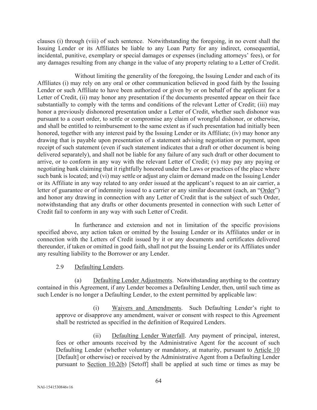 NAI-1541530846v16 64 clauses (i) through (viii) of such sentence. Notwithstanding the foregoing, in no event shall the Issuing Lender or its Affiliates be liable to any Loan Party for any indirect, consequential, incidental, punitive, exemplary or special damages or expenses (including attorneys’ fees), or for any damages resulting from any change in the value of any property relating to a Letter of Credit. Without limiting the generality of the foregoing, the Issuing Lender and each of its Affiliates (i) may rely on any oral or other communication believed in good faith by the Issuing Lender or such Affiliate to have been authorized or given by or on behalf of the applicant for a Letter of Credit, (ii) may honor any presentation if the documents presented appear on their face substantially to comply with the terms and conditions of the relevant Letter of Credit; (iii) may honor a previously dishonored presentation under a Letter of Credit, whether such dishonor was pursuant to a court order, to settle or compromise any claim of wrongful dishonor, or otherwise, and shall be entitled to reimbursement to the same extent as if such presentation had initially been honored, together with any interest paid by the Issuing Lender or its Affiliate; (iv) may honor any drawing that is payable upon presentation of a statement advising negotiation or payment, upon receipt of such statement (even if such statement indicates that a draft or other document is being delivered separately), and shall not be liable for any failure of any such draft or other document to arrive, or to conform in any way with the relevant Letter of Credit; (v) may pay any paying or negotiating bank claiming that it rightfully honored under the Laws or practices of the place where such bank is located; and (vi) may settle or adjust any claim or demand made on the Issuing Lender or its Affiliate in any way related to any order issued at the applicant’s request to an air carrier, a letter of guarantee or of indemnity issued to a carrier or any similar document (each, an “Order”) and honor any drawing in connection with any Letter of Credit that is the subject of such Order, notwithstanding that any drafts or other documents presented in connection with such Letter of Credit fail to conform in any way with such Letter of Credit. In furtherance and extension and not in limitation of the specific provisions specified above, any action taken or omitted by the Issuing Lender or its Affiliates under or in connection with the Letters of Credit issued by it or any documents and certificates delivered thereunder, if taken or omitted in good faith, shall not put the Issuing Lender or its Affiliates under any resulting liability to the Borrower or any Lender. 2.9 Defaulting Lenders. (a) Defaulting Lender Adjustments. Notwithstanding anything to the contrary contained in this Agreement, if any Lender becomes a Defaulting Lender, then, until such time as such Lender is no longer a Defaulting Lender, to the extent permitted by applicable law: (i) Waivers and Amendments. Such Defaulting Lender’s right to approve or disapprove any amendment, waiver or consent with respect to this Agreement shall be restricted as specified in the definition of Required Lenders. (ii) Defaulting Lender Waterfall. Any payment of principal, interest, fees or other amounts received by the Administrative Agent for the account of such Defaulting Lender (whether voluntary or mandatory, at maturity, pursuant to Article 10 [Default] or otherwise) or received by the Administrative Agent from a Defaulting Lender pursuant to Section 10.2(b) [Setoff] shall be applied at such time or times as may be