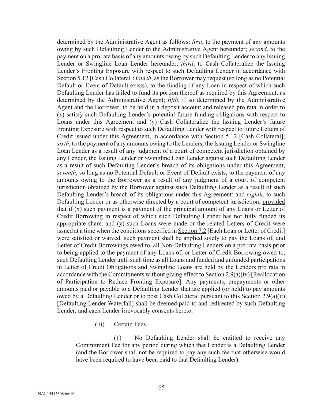 NAI-1541530846v16 65 determined by the Administrative Agent as follows: first, to the payment of any amounts owing by such Defaulting Lender to the Administrative Agent hereunder; second, to the payment on a pro rata basis of any amounts owing by such Defaulting Lender to any Issuing Lender or Swingline Loan Lender hereunder; third, to Cash Collateralize the Issuing Lender’s Fronting Exposure with respect to such Defaulting Lender in accordance with Section 5.12 [Cash Collateral]; fourth, as the Borrower may request (so long as no Potential Default or Event of Default exists), to the funding of any Loan in respect of which such Defaulting Lender has failed to fund its portion thereof as required by this Agreement, as determined by the Administrative Agent; fifth, if so determined by the Administrative Agent and the Borrower, to be held in a deposit account and released pro rata in order to (x) satisfy such Defaulting Lender’s potential future funding obligations with respect to Loans under this Agreement and (y) Cash Collateralize the Issuing Lender’s future Fronting Exposure with respect to such Defaulting Lender with respect to future Letters of Credit issued under this Agreement, in accordance with Section 5.12 [Cash Collateral]; sixth, to the payment of any amounts owing to the Lenders, the Issuing Lender or Swingline Loan Lender as a result of any judgment of a court of competent jurisdiction obtained by any Lender, the Issuing Lender or Swingline Loan Lender against such Defaulting Lender as a result of such Defaulting Lender’s breach of its obligations under this Agreement; seventh, so long as no Potential Default or Event of Default exists, to the payment of any amounts owing to the Borrower as a result of any judgment of a court of competent jurisdiction obtained by the Borrower against such Defaulting Lender as a result of such Defaulting Lender’s breach of its obligations under this Agreement; and eighth, to such Defaulting Lender or as otherwise directed by a court of competent jurisdiction; provided that if (x) such payment is a payment of the principal amount of any Loans or Letter of Credit Borrowing in respect of which such Defaulting Lender has not fully funded its appropriate share, and (y) such Loans were made or the related Letters of Credit were issued at a time when the conditions specified in Section 7.2 [Each Loan or Letter of Credit] were satisfied or waived, such payment shall be applied solely to pay the Loans of, and Letter of Credit Borrowings owed to, all Non-Defaulting Lenders on a pro rata basis prior to being applied to the payment of any Loans of, or Letter of Credit Borrowing owed to, such Defaulting Lender until such time as all Loans and funded and unfunded participations in Letter of Credit Obligations and Swingline Loans are held by the Lenders pro rata in accordance with the Commitments without giving effect to Section 2.9(a)(iv) [Reallocation of Participation to Reduce Fronting Exposure]. Any payments, prepayments or other amounts paid or payable to a Defaulting Lender that are applied (or held) to pay amounts owed by a Defaulting Lender or to post Cash Collateral pursuant to this Section 2.9(a)(ii) [Defaulting Lender Waterfall] shall be deemed paid to and redirected by such Defaulting Lender, and each Lender irrevocably consents hereto. (iii) Certain Fees. (1) No Defaulting Lender shall be entitled to receive any Commitment Fee for any period during which that Lender is a Defaulting Lender (and the Borrower shall not be required to pay any such fee that otherwise would have been required to have been paid to that Defaulting Lender).