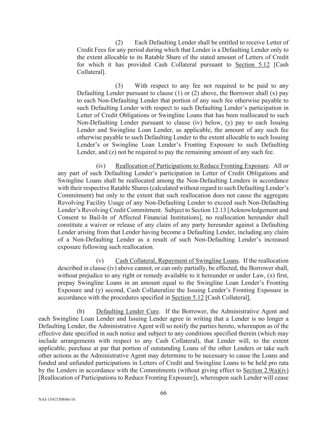 NAI-1541530846v16 66 (2) Each Defaulting Lender shall be entitled to receive Letter of Credit Fees for any period during which that Lender is a Defaulting Lender only to the extent allocable to its Ratable Share of the stated amount of Letters of Credit for which it has provided Cash Collateral pursuant to Section 5.12 [Cash Collateral]. (3) With respect to any fee not required to be paid to any Defaulting Lender pursuant to clause (1) or (2) above, the Borrower shall (x) pay to each Non-Defaulting Lender that portion of any such fee otherwise payable to such Defaulting Lender with respect to such Defaulting Lender’s participation in Letter of Credit Obligations or Swingline Loans that has been reallocated to such Non-Defaulting Lender pursuant to clause (iv) below, (y) pay to each Issuing Lender and Swingline Loan Lender, as applicable, the amount of any such fee otherwise payable to such Defaulting Lender to the extent allocable to such Issuing Lender’s or Swingline Loan Lender’s Fronting Exposure to such Defaulting Lender, and (z) not be required to pay the remaining amount of any such fee. (iv) Reallocation of Participations to Reduce Fronting Exposure. All or any part of such Defaulting Lender’s participation in Letter of Credit Obligations and Swingline Loans shall be reallocated among the Non-Defaulting Lenders in accordance with their respective Ratable Shares (calculated without regard to such Defaulting Lender’s Commitment) but only to the extent that such reallocation does not cause the aggregate Revolving Facility Usage of any Non-Defaulting Lender to exceed such Non-Defaulting Lender’s Revolving Credit Commitment. Subject to Section 12.13 [Acknowledgement and Consent to Bail-In of Affected Financial Institutions], no reallocation hereunder shall constitute a waiver or release of any claim of any party hereunder against a Defaulting Lender arising from that Lender having become a Defaulting Lender, including any claim of a Non-Defaulting Lender as a result of such Non-Defaulting Lender’s increased exposure following such reallocation. (v) Cash Collateral, Repayment of Swingline Loans. If the reallocation described in clause (iv) above cannot, or can only partially, be effected, the Borrower shall, without prejudice to any right or remedy available to it hereunder or under Law, (x) first, prepay Swingline Loans in an amount equal to the Swingline Loan Lender’s Fronting Exposure and (y) second, Cash Collateralize the Issuing Lender’s Fronting Exposure in accordance with the procedures specified in Section 5.12 [Cash Collateral]. (b) Defaulting Lender Cure. If the Borrower, the Administrative Agent and each Swingline Loan Lender and Issuing Lender agree in writing that a Lender is no longer a Defaulting Lender, the Administrative Agent will so notify the parties hereto, whereupon as of the effective date specified in such notice and subject to any conditions specified therein (which may include arrangements with respect to any Cash Collateral), that Lender will, to the extent applicable, purchase at par that portion of outstanding Loans of the other Lenders or take such other actions as the Administrative Agent may determine to be necessary to cause the Loans and funded and unfunded participations in Letters of Credit and Swingline Loans to be held pro rata by the Lenders in accordance with the Commitments (without giving effect to Section 2.9(a)(iv) [Reallocation of Participations to Reduce Fronting Exposure]), whereupon such Lender will cease