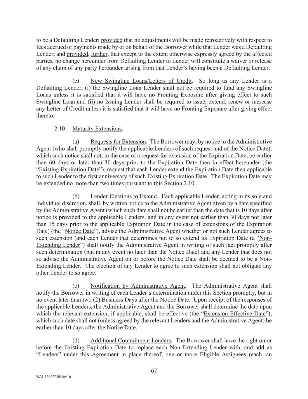 NAI-1541530846v16 67 to be a Defaulting Lender; provided that no adjustments will be made retroactively with respect to fees accrued or payments made by or on behalf of the Borrower while that Lender was a Defaulting Lender; and provided, further, that except to the extent otherwise expressly agreed by the affected parties, no change hereunder from Defaulting Lender to Lender will constitute a waiver or release of any claim of any party hereunder arising from that Lender’s having been a Defaulting Lender. (c) New Swingline Loans/Letters of Credit. So long as any Lender is a Defaulting Lender, (i) the Swingline Loan Lender shall not be required to fund any Swingline Loans unless it is satisfied that it will have no Fronting Exposure after giving effect to such Swingline Loan and (ii) no Issuing Lender shall be required to issue, extend, renew or increase any Letter of Credit unless it is satisfied that it will have no Fronting Exposure after giving effect thereto. 2.10 Maturity Extensions. (a) Requests for Extension. The Borrower may, by notice to the Administrative Agent (who shall promptly notify the applicable Lenders of such request and of the Notice Date), which such notice shall not, in the case of a request for extension of the Expiration Date, be earlier than 60 days or later than 30 days prior to the Expiration Date then in effect hereunder (the “Existing Expiration Date”), request that each Lender extend the Expiration Date then applicable to such Lender to the first anniversary of such Existing Expiration Date. The Expiration Date may be extended no more than two times pursuant to this Section 2.10. (b) Lender Elections to Extend. Each applicable Lender, acting in its sole and individual discretion, shall, by written notice to the Administrative Agent given by a date specified by the Administrative Agent (which such date shall not be earlier than the date that is 10 days after notice is provided to the applicable Lenders, and in any event not earlier than 30 days nor later than 15 days prior to the applicable Expiration Date in the case of extensions of the Expiration Date) (the “Notice Date”), advise the Administrative Agent whether or not such Lender agrees to such extension (and each Lender that determines not to so extend its Expiration Date (a “Non- Extending Lender”) shall notify the Administrative Agent in writing of such fact promptly after such determination (but in any event no later than the Notice Date) and any Lender that does not so advise the Administrative Agent on or before the Notice Date shall be deemed to be a Non- Extending Lender. The election of any Lender to agree to such extension shall not obligate any other Lender to so agree. (c) Notification by Administrative Agent. The Administrative Agent shall notify the Borrower in writing of each Lender’s determination under this Section promptly, but in no event later than two (2) Business Days after the Notice Date. Upon receipt of the responses of the applicable Lenders, the Administrative Agent and the Borrower shall determine the date upon which the relevant extension, if applicable, shall be effective (the “Extension Effective Date”), which such date shall not (unless agreed by the relevant Lenders and the Administrative Agent) be earlier than 10 days after the Notice Date. (d) Additional Commitment Lenders. The Borrower shall have the right on or before the Existing Expiration Date to replace each Non-Extending Lender with, and add as “Lenders” under this Agreement in place thereof, one or more Eligible Assignees (each, an