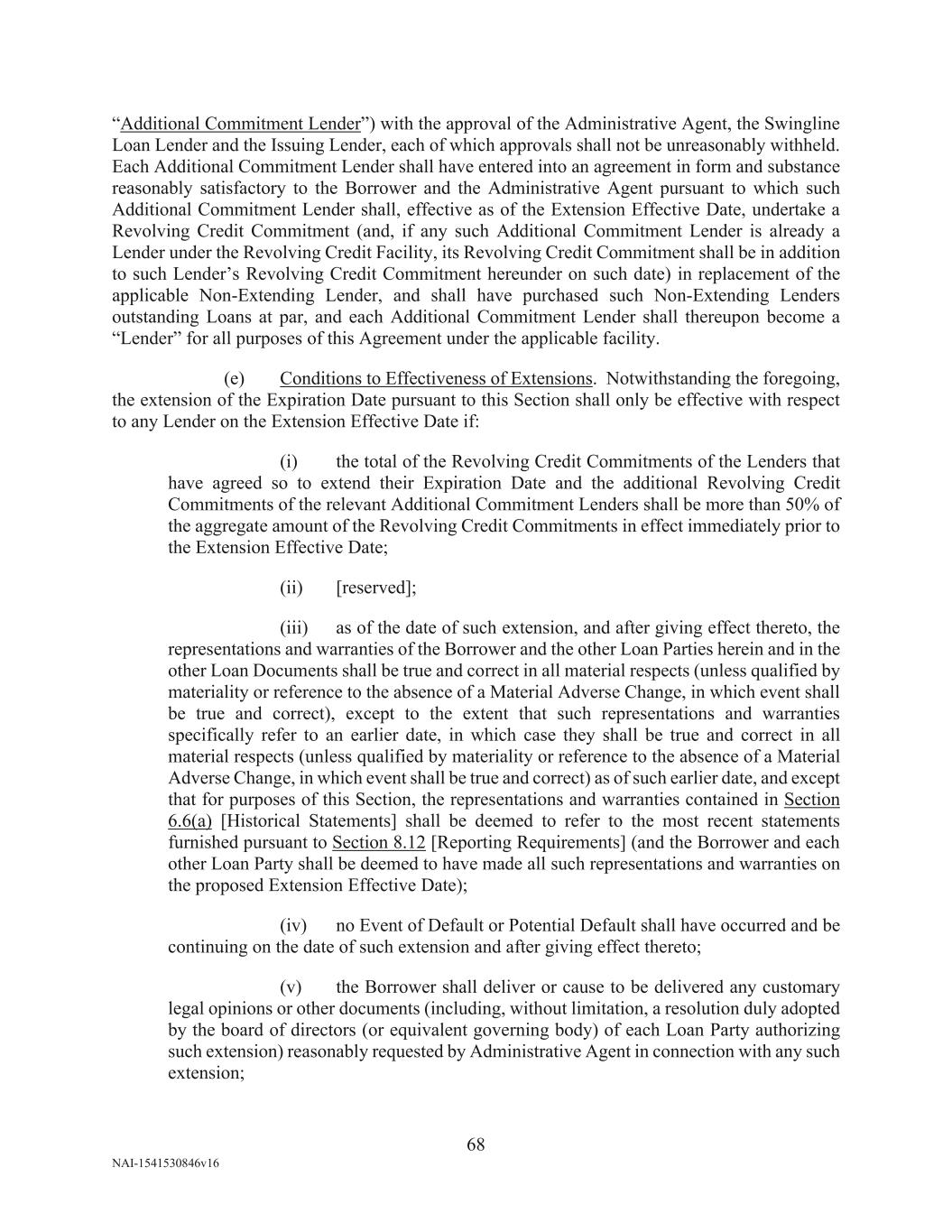 NAI-1541530846v16 68 “Additional Commitment Lender”) with the approval of the Administrative Agent, the Swingline Loan Lender and the Issuing Lender, each of which approvals shall not be unreasonably withheld. Each Additional Commitment Lender shall have entered into an agreement in form and substance reasonably satisfactory to the Borrower and the Administrative Agent pursuant to which such Additional Commitment Lender shall, effective as of the Extension Effective Date, undertake a Revolving Credit Commitment (and, if any such Additional Commitment Lender is already a Lender under the Revolving Credit Facility, its Revolving Credit Commitment shall be in addition to such Lender’s Revolving Credit Commitment hereunder on such date) in replacement of the applicable Non-Extending Lender, and shall have purchased such Non-Extending Lenders outstanding Loans at par, and each Additional Commitment Lender shall thereupon become a “Lender” for all purposes of this Agreement under the applicable facility. (e) Conditions to Effectiveness of Extensions. Notwithstanding the foregoing, the extension of the Expiration Date pursuant to this Section shall only be effective with respect to any Lender on the Extension Effective Date if: (i) the total of the Revolving Credit Commitments of the Lenders that have agreed so to extend their Expiration Date and the additional Revolving Credit Commitments of the relevant Additional Commitment Lenders shall be more than 50% of the aggregate amount of the Revolving Credit Commitments in effect immediately prior to the Extension Effective Date; (ii) [reserved]; (iii) as of the date of such extension, and after giving effect thereto, the representations and warranties of the Borrower and the other Loan Parties herein and in the other Loan Documents shall be true and correct in all material respects (unless qualified by materiality or reference to the absence of a Material Adverse Change, in which event shall be true and correct), except to the extent that such representations and warranties specifically refer to an earlier date, in which case they shall be true and correct in all material respects (unless qualified by materiality or reference to the absence of a Material Adverse Change, in which event shall be true and correct) as of such earlier date, and except that for purposes of this Section, the representations and warranties contained in Section 6.6(a) [Historical Statements] shall be deemed to refer to the most recent statements furnished pursuant to Section 8.12 [Reporting Requirements] (and the Borrower and each other Loan Party shall be deemed to have made all such representations and warranties on the proposed Extension Effective Date); (iv) no Event of Default or Potential Default shall have occurred and be continuing on the date of such extension and after giving effect thereto; (v) the Borrower shall deliver or cause to be delivered any customary legal opinions or other documents (including, without limitation, a resolution duly adopted by the board of directors (or equivalent governing body) of each Loan Party authorizing such extension) reasonably requested by Administrative Agent in connection with any such extension;