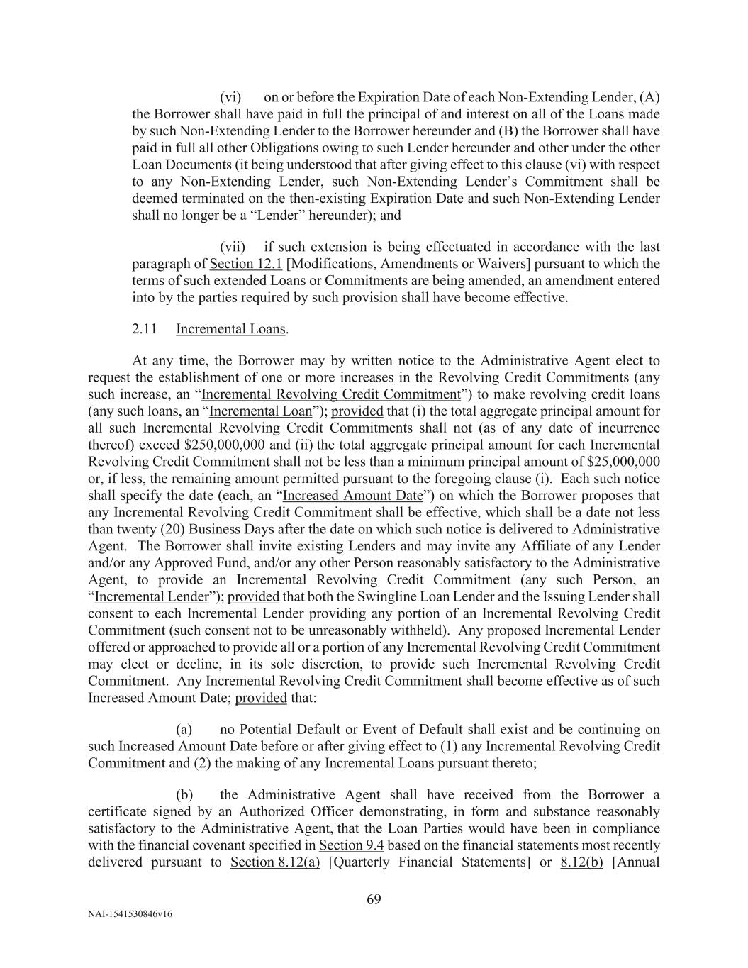 NAI-1541530846v16 69 (vi) on or before the Expiration Date of each Non-Extending Lender, (A) the Borrower shall have paid in full the principal of and interest on all of the Loans made by such Non-Extending Lender to the Borrower hereunder and (B) the Borrower shall have paid in full all other Obligations owing to such Lender hereunder and other under the other Loan Documents (it being understood that after giving effect to this clause (vi) with respect to any Non-Extending Lender, such Non-Extending Lender’s Commitment shall be deemed terminated on the then-existing Expiration Date and such Non-Extending Lender shall no longer be a “Lender” hereunder); and (vii) if such extension is being effectuated in accordance with the last paragraph of Section 12.1 [Modifications, Amendments or Waivers] pursuant to which the terms of such extended Loans or Commitments are being amended, an amendment entered into by the parties required by such provision shall have become effective. 2.11 Incremental Loans. At any time, the Borrower may by written notice to the Administrative Agent elect to request the establishment of one or more increases in the Revolving Credit Commitments (any such increase, an “Incremental Revolving Credit Commitment”) to make revolving credit loans (any such loans, an “Incremental Loan”); provided that (i) the total aggregate principal amount for all such Incremental Revolving Credit Commitments shall not (as of any date of incurrence thereof) exceed $250,000,000 and (ii) the total aggregate principal amount for each Incremental Revolving Credit Commitment shall not be less than a minimum principal amount of $25,000,000 or, if less, the remaining amount permitted pursuant to the foregoing clause (i). Each such notice shall specify the date (each, an “Increased Amount Date”) on which the Borrower proposes that any Incremental Revolving Credit Commitment shall be effective, which shall be a date not less than twenty (20) Business Days after the date on which such notice is delivered to Administrative Agent. The Borrower shall invite existing Lenders and may invite any Affiliate of any Lender and/or any Approved Fund, and/or any other Person reasonably satisfactory to the Administrative Agent, to provide an Incremental Revolving Credit Commitment (any such Person, an “Incremental Lender”); provided that both the Swingline Loan Lender and the Issuing Lender shall consent to each Incremental Lender providing any portion of an Incremental Revolving Credit Commitment (such consent not to be unreasonably withheld). Any proposed Incremental Lender offered or approached to provide all or a portion of any Incremental Revolving Credit Commitment may elect or decline, in its sole discretion, to provide such Incremental Revolving Credit Commitment. Any Incremental Revolving Credit Commitment shall become effective as of such Increased Amount Date; provided that: (a) no Potential Default or Event of Default shall exist and be continuing on such Increased Amount Date before or after giving effect to (1) any Incremental Revolving Credit Commitment and (2) the making of any Incremental Loans pursuant thereto; (b) the Administrative Agent shall have received from the Borrower a certificate signed by an Authorized Officer demonstrating, in form and substance reasonably satisfactory to the Administrative Agent, that the Loan Parties would have been in compliance with the financial covenant specified in Section 9.4 based on the financial statements most recently delivered pursuant to Section 8.12(a) [Quarterly Financial Statements] or 8.12(b) [Annual
