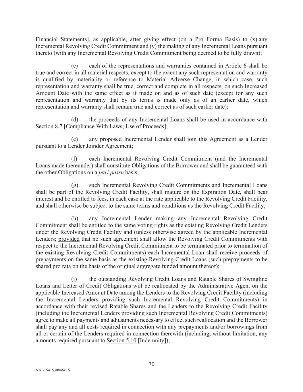 NAI-1541530846v16 70 Financial Statements], as applicable, after giving effect (on a Pro Forma Basis) to (x) any Incremental Revolving Credit Commitment and (y) the making of any Incremental Loans pursuant thereto (with any Incremental Revolving Credit Commitment being deemed to be fully drawn); (c) each of the representations and warranties contained in Article 6 shall be true and correct in all material respects, except to the extent any such representation and warranty is qualified by materiality or reference to Material Adverse Change, in which case, such representation and warranty shall be true, correct and complete in all respects, on such Increased Amount Date with the same effect as if made on and as of such date (except for any such representation and warranty that by its terms is made only as of an earlier date, which representation and warranty shall remain true and correct as of such earlier date); (d) the proceeds of any Incremental Loans shall be used in accordance with Section 8.7 [Compliance With Laws; Use of Proceeds]; (e) any proposed Incremental Lender shall join this Agreement as a Lender pursuant to a Lender Joinder Agreement; (f) each Incremental Revolving Credit Commitment (and the Incremental Loans made thereunder) shall constitute Obligations of the Borrower and shall be guaranteed with the other Obligations on a pari passu basis; (g) such Incremental Revolving Credit Commitments and Incremental Loans shall be part of the Revolving Credit Facility, shall mature on the Expiration Date, shall bear interest and be entitled to fees, in each case at the rate applicable to the Revolving Credit Facility, and shall otherwise be subject to the same terms and conditions as the Revolving Credit Facility; (h) any Incremental Lender making any Incremental Revolving Credit Commitment shall be entitled to the same voting rights as the existing Revolving Credit Lenders under the Revolving Credit Facility and (unless otherwise agreed by the applicable Incremental Lenders; provided that no such agreement shall allow the Revolving Credit Commitments with respect to the Incremental Revolving Credit Commitment to be terminated prior to termination of the existing Revolving Credit Commitments) each Incremental Loan shall receive proceeds of prepayments on the same basis as the existing Revolving Credit Loans (such prepayments to be shared pro rata on the basis of the original aggregate funded amount thereof); (i) the outstanding Revolving Credit Loans and Ratable Shares of Swingline Loans and Letter of Credit Obligations will be reallocated by the Administrative Agent on the applicable Increased Amount Date among the Lenders to the Revolving Credit Facility (including the Incremental Lenders providing such Incremental Revolving Credit Commitments) in accordance with their revised Ratable Shares and the Lenders to the Revolving Credit Facility (including the Incremental Lenders providing such Incremental Revolving Credit Commitments) agree to make all payments and adjustments necessary to effect such reallocation and the Borrower shall pay any and all costs required in connection with any prepayments and/or borrowings from all or certain of the Lenders required in connection therewith (including, without limitation, any amounts required pursuant to Section 5.10 [Indemnity]);