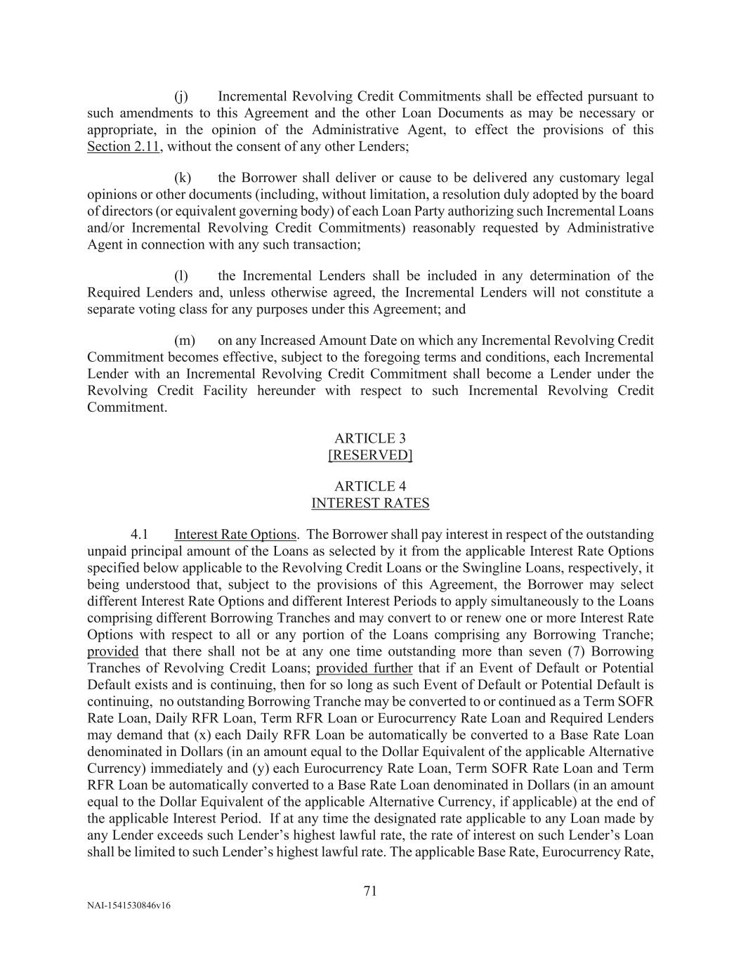 NAI-1541530846v16 71 (j) Incremental Revolving Credit Commitments shall be effected pursuant to such amendments to this Agreement and the other Loan Documents as may be necessary or appropriate, in the opinion of the Administrative Agent, to effect the provisions of this Section 2.11, without the consent of any other Lenders; (k) the Borrower shall deliver or cause to be delivered any customary legal opinions or other documents (including, without limitation, a resolution duly adopted by the board of directors (or equivalent governing body) of each Loan Party authorizing such Incremental Loans and/or Incremental Revolving Credit Commitments) reasonably requested by Administrative Agent in connection with any such transaction; (l) the Incremental Lenders shall be included in any determination of the Required Lenders and, unless otherwise agreed, the Incremental Lenders will not constitute a separate voting class for any purposes under this Agreement; and (m) on any Increased Amount Date on which any Incremental Revolving Credit Commitment becomes effective, subject to the foregoing terms and conditions, each Incremental Lender with an Incremental Revolving Credit Commitment shall become a Lender under the Revolving Credit Facility hereunder with respect to such Incremental Revolving Credit Commitment. ARTICLE 3 [RESERVED] ARTICLE 4 INTEREST RATES 4.1 Interest Rate Options. The Borrower shall pay interest in respect of the outstanding unpaid principal amount of the Loans as selected by it from the applicable Interest Rate Options specified below applicable to the Revolving Credit Loans or the Swingline Loans, respectively, it being understood that, subject to the provisions of this Agreement, the Borrower may select different Interest Rate Options and different Interest Periods to apply simultaneously to the Loans comprising different Borrowing Tranches and may convert to or renew one or more Interest Rate Options with respect to all or any portion of the Loans comprising any Borrowing Tranche; provided that there shall not be at any one time outstanding more than seven (7) Borrowing Tranches of Revolving Credit Loans; provided further that if an Event of Default or Potential Default exists and is continuing, then for so long as such Event of Default or Potential Default is continuing, no outstanding Borrowing Tranche may be converted to or continued as a Term SOFR Rate Loan, Daily RFR Loan, Term RFR Loan or Eurocurrency Rate Loan and Required Lenders may demand that (x) each Daily RFR Loan be automatically be converted to a Base Rate Loan denominated in Dollars (in an amount equal to the Dollar Equivalent of the applicable Alternative Currency) immediately and (y) each Eurocurrency Rate Loan, Term SOFR Rate Loan and Term RFR Loan be automatically converted to a Base Rate Loan denominated in Dollars (in an amount equal to the Dollar Equivalent of the applicable Alternative Currency, if applicable) at the end of the applicable Interest Period. If at any time the designated rate applicable to any Loan made by any Lender exceeds such Lender’s highest lawful rate, the rate of interest on such Lender’s Loan shall be limited to such Lender’s highest lawful rate. The applicable Base Rate, Eurocurrency Rate,