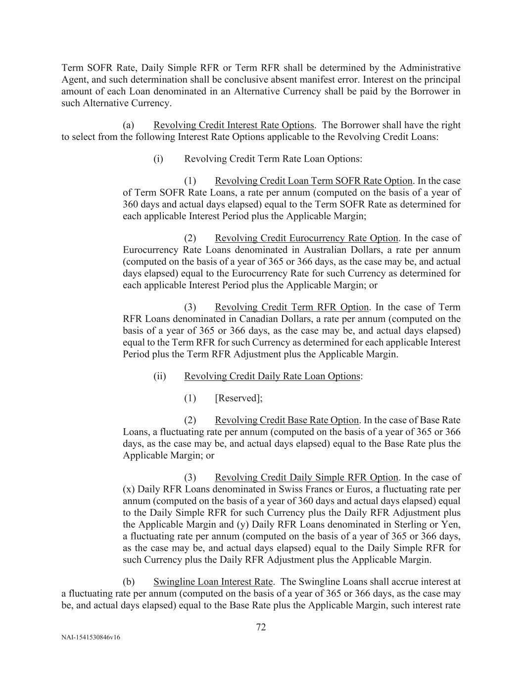 NAI-1541530846v16 72 Term SOFR Rate, Daily Simple RFR or Term RFR shall be determined by the Administrative Agent, and such determination shall be conclusive absent manifest error. Interest on the principal amount of each Loan denominated in an Alternative Currency shall be paid by the Borrower in such Alternative Currency. (a) Revolving Credit Interest Rate Options. The Borrower shall have the right to select from the following Interest Rate Options applicable to the Revolving Credit Loans: (i) Revolving Credit Term Rate Loan Options: (1) Revolving Credit Loan Term SOFR Rate Option. In the case of Term SOFR Rate Loans, a rate per annum (computed on the basis of a year of 360 days and actual days elapsed) equal to the Term SOFR Rate as determined for each applicable Interest Period plus the Applicable Margin; (2) Revolving Credit Eurocurrency Rate Option. In the case of Eurocurrency Rate Loans denominated in Australian Dollars, a rate per annum (computed on the basis of a year of 365 or 366 days, as the case may be, and actual days elapsed) equal to the Eurocurrency Rate for such Currency as determined for each applicable Interest Period plus the Applicable Margin; or (3) Revolving Credit Term RFR Option. In the case of Term RFR Loans denominated in Canadian Dollars, a rate per annum (computed on the basis of a year of 365 or 366 days, as the case may be, and actual days elapsed) equal to the Term RFR for such Currency as determined for each applicable Interest Period plus the Term RFR Adjustment plus the Applicable Margin. (ii) Revolving Credit Daily Rate Loan Options: (1) [Reserved]; (2) Revolving Credit Base Rate Option. In the case of Base Rate Loans, a fluctuating rate per annum (computed on the basis of a year of 365 or 366 days, as the case may be, and actual days elapsed) equal to the Base Rate plus the Applicable Margin; or (3) Revolving Credit Daily Simple RFR Option. In the case of (x) Daily RFR Loans denominated in Swiss Francs or Euros, a fluctuating rate per annum (computed on the basis of a year of 360 days and actual days elapsed) equal to the Daily Simple RFR for such Currency plus the Daily RFR Adjustment plus the Applicable Margin and (y) Daily RFR Loans denominated in Sterling or Yen, a fluctuating rate per annum (computed on the basis of a year of 365 or 366 days, as the case may be, and actual days elapsed) equal to the Daily Simple RFR for such Currency plus the Daily RFR Adjustment plus the Applicable Margin. (b) Swingline Loan Interest Rate. The Swingline Loans shall accrue interest at a fluctuating rate per annum (computed on the basis of a year of 365 or 366 days, as the case may be, and actual days elapsed) equal to the Base Rate plus the Applicable Margin, such interest rate