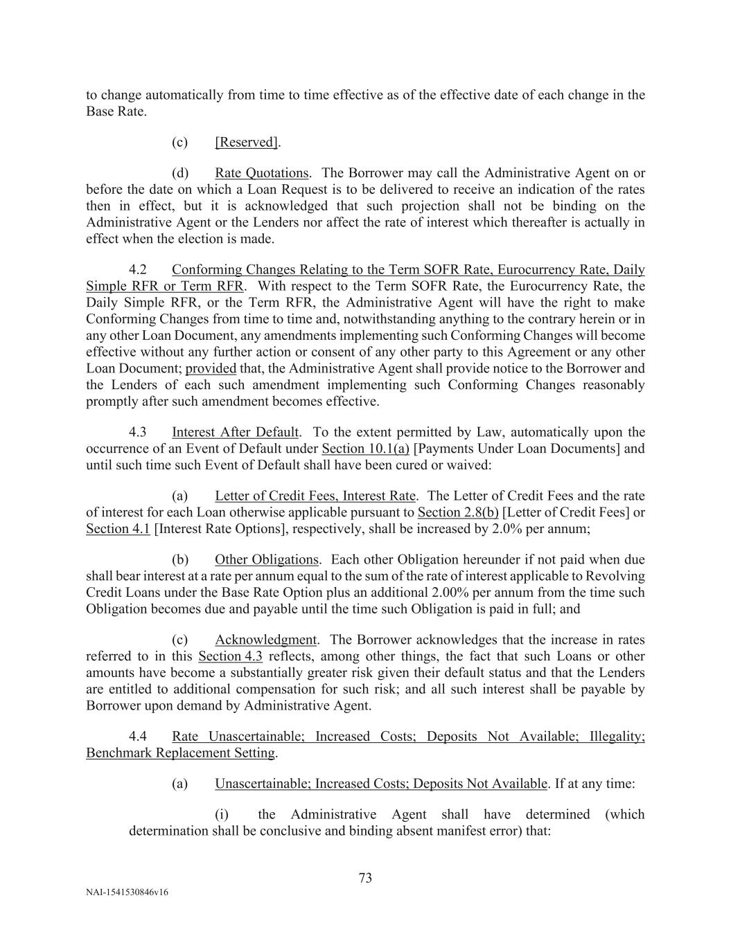 NAI-1541530846v16 73 to change automatically from time to time effective as of the effective date of each change in the Base Rate. (c) [Reserved]. (d) Rate Quotations. The Borrower may call the Administrative Agent on or before the date on which a Loan Request is to be delivered to receive an indication of the rates then in effect, but it is acknowledged that such projection shall not be binding on the Administrative Agent or the Lenders nor affect the rate of interest which thereafter is actually in effect when the election is made. 4.2 Conforming Changes Relating to the Term SOFR Rate, Eurocurrency Rate, Daily Simple RFR or Term RFR. With respect to the Term SOFR Rate, the Eurocurrency Rate, the Daily Simple RFR, or the Term RFR, the Administrative Agent will have the right to make Conforming Changes from time to time and, notwithstanding anything to the contrary herein or in any other Loan Document, any amendments implementing such Conforming Changes will become effective without any further action or consent of any other party to this Agreement or any other Loan Document; provided that, the Administrative Agent shall provide notice to the Borrower and the Lenders of each such amendment implementing such Conforming Changes reasonably promptly after such amendment becomes effective. 4.3 Interest After Default. To the extent permitted by Law, automatically upon the occurrence of an Event of Default under Section 10.1(a) [Payments Under Loan Documents] and until such time such Event of Default shall have been cured or waived: (a) Letter of Credit Fees, Interest Rate. The Letter of Credit Fees and the rate of interest for each Loan otherwise applicable pursuant to Section 2.8(b) [Letter of Credit Fees] or Section 4.1 [Interest Rate Options], respectively, shall be increased by 2.0% per annum; (b) Other Obligations. Each other Obligation hereunder if not paid when due shall bear interest at a rate per annum equal to the sum of the rate of interest applicable to Revolving Credit Loans under the Base Rate Option plus an additional 2.00% per annum from the time such Obligation becomes due and payable until the time such Obligation is paid in full; and (c) Acknowledgment. The Borrower acknowledges that the increase in rates referred to in this Section 4.3 reflects, among other things, the fact that such Loans or other amounts have become a substantially greater risk given their default status and that the Lenders are entitled to additional compensation for such risk; and all such interest shall be payable by Borrower upon demand by Administrative Agent. 4.4 Rate Unascertainable; Increased Costs; Deposits Not Available; Illegality; Benchmark Replacement Setting. (a) Unascertainable; Increased Costs; Deposits Not Available. If at any time: (i) the Administrative Agent shall have determined (which determination shall be conclusive and binding absent manifest error) that: