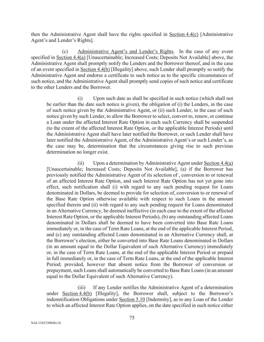 NAI-1541530846v16 75 then the Administrative Agent shall have the rights specified in Section 4.4(c) [Administrative Agent’s and Lender’s Rights]. (c) Administrative Agent’s and Lender’s Rights. In the case of any event specified in Section 4.4(a) [Unascertainable; Increased Costs; Deposits Not Available] above, the Administrative Agent shall promptly notify the Lenders and the Borrower thereof, and in the case of an event specified in Section 4.4(b) [Illegality] above, such Lender shall promptly so notify the Administrative Agent and endorse a certificate to such notice as to the specific circumstances of such notice, and the Administrative Agent shall promptly send copies of such notice and certificate to the other Lenders and the Borrower. (i) Upon such date as shall be specified in such notice (which shall not be earlier than the date such notice is given), the obligation of (i) the Lenders, in the case of such notice given by the Administrative Agent, or (ii) such Lender, in the case of such notice given by such Lender, to allow the Borrower to select, convert to, renew, or continue a Loan under the affected Interest Rate Option in each such Currency shall be suspended (to the extent of the affected Interest Rate Option, or the applicable Interest Periods) until the Administrative Agent shall have later notified the Borrower, or such Lender shall have later notified the Administrative Agent, of the Administrative Agent’s or such Lender’s, as the case may be, determination that the circumstances giving rise to such previous determination no longer exist. (ii) Upon a determination by Administrative Agent under Section 4.4(a) [Unascertainable; Increased Costs; Deposits Not Available], (a) if the Borrower has previously notified the Administrative Agent of its selection of , conversion to or renewal of an affected Interest Rate Option, and such Interest Rate Option has not yet gone into effect, such notification shall (i) with regard to any such pending request for Loans denominated in Dollars, be deemed to provide for selection of, conversion to or renewal of the Base Rate Option otherwise available with respect to such Loans in the amount specified therein and (ii) with regard to any such pending request for Loans denominated in an Alternative Currency, be deemed ineffective (in each case to the extent of the affected Interest Rate Option, or the applicable Interest Periods), (b) any outstanding affected Loans denominated in Dollars shall be deemed to have been converted into Base Rate Loans immediately or, in the case of Term Rate Loans, at the end of the applicable Interest Period, and (c) any outstanding affected Loans denominated in an Alternative Currency shall, at the Borrower’s election, either be converted into Base Rate Loans denominated in Dollars (in an amount equal to the Dollar Equivalent of such Alternative Currency) immediately or, in the case of Term Rate Loans, at the end of the applicable Interest Period or prepaid in full immediately or, in the case of Term Rate Loans, at the end of the applicable Interest Period; provided, however that absent notice from the Borrower of conversion or prepayment, such Loans shall automatically be converted to Base Rate Loans (in an amount equal to the Dollar Equivalent of such Alternative Currency). (iii) If any Lender notifies the Administrative Agent of a determination under Section 4.4(b) [Illegality], the Borrower shall, subject to the Borrower’s indemnification Obligations under Section 5.10 [Indemnity], as to any Loan of the Lender to which an affected Interest Rate Option applies, on the date specified in such notice either