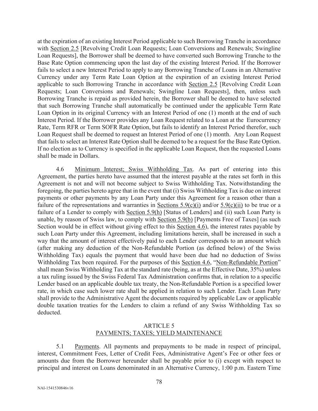 NAI-1541530846v16 78 at the expiration of an existing Interest Period applicable to such Borrowing Tranche in accordance with Section 2.5 [Revolving Credit Loan Requests; Loan Conversions and Renewals; Swingline Loan Requests], the Borrower shall be deemed to have converted such Borrowing Tranche to the Base Rate Option commencing upon the last day of the existing Interest Period. If the Borrower fails to select a new Interest Period to apply to any Borrowing Tranche of Loans in an Alternative Currency under any Term Rate Loan Option at the expiration of an existing Interest Period applicable to such Borrowing Tranche in accordance with Section 2.5 [Revolving Credit Loan Requests; Loan Conversions and Renewals; Swingline Loan Requests], then, unless such Borrowing Tranche is repaid as provided herein, the Borrower shall be deemed to have selected that such Borrowing Tranche shall automatically be continued under the applicable Term Rate Loan Option in its original Currency with an Interest Period of one (1) month at the end of such Interest Period. If the Borrower provides any Loan Request related to a Loan at the Eurocurrency Rate, Term RFR or Term SOFR Rate Option, but fails to identify an Interest Period therefor, such Loan Request shall be deemed to request an Interest Period of one (1) month. Any Loan Request that fails to select an Interest Rate Option shall be deemed to be a request for the Base Rate Option. If no election as to Currency is specified in the applicable Loan Request, then the requested Loans shall be made in Dollars. 4.6 Minimum Interest; Swiss Withholding Tax. As part of entering into this Agreement, the parties hereto have assumed that the interest payable at the rates set forth in this Agreement is not and will not become subject to Swiss Withholding Tax. Notwithstanding the foregoing, the parties hereto agree that in the event that (i) Swiss Withholding Tax is due on interest payments or other payments by any Loan Party under this Agreement for a reason other than a failure of the representations and warranties in Sections 5.9(c)(i) and/or 5.9(c)(ii) to be true or a failure of a Lender to comply with Section 5.9(h) [Status of Lenders] and (ii) such Loan Party is unable, by reason of Swiss law, to comply with Section 5.9(b) [Payments Free of Taxes] (as such Section would be in effect without giving effect to this Section 4.6), the interest rates payable by such Loan Party under this Agreement, including limitations herein, shall be increased in such a way that the amount of interest effectively paid to each Lender corresponds to an amount which (after making any deduction of the Non-Refundable Portion (as defined below) of the Swiss Withholding Tax) equals the payment that would have been due had no deduction of Swiss Withholding Tax been required. For the purposes of this Section 4.6, “Non-Refundable Portion” shall mean Swiss Withholding Tax at the standard rate (being, as at the Effective Date, 35%) unless a tax ruling issued by the Swiss Federal Tax Administration confirms that, in relation to a specific Lender based on an applicable double tax treaty, the Non-Refundable Portion is a specified lower rate, in which case such lower rate shall be applied in relation to such Lender. Each Loan Party shall provide to the Administrative Agent the documents required by applicable Law or applicable double taxation treaties for the Lenders to claim a refund of any Swiss Withholding Tax so deducted. ARTICLE 5 PAYMENTS; TAXES; YIELD MAINTENANCE 5.1 Payments. All payments and prepayments to be made in respect of principal, interest, Commitment Fees, Letter of Credit Fees, Administrative Agent’s Fee or other fees or amounts due from the Borrower hereunder shall be payable prior to (i) except with respect to principal and interest on Loans denominated in an Alternative Currency, 1:00 p.m. Eastern Time
