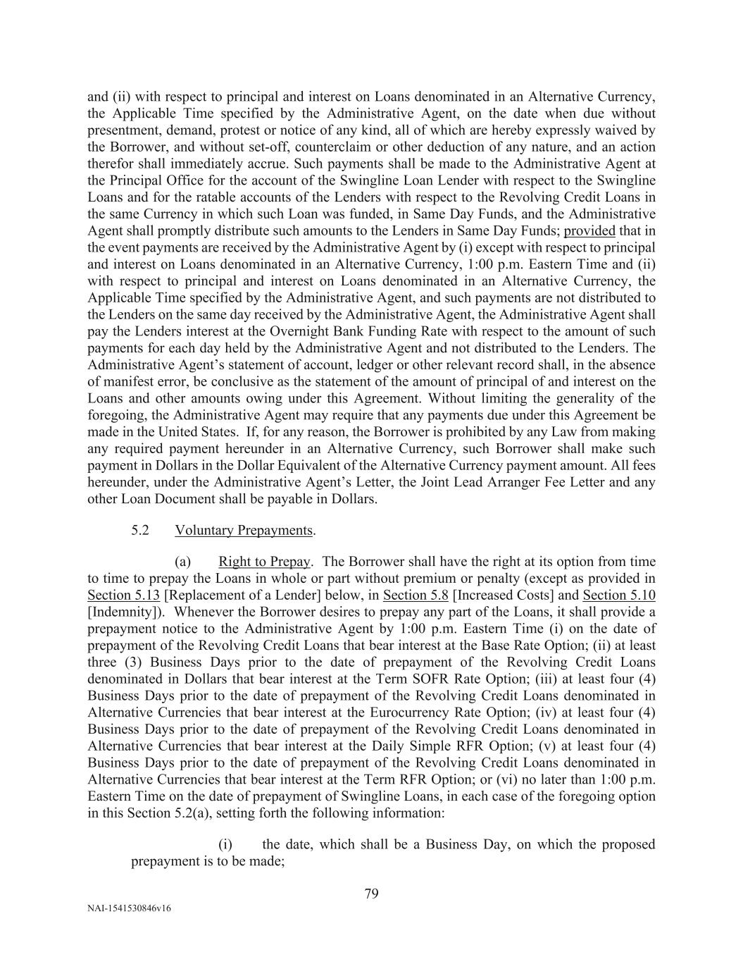 NAI-1541530846v16 79 and (ii) with respect to principal and interest on Loans denominated in an Alternative Currency, the Applicable Time specified by the Administrative Agent, on the date when due without presentment, demand, protest or notice of any kind, all of which are hereby expressly waived by the Borrower, and without set-off, counterclaim or other deduction of any nature, and an action therefor shall immediately accrue. Such payments shall be made to the Administrative Agent at the Principal Office for the account of the Swingline Loan Lender with respect to the Swingline Loans and for the ratable accounts of the Lenders with respect to the Revolving Credit Loans in the same Currency in which such Loan was funded, in Same Day Funds, and the Administrative Agent shall promptly distribute such amounts to the Lenders in Same Day Funds; provided that in the event payments are received by the Administrative Agent by (i) except with respect to principal and interest on Loans denominated in an Alternative Currency, 1:00 p.m. Eastern Time and (ii) with respect to principal and interest on Loans denominated in an Alternative Currency, the Applicable Time specified by the Administrative Agent, and such payments are not distributed to the Lenders on the same day received by the Administrative Agent, the Administrative Agent shall pay the Lenders interest at the Overnight Bank Funding Rate with respect to the amount of such payments for each day held by the Administrative Agent and not distributed to the Lenders. The Administrative Agent’s statement of account, ledger or other relevant record shall, in the absence of manifest error, be conclusive as the statement of the amount of principal of and interest on the Loans and other amounts owing under this Agreement. Without limiting the generality of the foregoing, the Administrative Agent may require that any payments due under this Agreement be made in the United States. If, for any reason, the Borrower is prohibited by any Law from making any required payment hereunder in an Alternative Currency, such Borrower shall make such payment in Dollars in the Dollar Equivalent of the Alternative Currency payment amount. All fees hereunder, under the Administrative Agent’s Letter, the Joint Lead Arranger Fee Letter and any other Loan Document shall be payable in Dollars. 5.2 Voluntary Prepayments. (a) Right to Prepay. The Borrower shall have the right at its option from time to time to prepay the Loans in whole or part without premium or penalty (except as provided in Section 5.13 [Replacement of a Lender] below, in Section 5.8 [Increased Costs] and Section 5.10 [Indemnity]). Whenever the Borrower desires to prepay any part of the Loans, it shall provide a prepayment notice to the Administrative Agent by 1:00 p.m. Eastern Time (i) on the date of prepayment of the Revolving Credit Loans that bear interest at the Base Rate Option; (ii) at least three (3) Business Days prior to the date of prepayment of the Revolving Credit Loans denominated in Dollars that bear interest at the Term SOFR Rate Option; (iii) at least four (4) Business Days prior to the date of prepayment of the Revolving Credit Loans denominated in Alternative Currencies that bear interest at the Eurocurrency Rate Option; (iv) at least four (4) Business Days prior to the date of prepayment of the Revolving Credit Loans denominated in Alternative Currencies that bear interest at the Daily Simple RFR Option; (v) at least four (4) Business Days prior to the date of prepayment of the Revolving Credit Loans denominated in Alternative Currencies that bear interest at the Term RFR Option; or (vi) no later than 1:00 p.m. Eastern Time on the date of prepayment of Swingline Loans, in each case of the foregoing option in this Section 5.2(a), setting forth the following information: (i) the date, which shall be a Business Day, on which the proposed prepayment is to be made;