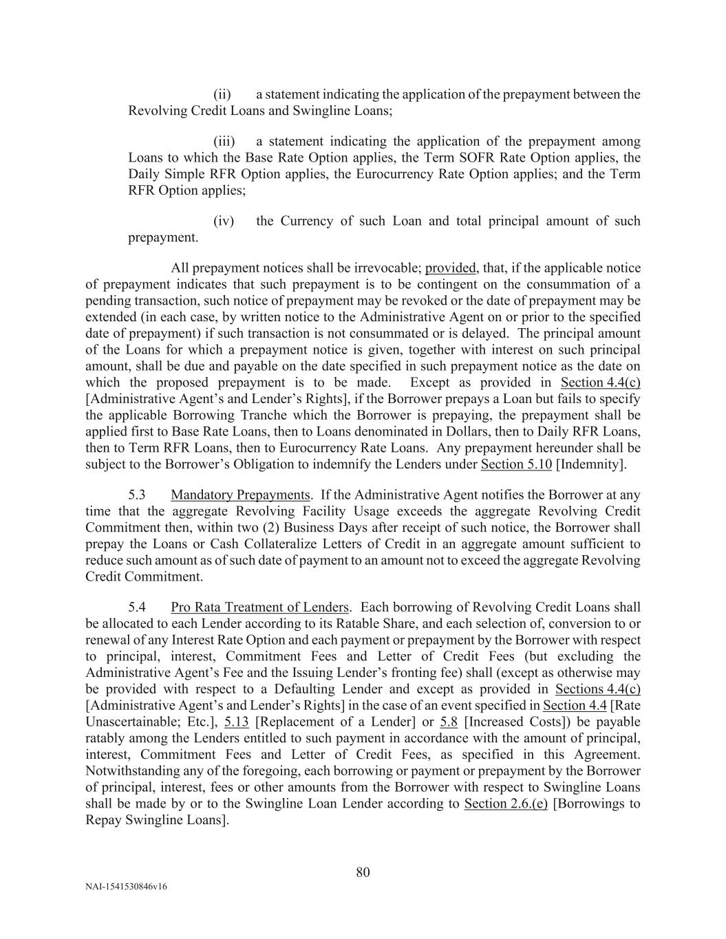 NAI-1541530846v16 80 (ii) a statement indicating the application of the prepayment between the Revolving Credit Loans and Swingline Loans; (iii) a statement indicating the application of the prepayment among Loans to which the Base Rate Option applies, the Term SOFR Rate Option applies, the Daily Simple RFR Option applies, the Eurocurrency Rate Option applies; and the Term RFR Option applies; (iv) the Currency of such Loan and total principal amount of such prepayment. All prepayment notices shall be irrevocable; provided, that, if the applicable notice of prepayment indicates that such prepayment is to be contingent on the consummation of a pending transaction, such notice of prepayment may be revoked or the date of prepayment may be extended (in each case, by written notice to the Administrative Agent on or prior to the specified date of prepayment) if such transaction is not consummated or is delayed. The principal amount of the Loans for which a prepayment notice is given, together with interest on such principal amount, shall be due and payable on the date specified in such prepayment notice as the date on which the proposed prepayment is to be made. Except as provided in Section 4.4(c) [Administrative Agent’s and Lender’s Rights], if the Borrower prepays a Loan but fails to specify the applicable Borrowing Tranche which the Borrower is prepaying, the prepayment shall be applied first to Base Rate Loans, then to Loans denominated in Dollars, then to Daily RFR Loans, then to Term RFR Loans, then to Eurocurrency Rate Loans. Any prepayment hereunder shall be subject to the Borrower’s Obligation to indemnify the Lenders under Section 5.10 [Indemnity]. 5.3 Mandatory Prepayments. If the Administrative Agent notifies the Borrower at any time that the aggregate Revolving Facility Usage exceeds the aggregate Revolving Credit Commitment then, within two (2) Business Days after receipt of such notice, the Borrower shall prepay the Loans or Cash Collateralize Letters of Credit in an aggregate amount sufficient to reduce such amount as of such date of payment to an amount not to exceed the aggregate Revolving Credit Commitment. 5.4 Pro Rata Treatment of Lenders. Each borrowing of Revolving Credit Loans shall be allocated to each Lender according to its Ratable Share, and each selection of, conversion to or renewal of any Interest Rate Option and each payment or prepayment by the Borrower with respect to principal, interest, Commitment Fees and Letter of Credit Fees (but excluding the Administrative Agent’s Fee and the Issuing Lender’s fronting fee) shall (except as otherwise may be provided with respect to a Defaulting Lender and except as provided in Sections 4.4(c) [Administrative Agent’s and Lender’s Rights] in the case of an event specified in Section 4.4 [Rate Unascertainable; Etc.], 5.13 [Replacement of a Lender] or 5.8 [Increased Costs]) be payable ratably among the Lenders entitled to such payment in accordance with the amount of principal, interest, Commitment Fees and Letter of Credit Fees, as specified in this Agreement. Notwithstanding any of the foregoing, each borrowing or payment or prepayment by the Borrower of principal, interest, fees or other amounts from the Borrower with respect to Swingline Loans shall be made by or to the Swingline Loan Lender according to Section 2.6.(e) [Borrowings to Repay Swingline Loans].