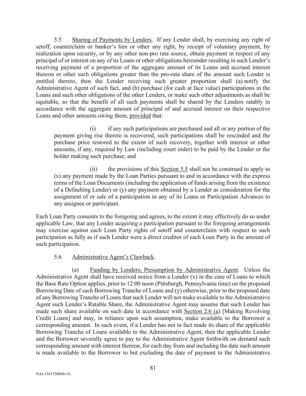 NAI-1541530846v16 81 5.5 Sharing of Payments by Lenders. If any Lender shall, by exercising any right of setoff, counterclaim or banker’s lien or other any right, by receipt of voluntary payment, by realization upon security, or by any other non-pro rata source, obtain payment in respect of any principal of or interest on any of its Loans or other obligations hereunder resulting in such Lender’s receiving payment of a proportion of the aggregate amount of its Loans and accrued interest thereon or other such obligations greater than the pro-rata share of the amount such Lender is entitled thereto, then the Lender receiving such greater proportion shall (a) notify the Administrative Agent of such fact, and (b) purchase (for cash at face value) participations in the Loans and such other obligations of the other Lenders, or make such other adjustments as shall be equitable, so that the benefit of all such payments shall be shared by the Lenders ratably in accordance with the aggregate amount of principal of and accrued interest on their respective Loans and other amounts owing them, provided that: (i) if any such participations are purchased and all or any portion of the payment giving rise thereto is recovered, such participations shall be rescinded and the purchase price restored to the extent of such recovery, together with interest or other amounts, if any, required by Law (including court order) to be paid by the Lender or the holder making such purchase; and (ii) the provisions of this Section 5.5 shall not be construed to apply to (x) any payment made by the Loan Parties pursuant to and in accordance with the express terms of the Loan Documents (including the application of funds arising from the existence of a Defaulting Lender) or (y) any payment obtained by a Lender as consideration for the assignment of or sale of a participation in any of its Loans or Participation Advances to any assignee or participant. Each Loan Party consents to the foregoing and agrees, to the extent it may effectively do so under applicable Law, that any Lender acquiring a participation pursuant to the foregoing arrangements may exercise against each Loan Party rights of setoff and counterclaim with respect to such participation as fully as if such Lender were a direct creditor of each Loan Party in the amount of such participation. 5.6 Administrative Agent’s Clawback. (a) Funding by Lenders; Presumption by Administrative Agent. Unless the Administrative Agent shall have received notice from a Lender (x) in the case of Loans to which the Base Rate Option applies, prior to 12:00 noon (Pittsburgh, Pennsylvania time) on the proposed Borrowing Date of such Borrowing Tranche of Loans and (y) otherwise, prior to the proposed date of any Borrowing Tranche of Loans that such Lender will not make available to the Administrative Agent such Lender’s Ratable Share, the Administrative Agent may assume that such Lender has made such share available on such date in accordance with Section 2.6 (a) [Making Revolving Credit Loans] and may, in reliance upon such assumption, make available to the Borrower a corresponding amount. In such event, if a Lender has not in fact made its share of the applicable Borrowing Tranche of Loans available to the Administrative Agent, then the applicable Lender and the Borrower severally agree to pay to the Administrative Agent forthwith on demand such corresponding amount with interest thereon, for each day from and including the date such amount is made available to the Borrower to but excluding the date of payment to the Administrative