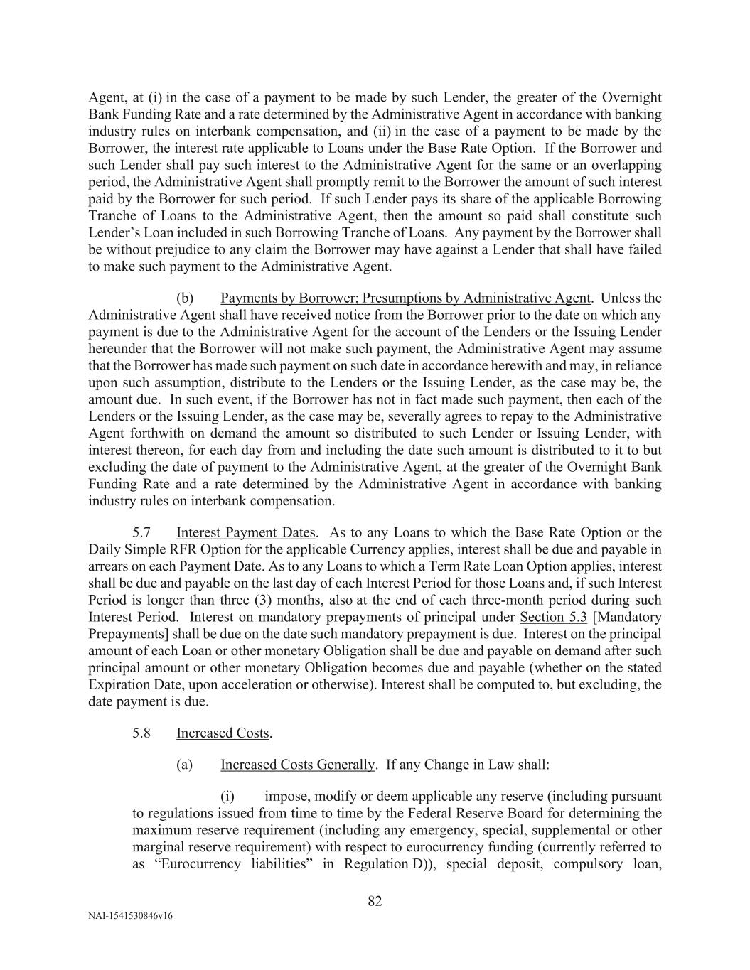 NAI-1541530846v16 82 Agent, at (i) in the case of a payment to be made by such Lender, the greater of the Overnight Bank Funding Rate and a rate determined by the Administrative Agent in accordance with banking industry rules on interbank compensation, and (ii) in the case of a payment to be made by the Borrower, the interest rate applicable to Loans under the Base Rate Option. If the Borrower and such Lender shall pay such interest to the Administrative Agent for the same or an overlapping period, the Administrative Agent shall promptly remit to the Borrower the amount of such interest paid by the Borrower for such period. If such Lender pays its share of the applicable Borrowing Tranche of Loans to the Administrative Agent, then the amount so paid shall constitute such Lender’s Loan included in such Borrowing Tranche of Loans. Any payment by the Borrower shall be without prejudice to any claim the Borrower may have against a Lender that shall have failed to make such payment to the Administrative Agent. (b) Payments by Borrower; Presumptions by Administrative Agent. Unless the Administrative Agent shall have received notice from the Borrower prior to the date on which any payment is due to the Administrative Agent for the account of the Lenders or the Issuing Lender hereunder that the Borrower will not make such payment, the Administrative Agent may assume that the Borrower has made such payment on such date in accordance herewith and may, in reliance upon such assumption, distribute to the Lenders or the Issuing Lender, as the case may be, the amount due. In such event, if the Borrower has not in fact made such payment, then each of the Lenders or the Issuing Lender, as the case may be, severally agrees to repay to the Administrative Agent forthwith on demand the amount so distributed to such Lender or Issuing Lender, with interest thereon, for each day from and including the date such amount is distributed to it to but excluding the date of payment to the Administrative Agent, at the greater of the Overnight Bank Funding Rate and a rate determined by the Administrative Agent in accordance with banking industry rules on interbank compensation. 5.7 Interest Payment Dates. As to any Loans to which the Base Rate Option or the Daily Simple RFR Option for the applicable Currency applies, interest shall be due and payable in arrears on each Payment Date. As to any Loans to which a Term Rate Loan Option applies, interest shall be due and payable on the last day of each Interest Period for those Loans and, if such Interest Period is longer than three (3) months, also at the end of each three-month period during such Interest Period. Interest on mandatory prepayments of principal under Section 5.3 [Mandatory Prepayments] shall be due on the date such mandatory prepayment is due. Interest on the principal amount of each Loan or other monetary Obligation shall be due and payable on demand after such principal amount or other monetary Obligation becomes due and payable (whether on the stated Expiration Date, upon acceleration or otherwise). Interest shall be computed to, but excluding, the date payment is due. 5.8 Increased Costs. (a) Increased Costs Generally. If any Change in Law shall: (i) impose, modify or deem applicable any reserve (including pursuant to regulations issued from time to time by the Federal Reserve Board for determining the maximum reserve requirement (including any emergency, special, supplemental or other marginal reserve requirement) with respect to eurocurrency funding (currently referred to as “Eurocurrency liabilities” in Regulation D)), special deposit, compulsory loan,