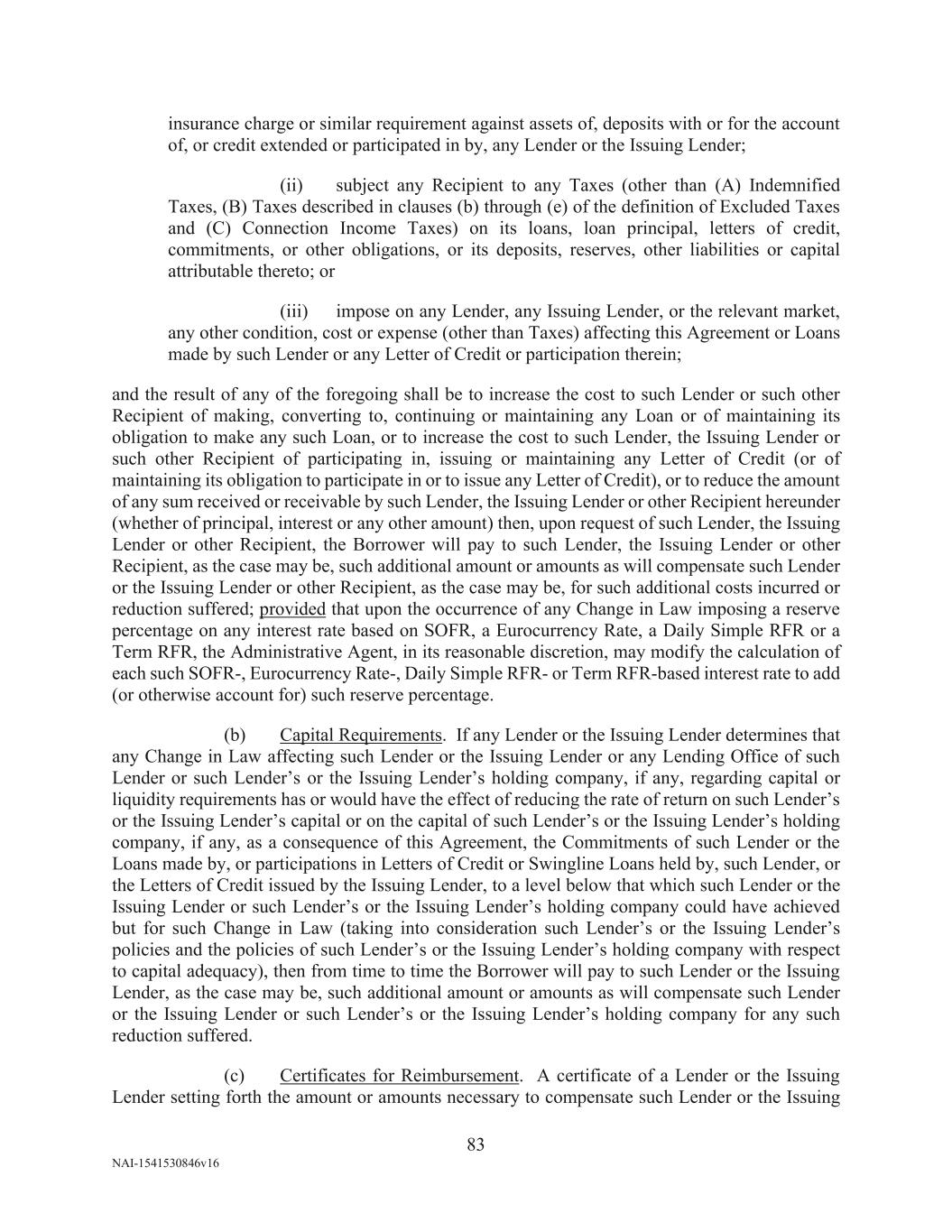 NAI-1541530846v16 83 insurance charge or similar requirement against assets of, deposits with or for the account of, or credit extended or participated in by, any Lender or the Issuing Lender; (ii) subject any Recipient to any Taxes (other than (A) Indemnified Taxes, (B) Taxes described in clauses (b) through (e) of the definition of Excluded Taxes and (C) Connection Income Taxes) on its loans, loan principal, letters of credit, commitments, or other obligations, or its deposits, reserves, other liabilities or capital attributable thereto; or (iii) impose on any Lender, any Issuing Lender, or the relevant market, any other condition, cost or expense (other than Taxes) affecting this Agreement or Loans made by such Lender or any Letter of Credit or participation therein; and the result of any of the foregoing shall be to increase the cost to such Lender or such other Recipient of making, converting to, continuing or maintaining any Loan or of maintaining its obligation to make any such Loan, or to increase the cost to such Lender, the Issuing Lender or such other Recipient of participating in, issuing or maintaining any Letter of Credit (or of maintaining its obligation to participate in or to issue any Letter of Credit), or to reduce the amount of any sum received or receivable by such Lender, the Issuing Lender or other Recipient hereunder (whether of principal, interest or any other amount) then, upon request of such Lender, the Issuing Lender or other Recipient, the Borrower will pay to such Lender, the Issuing Lender or other Recipient, as the case may be, such additional amount or amounts as will compensate such Lender or the Issuing Lender or other Recipient, as the case may be, for such additional costs incurred or reduction suffered; provided that upon the occurrence of any Change in Law imposing a reserve percentage on any interest rate based on SOFR, a Eurocurrency Rate, a Daily Simple RFR or a Term RFR, the Administrative Agent, in its reasonable discretion, may modify the calculation of each such SOFR-, Eurocurrency Rate-, Daily Simple RFR- or Term RFR-based interest rate to add (or otherwise account for) such reserve percentage. (b) Capital Requirements. If any Lender or the Issuing Lender determines that any Change in Law affecting such Lender or the Issuing Lender or any Lending Office of such Lender or such Lender’s or the Issuing Lender’s holding company, if any, regarding capital or liquidity requirements has or would have the effect of reducing the rate of return on such Lender’s or the Issuing Lender’s capital or on the capital of such Lender’s or the Issuing Lender’s holding company, if any, as a consequence of this Agreement, the Commitments of such Lender or the Loans made by, or participations in Letters of Credit or Swingline Loans held by, such Lender, or the Letters of Credit issued by the Issuing Lender, to a level below that which such Lender or the Issuing Lender or such Lender’s or the Issuing Lender’s holding company could have achieved but for such Change in Law (taking into consideration such Lender’s or the Issuing Lender’s policies and the policies of such Lender’s or the Issuing Lender’s holding company with respect to capital adequacy), then from time to time the Borrower will pay to such Lender or the Issuing Lender, as the case may be, such additional amount or amounts as will compensate such Lender or the Issuing Lender or such Lender’s or the Issuing Lender’s holding company for any such reduction suffered. (c) Certificates for Reimbursement. A certificate of a Lender or the Issuing Lender setting forth the amount or amounts necessary to compensate such Lender or the Issuing