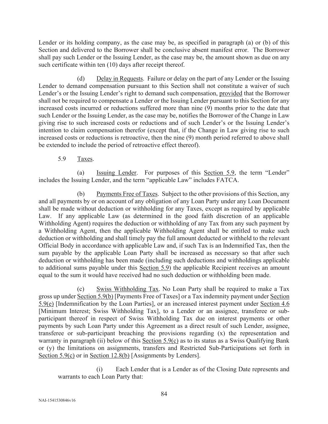 NAI-1541530846v16 84 Lender or its holding company, as the case may be, as specified in paragraph (a) or (b) of this Section and delivered to the Borrower shall be conclusive absent manifest error. The Borrower shall pay such Lender or the Issuing Lender, as the case may be, the amount shown as due on any such certificate within ten (10) days after receipt thereof. (d) Delay in Requests. Failure or delay on the part of any Lender or the Issuing Lender to demand compensation pursuant to this Section shall not constitute a waiver of such Lender’s or the Issuing Lender’s right to demand such compensation, provided that the Borrower shall not be required to compensate a Lender or the Issuing Lender pursuant to this Section for any increased costs incurred or reductions suffered more than nine (9) months prior to the date that such Lender or the Issuing Lender, as the case may be, notifies the Borrower of the Change in Law giving rise to such increased costs or reductions and of such Lender’s or the Issuing Lender’s intention to claim compensation therefor (except that, if the Change in Law giving rise to such increased costs or reductions is retroactive, then the nine (9) month period referred to above shall be extended to include the period of retroactive effect thereof). 5.9 Taxes. (a) Issuing Lender. For purposes of this Section 5.9, the term “Lender” includes the Issuing Lender, and the term “applicable Law” includes FATCA. (b) Payments Free of Taxes. Subject to the other provisions of this Section, any and all payments by or on account of any obligation of any Loan Party under any Loan Document shall be made without deduction or withholding for any Taxes, except as required by applicable Law. If any applicable Law (as determined in the good faith discretion of an applicable Withholding Agent) requires the deduction or withholding of any Tax from any such payment by a Withholding Agent, then the applicable Withholding Agent shall be entitled to make such deduction or withholding and shall timely pay the full amount deducted or withheld to the relevant Official Body in accordance with applicable Law and, if such Tax is an Indemnified Tax, then the sum payable by the applicable Loan Party shall be increased as necessary so that after such deduction or withholding has been made (including such deductions and withholdings applicable to additional sums payable under this Section 5.9) the applicable Recipient receives an amount equal to the sum it would have received had no such deduction or withholding been made. (c) Swiss Withholding Tax. No Loan Party shall be required to make a Tax gross up under Section 5.9(b) [Payments Free of Taxes] or a Tax indemnity payment under Section 5.9(e) [Indemnification by the Loan Parties], or an increased interest payment under Section 4.6 [Minimum Interest; Swiss Withholding Tax], to a Lender or an assignee, transferee or sub- participant thereof in respect of Swiss Withholding Tax due on interest payments or other payments by such Loan Party under this Agreement as a direct result of such Lender, assignee, transferee or sub-participant breaching the provisions regarding (x) the representation and warranty in paragraph (ii) below of this Section 5.9(c) as to its status as a Swiss Qualifying Bank or (y) the limitations on assignments, transfers and Restricted Sub-Participations set forth in Section 5.9(c) or in Section 12.8(b) [Assignments by Lenders]. (i) Each Lender that is a Lender as of the Closing Date represents and warrants to each Loan Party that: