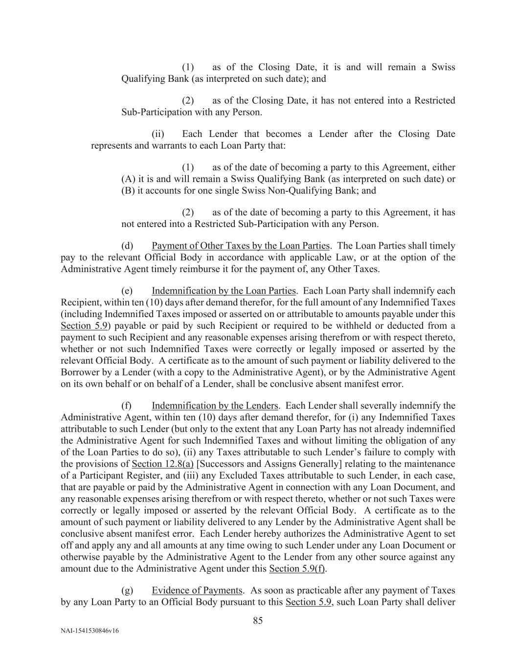 NAI-1541530846v16 85 (1) as of the Closing Date, it is and will remain a Swiss Qualifying Bank (as interpreted on such date); and (2) as of the Closing Date, it has not entered into a Restricted Sub-Participation with any Person. (ii) Each Lender that becomes a Lender after the Closing Date represents and warrants to each Loan Party that: (1) as of the date of becoming a party to this Agreement, either (A) it is and will remain a Swiss Qualifying Bank (as interpreted on such date) or (B) it accounts for one single Swiss Non-Qualifying Bank; and (2) as of the date of becoming a party to this Agreement, it has not entered into a Restricted Sub-Participation with any Person. (d) Payment of Other Taxes by the Loan Parties. The Loan Parties shall timely pay to the relevant Official Body in accordance with applicable Law, or at the option of the Administrative Agent timely reimburse it for the payment of, any Other Taxes. (e) Indemnification by the Loan Parties. Each Loan Party shall indemnify each Recipient, within ten (10) days after demand therefor, for the full amount of any Indemnified Taxes (including Indemnified Taxes imposed or asserted on or attributable to amounts payable under this Section 5.9) payable or paid by such Recipient or required to be withheld or deducted from a payment to such Recipient and any reasonable expenses arising therefrom or with respect thereto, whether or not such Indemnified Taxes were correctly or legally imposed or asserted by the relevant Official Body. A certificate as to the amount of such payment or liability delivered to the Borrower by a Lender (with a copy to the Administrative Agent), or by the Administrative Agent on its own behalf or on behalf of a Lender, shall be conclusive absent manifest error. (f) Indemnification by the Lenders. Each Lender shall severally indemnify the Administrative Agent, within ten (10) days after demand therefor, for (i) any Indemnified Taxes attributable to such Lender (but only to the extent that any Loan Party has not already indemnified the Administrative Agent for such Indemnified Taxes and without limiting the obligation of any of the Loan Parties to do so), (ii) any Taxes attributable to such Lender’s failure to comply with the provisions of Section 12.8(a) [Successors and Assigns Generally] relating to the maintenance of a Participant Register, and (iii) any Excluded Taxes attributable to such Lender, in each case, that are payable or paid by the Administrative Agent in connection with any Loan Document, and any reasonable expenses arising therefrom or with respect thereto, whether or not such Taxes were correctly or legally imposed or asserted by the relevant Official Body. A certificate as to the amount of such payment or liability delivered to any Lender by the Administrative Agent shall be conclusive absent manifest error. Each Lender hereby authorizes the Administrative Agent to set off and apply any and all amounts at any time owing to such Lender under any Loan Document or otherwise payable by the Administrative Agent to the Lender from any other source against any amount due to the Administrative Agent under this Section 5.9(f). (g) Evidence of Payments. As soon as practicable after any payment of Taxes by any Loan Party to an Official Body pursuant to this Section 5.9, such Loan Party shall deliver