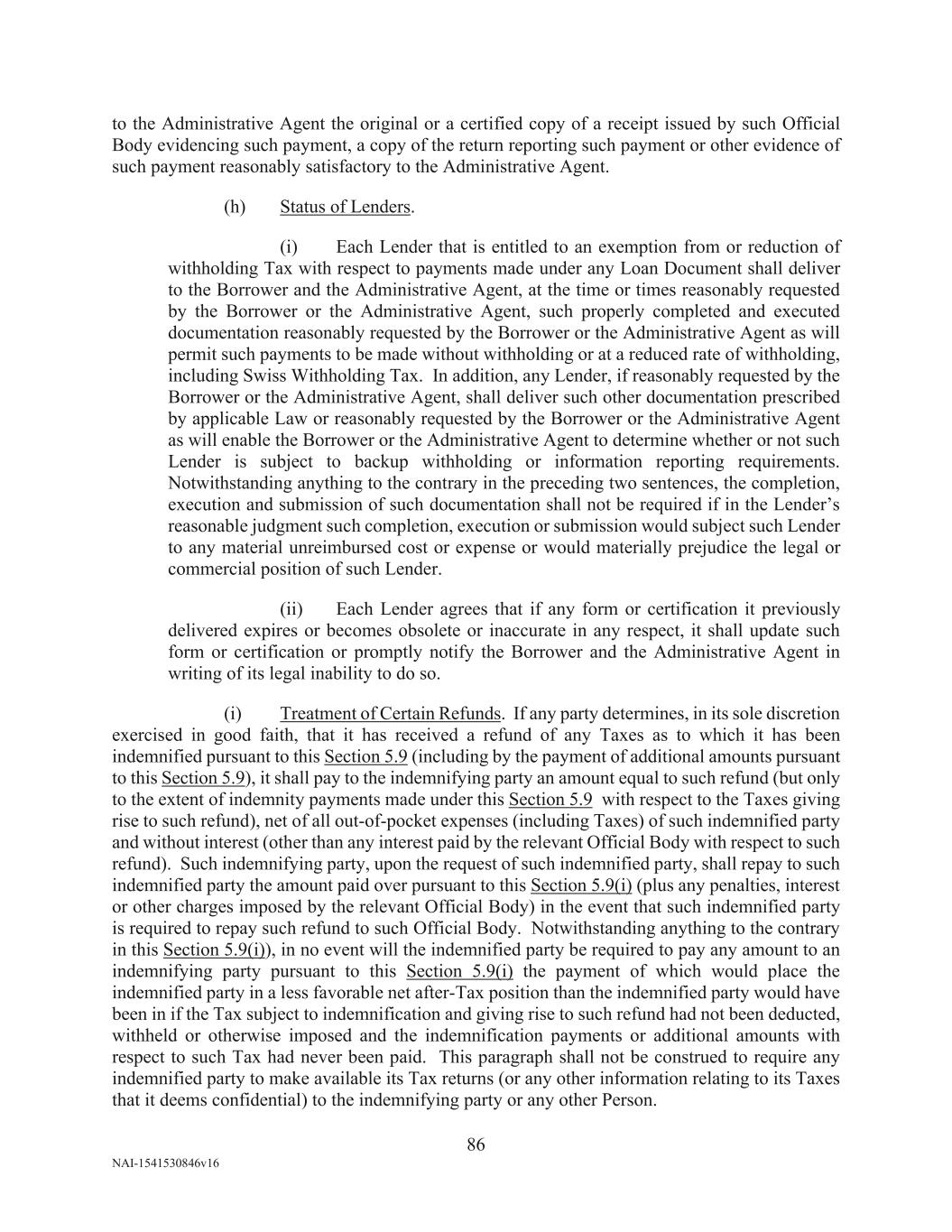 NAI-1541530846v16 86 to the Administrative Agent the original or a certified copy of a receipt issued by such Official Body evidencing such payment, a copy of the return reporting such payment or other evidence of such payment reasonably satisfactory to the Administrative Agent. (h) Status of Lenders. (i) Each Lender that is entitled to an exemption from or reduction of withholding Tax with respect to payments made under any Loan Document shall deliver to the Borrower and the Administrative Agent, at the time or times reasonably requested by the Borrower or the Administrative Agent, such properly completed and executed documentation reasonably requested by the Borrower or the Administrative Agent as will permit such payments to be made without withholding or at a reduced rate of withholding, including Swiss Withholding Tax. In addition, any Lender, if reasonably requested by the Borrower or the Administrative Agent, shall deliver such other documentation prescribed by applicable Law or reasonably requested by the Borrower or the Administrative Agent as will enable the Borrower or the Administrative Agent to determine whether or not such Lender is subject to backup withholding or information reporting requirements. Notwithstanding anything to the contrary in the preceding two sentences, the completion, execution and submission of such documentation shall not be required if in the Lender’s reasonable judgment such completion, execution or submission would subject such Lender to any material unreimbursed cost or expense or would materially prejudice the legal or commercial position of such Lender. (ii) Each Lender agrees that if any form or certification it previously delivered expires or becomes obsolete or inaccurate in any respect, it shall update such form or certification or promptly notify the Borrower and the Administrative Agent in writing of its legal inability to do so. (i) Treatment of Certain Refunds. If any party determines, in its sole discretion exercised in good faith, that it has received a refund of any Taxes as to which it has been indemnified pursuant to this Section 5.9 (including by the payment of additional amounts pursuant to this Section 5.9), it shall pay to the indemnifying party an amount equal to such refund (but only to the extent of indemnity payments made under this Section 5.9 with respect to the Taxes giving rise to such refund), net of all out-of-pocket expenses (including Taxes) of such indemnified party and without interest (other than any interest paid by the relevant Official Body with respect to such refund). Such indemnifying party, upon the request of such indemnified party, shall repay to such indemnified party the amount paid over pursuant to this Section 5.9(i) (plus any penalties, interest or other charges imposed by the relevant Official Body) in the event that such indemnified party is required to repay such refund to such Official Body. Notwithstanding anything to the contrary in this Section 5.9(i)), in no event will the indemnified party be required to pay any amount to an indemnifying party pursuant to this Section 5.9(i) the payment of which would place the indemnified party in a less favorable net after-Tax position than the indemnified party would have been in if the Tax subject to indemnification and giving rise to such refund had not been deducted, withheld or otherwise imposed and the indemnification payments or additional amounts with respect to such Tax had never been paid. This paragraph shall not be construed to require any indemnified party to make available its Tax returns (or any other information relating to its Taxes that it deems confidential) to the indemnifying party or any other Person.