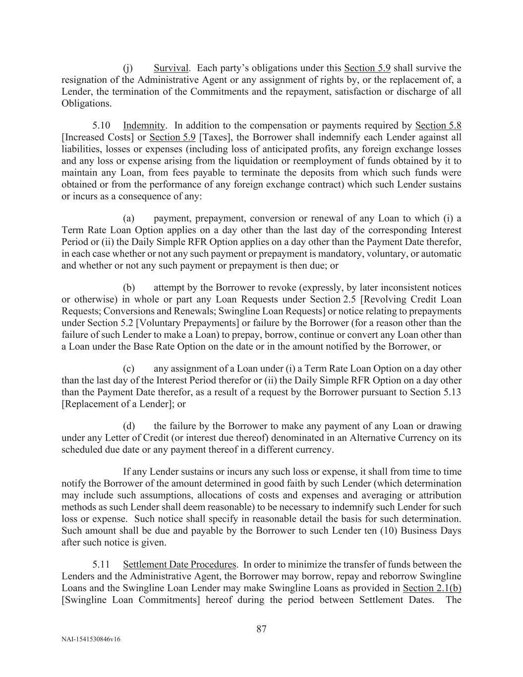NAI-1541530846v16 87 (j) Survival. Each party’s obligations under this Section 5.9 shall survive the resignation of the Administrative Agent or any assignment of rights by, or the replacement of, a Lender, the termination of the Commitments and the repayment, satisfaction or discharge of all Obligations. 5.10 Indemnity. In addition to the compensation or payments required by Section 5.8 [Increased Costs] or Section 5.9 [Taxes], the Borrower shall indemnify each Lender against all liabilities, losses or expenses (including loss of anticipated profits, any foreign exchange losses and any loss or expense arising from the liquidation or reemployment of funds obtained by it to maintain any Loan, from fees payable to terminate the deposits from which such funds were obtained or from the performance of any foreign exchange contract) which such Lender sustains or incurs as a consequence of any: (a) payment, prepayment, conversion or renewal of any Loan to which (i) a Term Rate Loan Option applies on a day other than the last day of the corresponding Interest Period or (ii) the Daily Simple RFR Option applies on a day other than the Payment Date therefor, in each case whether or not any such payment or prepayment is mandatory, voluntary, or automatic and whether or not any such payment or prepayment is then due; or (b) attempt by the Borrower to revoke (expressly, by later inconsistent notices or otherwise) in whole or part any Loan Requests under Section 2.5 [Revolving Credit Loan Requests; Conversions and Renewals; Swingline Loan Requests] or notice relating to prepayments under Section 5.2 [Voluntary Prepayments] or failure by the Borrower (for a reason other than the failure of such Lender to make a Loan) to prepay, borrow, continue or convert any Loan other than a Loan under the Base Rate Option on the date or in the amount notified by the Borrower, or (c) any assignment of a Loan under (i) a Term Rate Loan Option on a day other than the last day of the Interest Period therefor or (ii) the Daily Simple RFR Option on a day other than the Payment Date therefor, as a result of a request by the Borrower pursuant to Section 5.13 [Replacement of a Lender]; or (d) the failure by the Borrower to make any payment of any Loan or drawing under any Letter of Credit (or interest due thereof) denominated in an Alternative Currency on its scheduled due date or any payment thereof in a different currency. If any Lender sustains or incurs any such loss or expense, it shall from time to time notify the Borrower of the amount determined in good faith by such Lender (which determination may include such assumptions, allocations of costs and expenses and averaging or attribution methods as such Lender shall deem reasonable) to be necessary to indemnify such Lender for such loss or expense. Such notice shall specify in reasonable detail the basis for such determination. Such amount shall be due and payable by the Borrower to such Lender ten (10) Business Days after such notice is given. 5.11 Settlement Date Procedures. In order to minimize the transfer of funds between the Lenders and the Administrative Agent, the Borrower may borrow, repay and reborrow Swingline Loans and the Swingline Loan Lender may make Swingline Loans as provided in Section 2.1(b) [Swingline Loan Commitments] hereof during the period between Settlement Dates. The