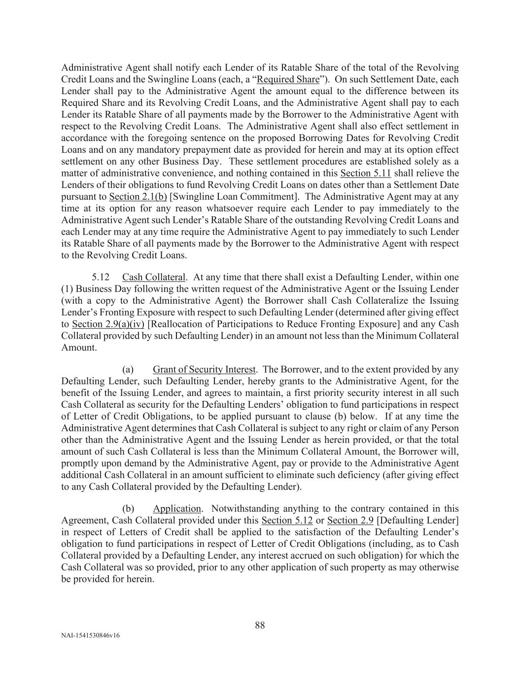 NAI-1541530846v16 88 Administrative Agent shall notify each Lender of its Ratable Share of the total of the Revolving Credit Loans and the Swingline Loans (each, a “Required Share”). On such Settlement Date, each Lender shall pay to the Administrative Agent the amount equal to the difference between its Required Share and its Revolving Credit Loans, and the Administrative Agent shall pay to each Lender its Ratable Share of all payments made by the Borrower to the Administrative Agent with respect to the Revolving Credit Loans. The Administrative Agent shall also effect settlement in accordance with the foregoing sentence on the proposed Borrowing Dates for Revolving Credit Loans and on any mandatory prepayment date as provided for herein and may at its option effect settlement on any other Business Day. These settlement procedures are established solely as a matter of administrative convenience, and nothing contained in this Section 5.11 shall relieve the Lenders of their obligations to fund Revolving Credit Loans on dates other than a Settlement Date pursuant to Section 2.1(b) [Swingline Loan Commitment]. The Administrative Agent may at any time at its option for any reason whatsoever require each Lender to pay immediately to the Administrative Agent such Lender’s Ratable Share of the outstanding Revolving Credit Loans and each Lender may at any time require the Administrative Agent to pay immediately to such Lender its Ratable Share of all payments made by the Borrower to the Administrative Agent with respect to the Revolving Credit Loans. 5.12 Cash Collateral. At any time that there shall exist a Defaulting Lender, within one (1) Business Day following the written request of the Administrative Agent or the Issuing Lender (with a copy to the Administrative Agent) the Borrower shall Cash Collateralize the Issuing Lender’s Fronting Exposure with respect to such Defaulting Lender (determined after giving effect to Section 2.9(a)(iv) [Reallocation of Participations to Reduce Fronting Exposure] and any Cash Collateral provided by such Defaulting Lender) in an amount not less than the Minimum Collateral Amount. (a) Grant of Security Interest. The Borrower, and to the extent provided by any Defaulting Lender, such Defaulting Lender, hereby grants to the Administrative Agent, for the benefit of the Issuing Lender, and agrees to maintain, a first priority security interest in all such Cash Collateral as security for the Defaulting Lenders’ obligation to fund participations in respect of Letter of Credit Obligations, to be applied pursuant to clause (b) below. If at any time the Administrative Agent determines that Cash Collateral is subject to any right or claim of any Person other than the Administrative Agent and the Issuing Lender as herein provided, or that the total amount of such Cash Collateral is less than the Minimum Collateral Amount, the Borrower will, promptly upon demand by the Administrative Agent, pay or provide to the Administrative Agent additional Cash Collateral in an amount sufficient to eliminate such deficiency (after giving effect to any Cash Collateral provided by the Defaulting Lender). (b) Application. Notwithstanding anything to the contrary contained in this Agreement, Cash Collateral provided under this Section 5.12 or Section 2.9 [Defaulting Lender] in respect of Letters of Credit shall be applied to the satisfaction of the Defaulting Lender’s obligation to fund participations in respect of Letter of Credit Obligations (including, as to Cash Collateral provided by a Defaulting Lender, any interest accrued on such obligation) for which the Cash Collateral was so provided, prior to any other application of such property as may otherwise be provided for herein.