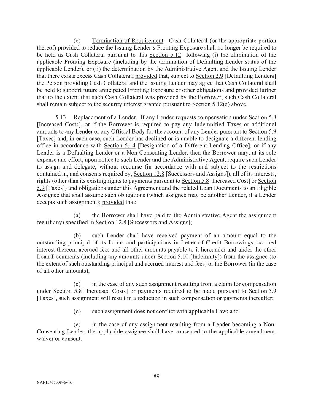 NAI-1541530846v16 89 (c) Termination of Requirement. Cash Collateral (or the appropriate portion thereof) provided to reduce the Issuing Lender’s Fronting Exposure shall no longer be required to be held as Cash Collateral pursuant to this Section 5.12 following (i) the elimination of the applicable Fronting Exposure (including by the termination of Defaulting Lender status of the applicable Lender), or (ii) the determination by the Administrative Agent and the Issuing Lender that there exists excess Cash Collateral; provided that, subject to Section 2.9 [Defaulting Lenders] the Person providing Cash Collateral and the Issuing Lender may agree that Cash Collateral shall be held to support future anticipated Fronting Exposure or other obligations and provided further that to the extent that such Cash Collateral was provided by the Borrower, such Cash Collateral shall remain subject to the security interest granted pursuant to Section 5.12(a) above. 5.13 Replacement of a Lender. If any Lender requests compensation under Section 5.8 [Increased Costs], or if the Borrower is required to pay any Indemnified Taxes or additional amounts to any Lender or any Official Body for the account of any Lender pursuant to Section 5.9 [Taxes] and, in each case, such Lender has declined or is unable to designate a different lending office in accordance with Section 5.14 [Designation of a Different Lending Office], or if any Lender is a Defaulting Lender or a Non-Consenting Lender, then the Borrower may, at its sole expense and effort, upon notice to such Lender and the Administrative Agent, require such Lender to assign and delegate, without recourse (in accordance with and subject to the restrictions contained in, and consents required by, Section 12.8 [Successors and Assigns]), all of its interests, rights (other than its existing rights to payments pursuant to Section 5.8 [Increased Cost] or Section 5.9 [Taxes]) and obligations under this Agreement and the related Loan Documents to an Eligible Assignee that shall assume such obligations (which assignee may be another Lender, if a Lender accepts such assignment); provided that: (a) the Borrower shall have paid to the Administrative Agent the assignment fee (if any) specified in Section 12.8 [Successors and Assigns]; (b) such Lender shall have received payment of an amount equal to the outstanding principal of its Loans and participations in Letter of Credit Borrowings, accrued interest thereon, accrued fees and all other amounts payable to it hereunder and under the other Loan Documents (including any amounts under Section 5.10 [Indemnity]) from the assignee (to the extent of such outstanding principal and accrued interest and fees) or the Borrower (in the case of all other amounts); (c) in the case of any such assignment resulting from a claim for compensation under Section 5.8 [Increased Costs] or payments required to be made pursuant to Section 5.9 [Taxes], such assignment will result in a reduction in such compensation or payments thereafter; (d) such assignment does not conflict with applicable Law; and (e) in the case of any assignment resulting from a Lender becoming a Non- Consenting Lender, the applicable assignee shall have consented to the applicable amendment, waiver or consent.